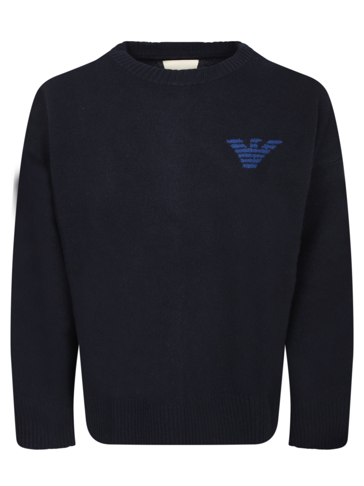 Long-sleeved blue wool sweater. Embroidered eagle logo on the chest. Crew neck.