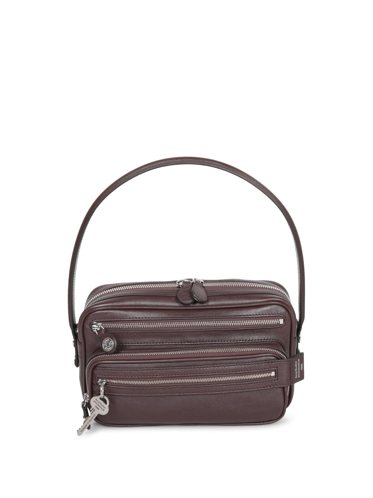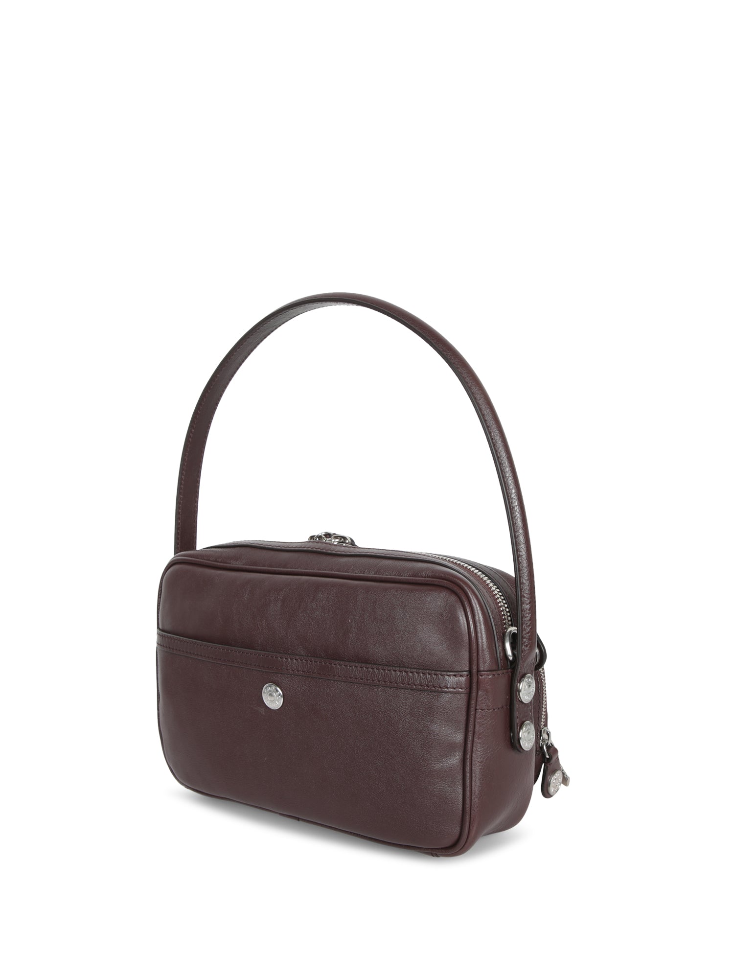 Leather structure. Multiple zippered pockets. Adjustable and removable shoulder strap.