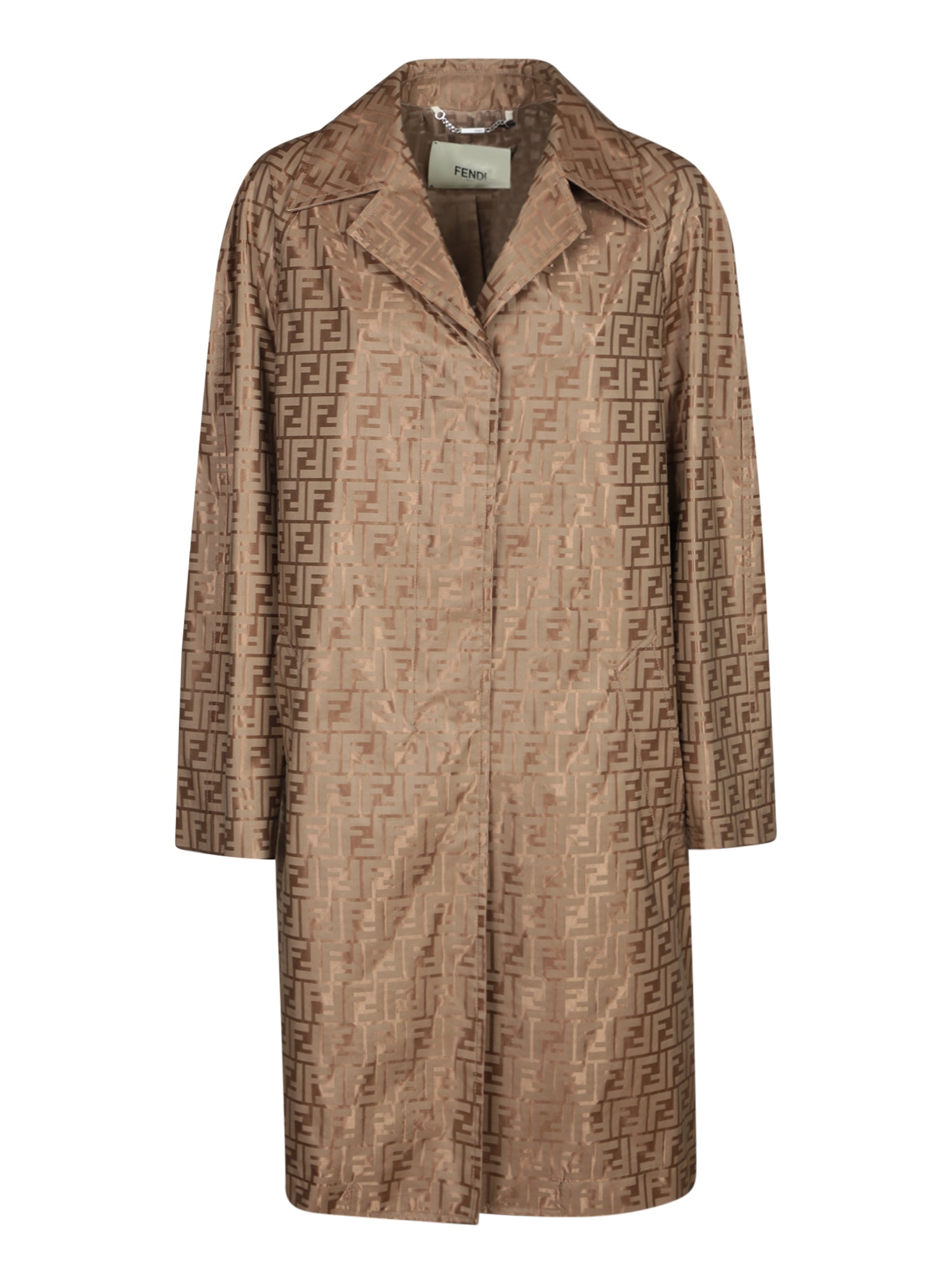 Long coat with all-over FF print. Classic collar, button closure, side pockets.