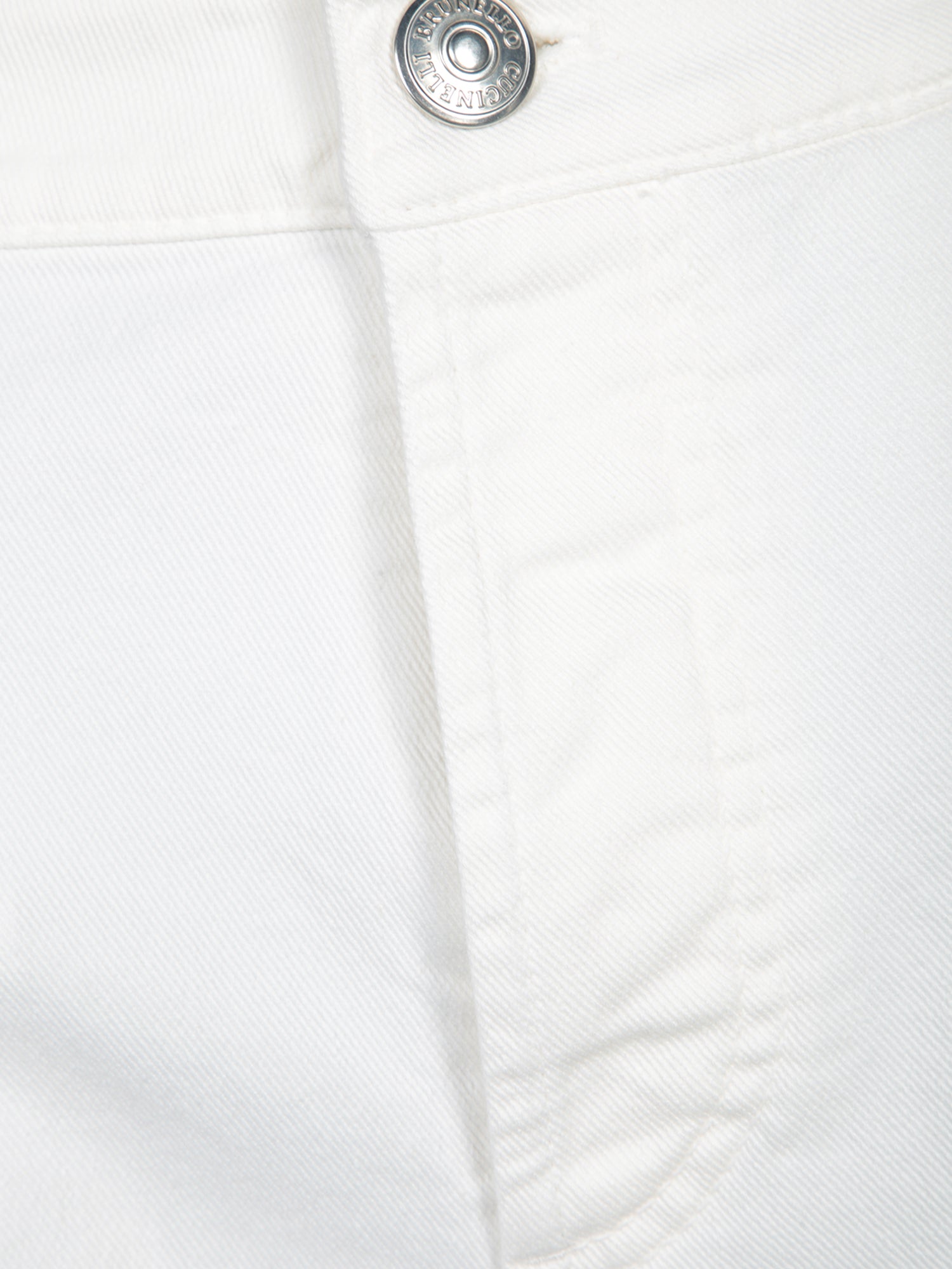 White bull cotton denim. Five-pocket design. Front zip and button closure.