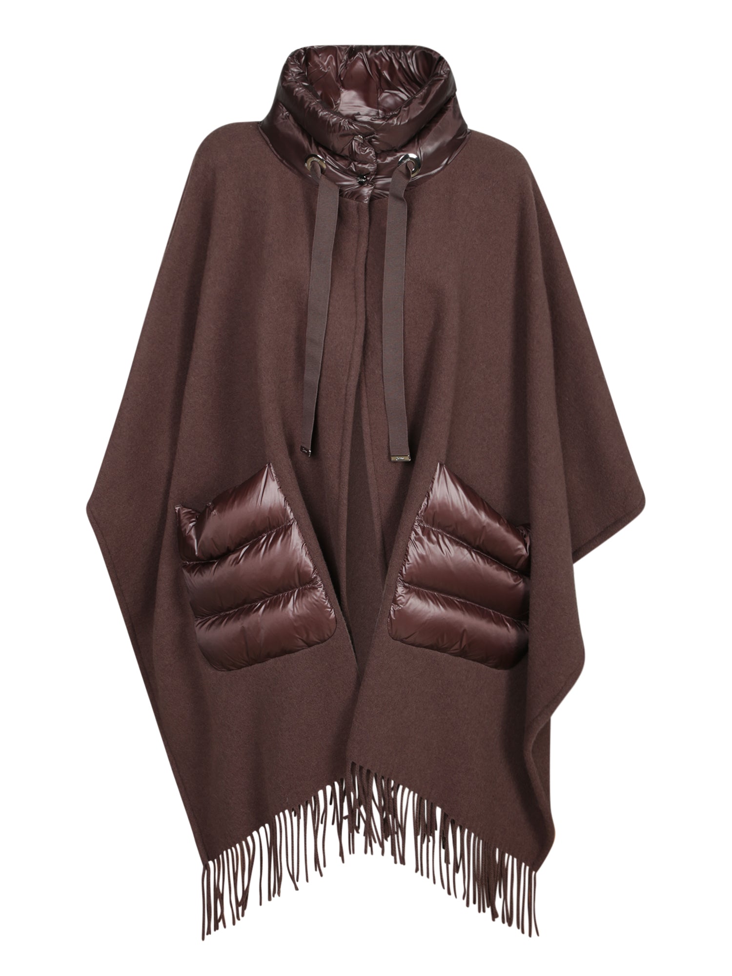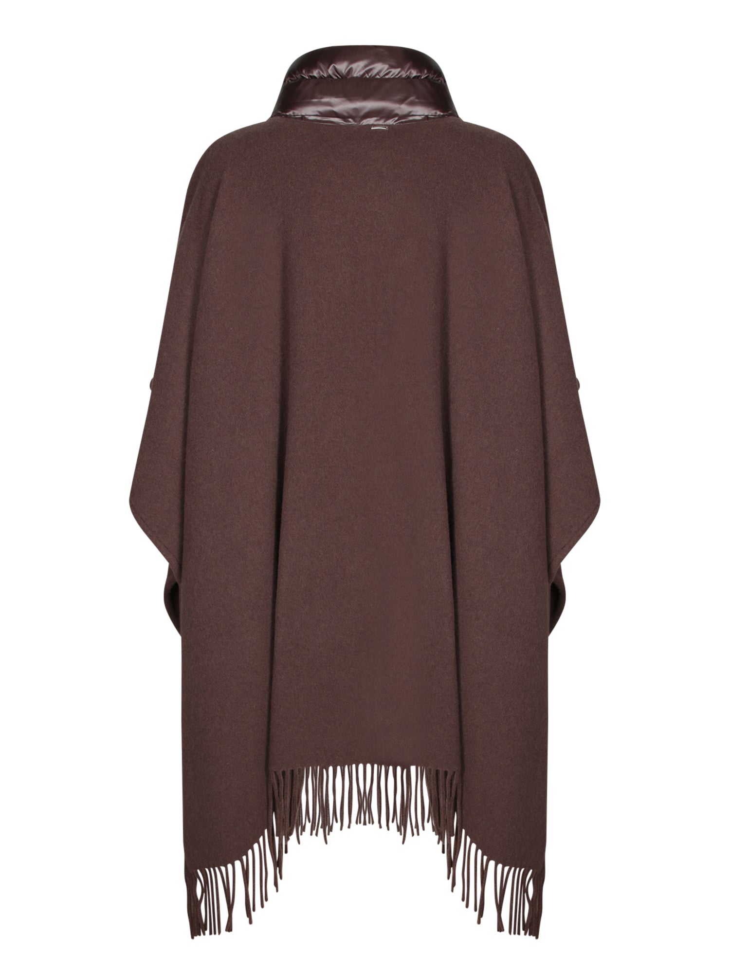 Poncho with adjustable hood, padded nylon inserts, fringed edges.