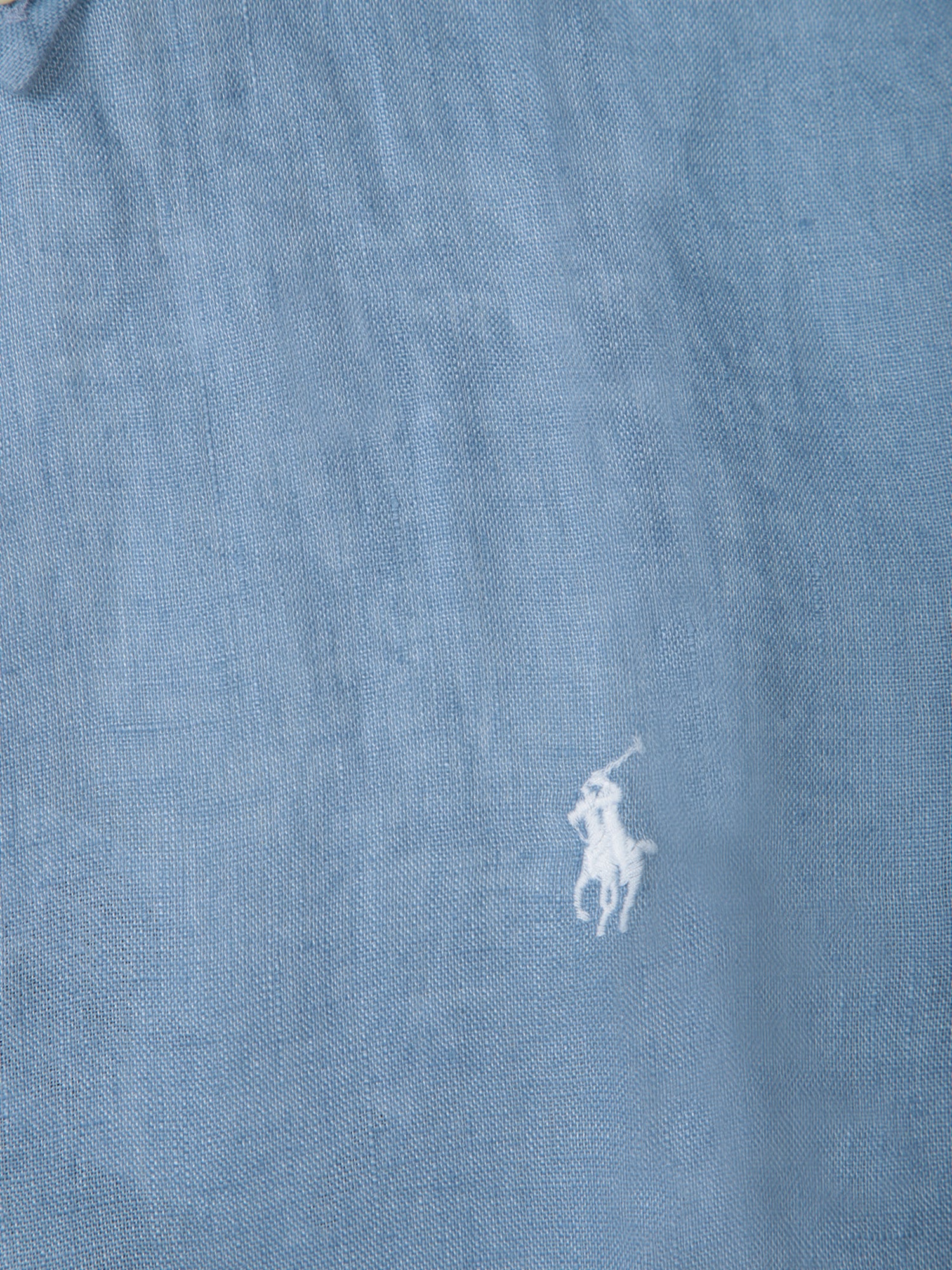 Long sleeve linen shirt. Button-down collar. Embroidered logo on the chest.