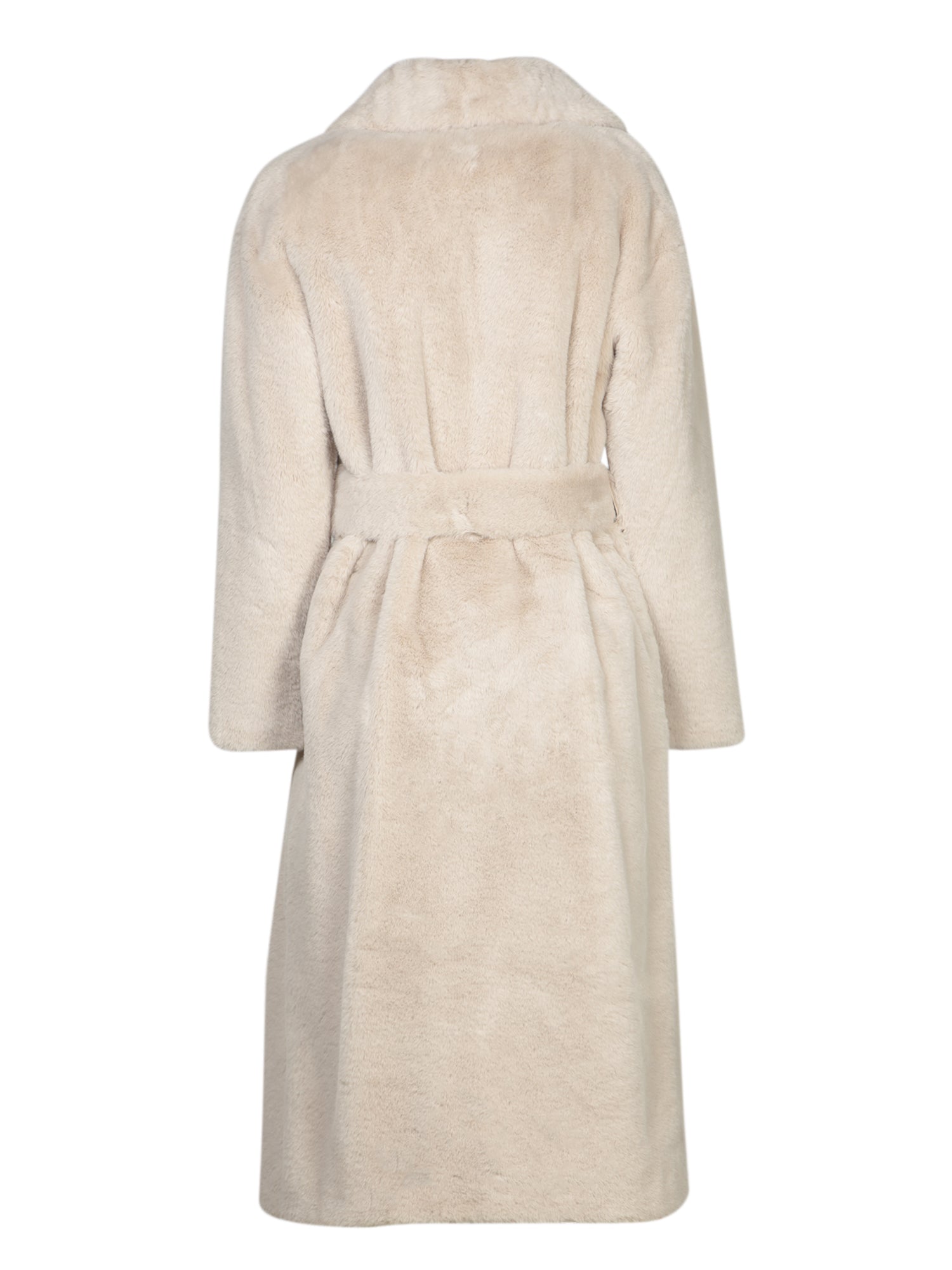 Long coat in synthetic fur. Wide lapel collar. Coordinated fabric belt.