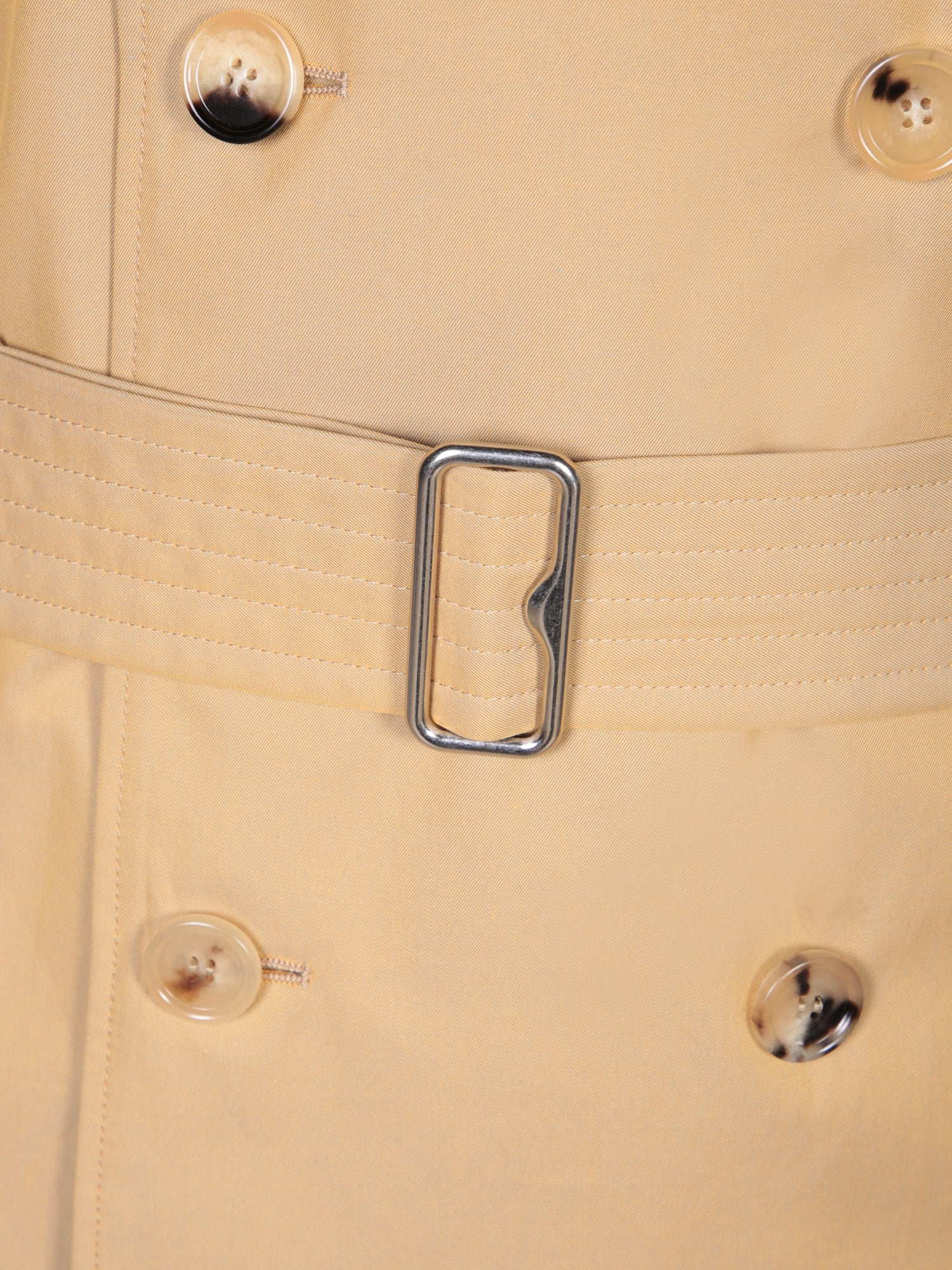 Trench coat with adjustable belt, double-breasted front closure, and belted cuffs.