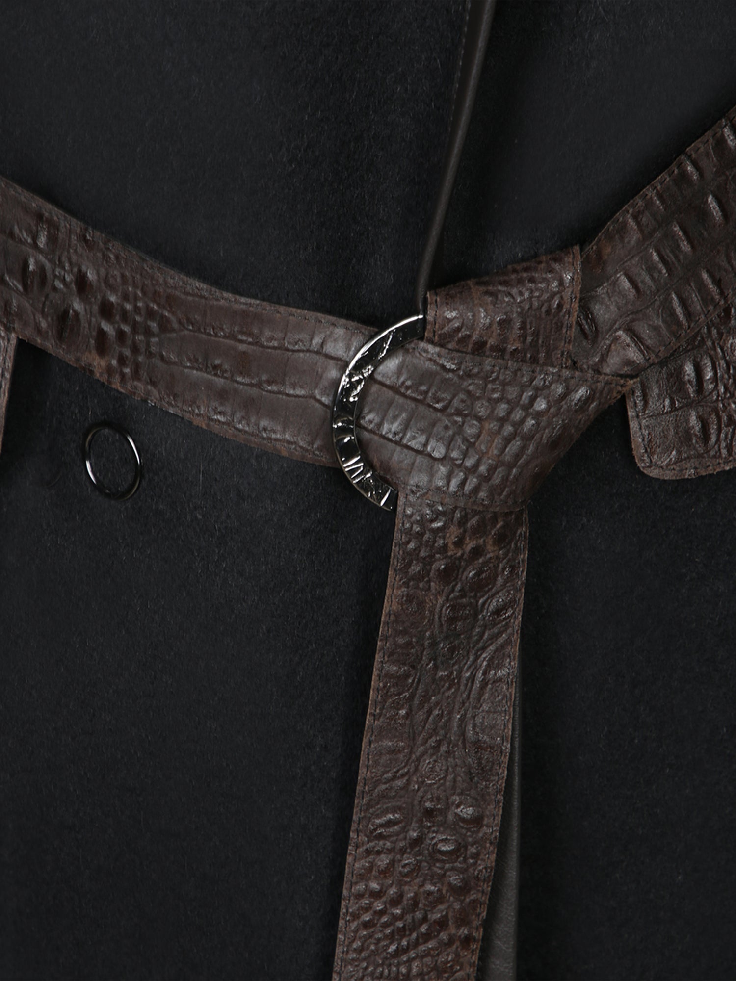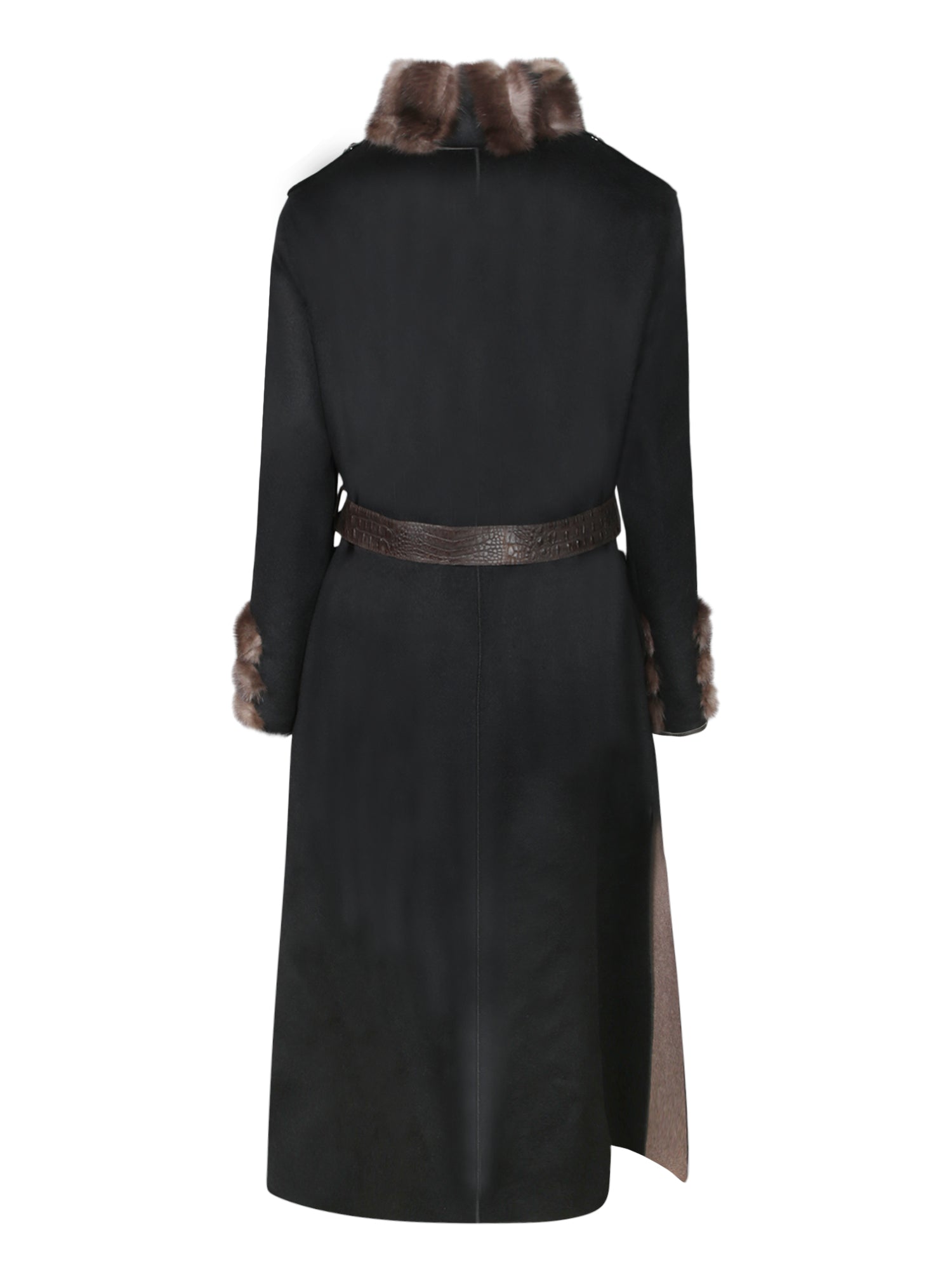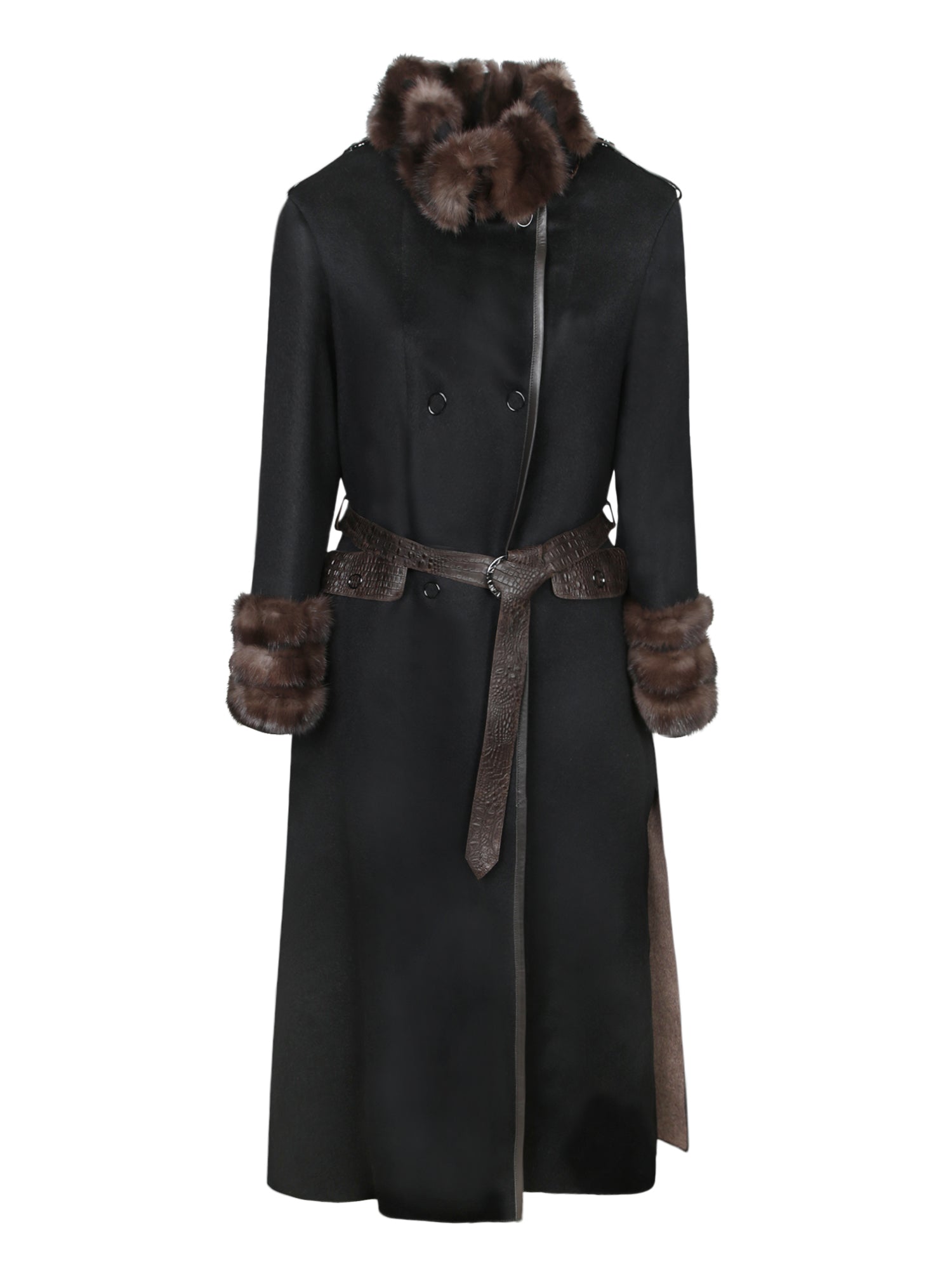 High-quality fabric coat, sable fur trim, matching belt. Double-breasted closure.