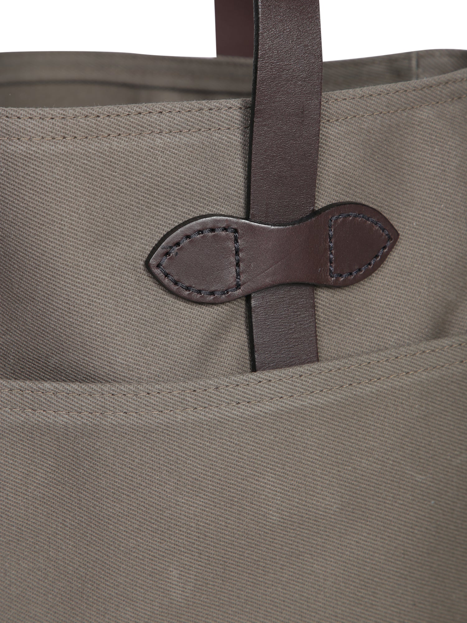 Brown leather handles. External pockets. Wide main opening.