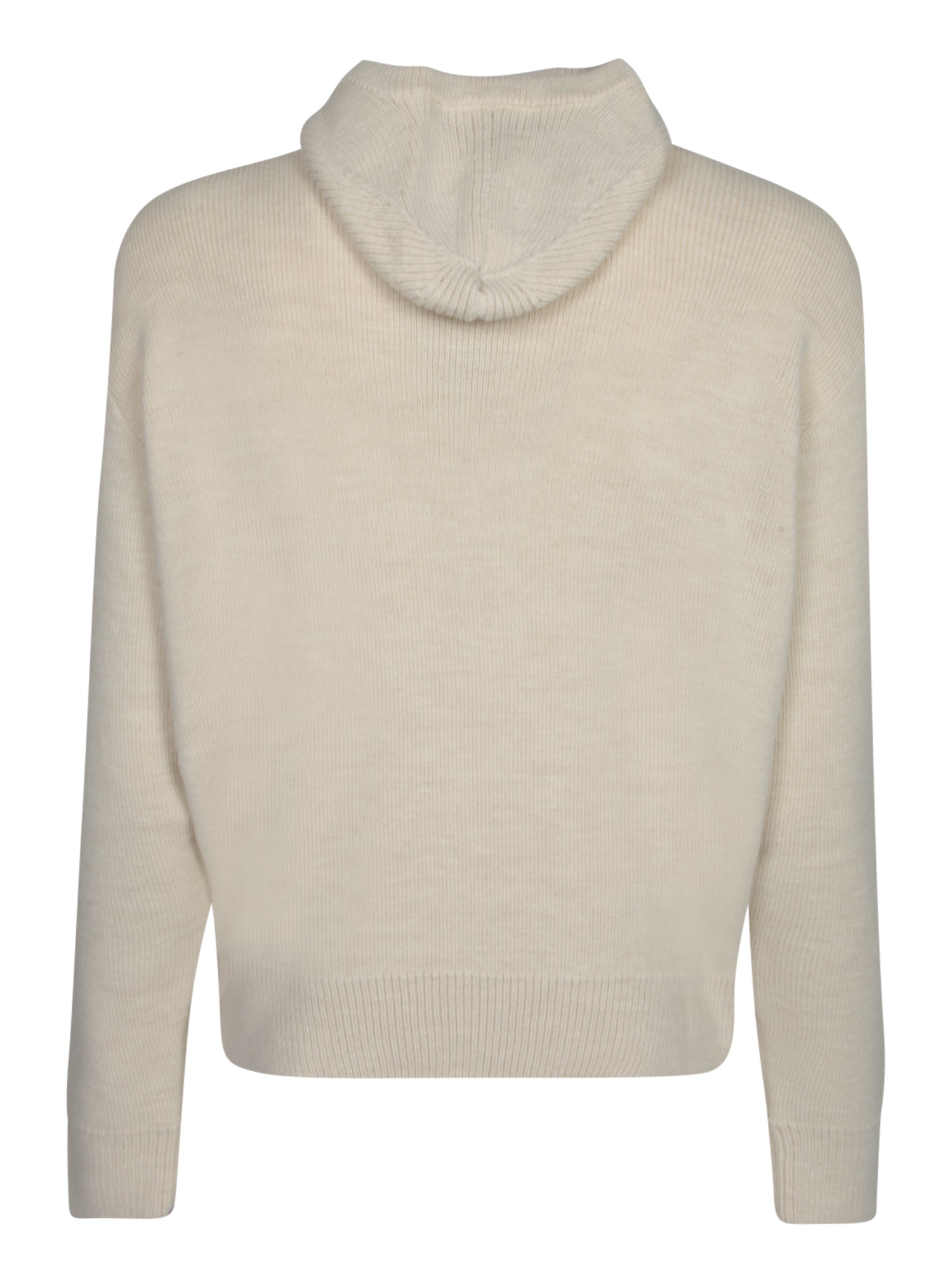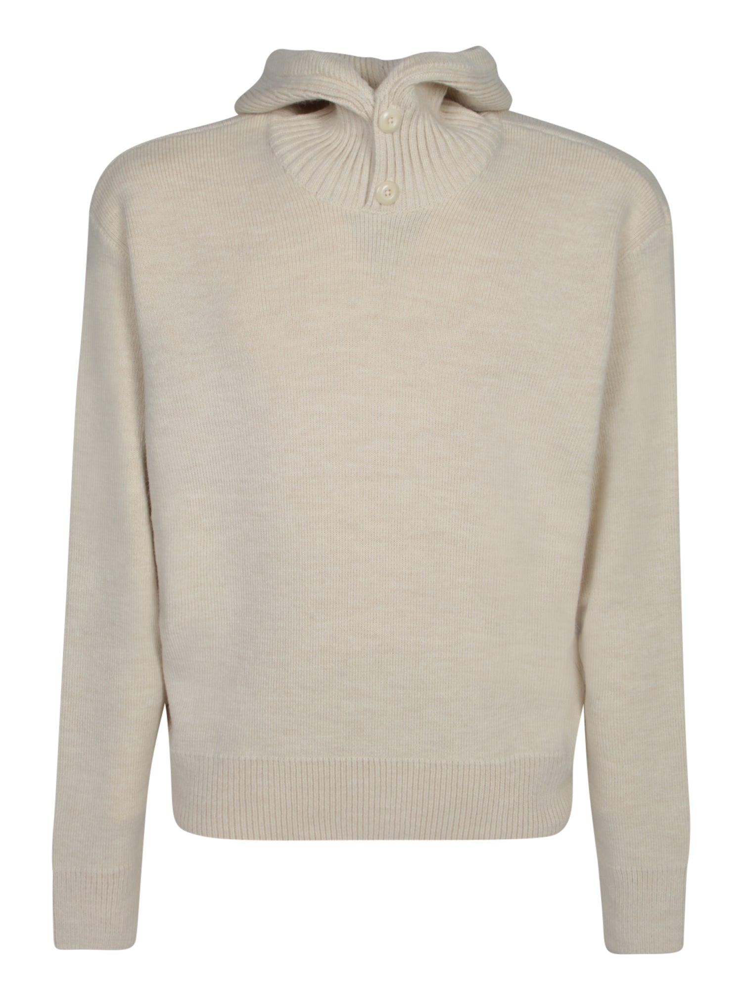 High shirt collar with button closure. Fine knit fabric in cream shade. Ribbed cuffs and hem.