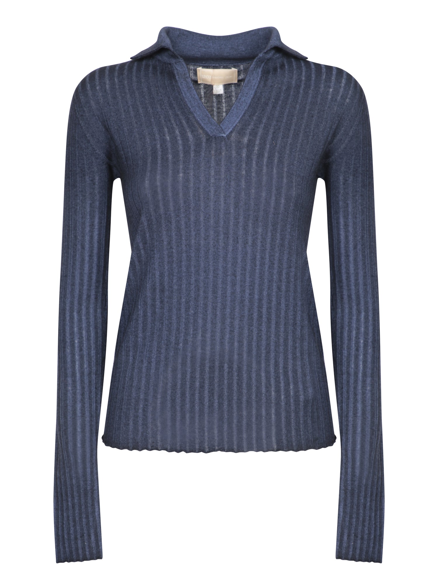Long sleeves, V-neck, ribbed design.
