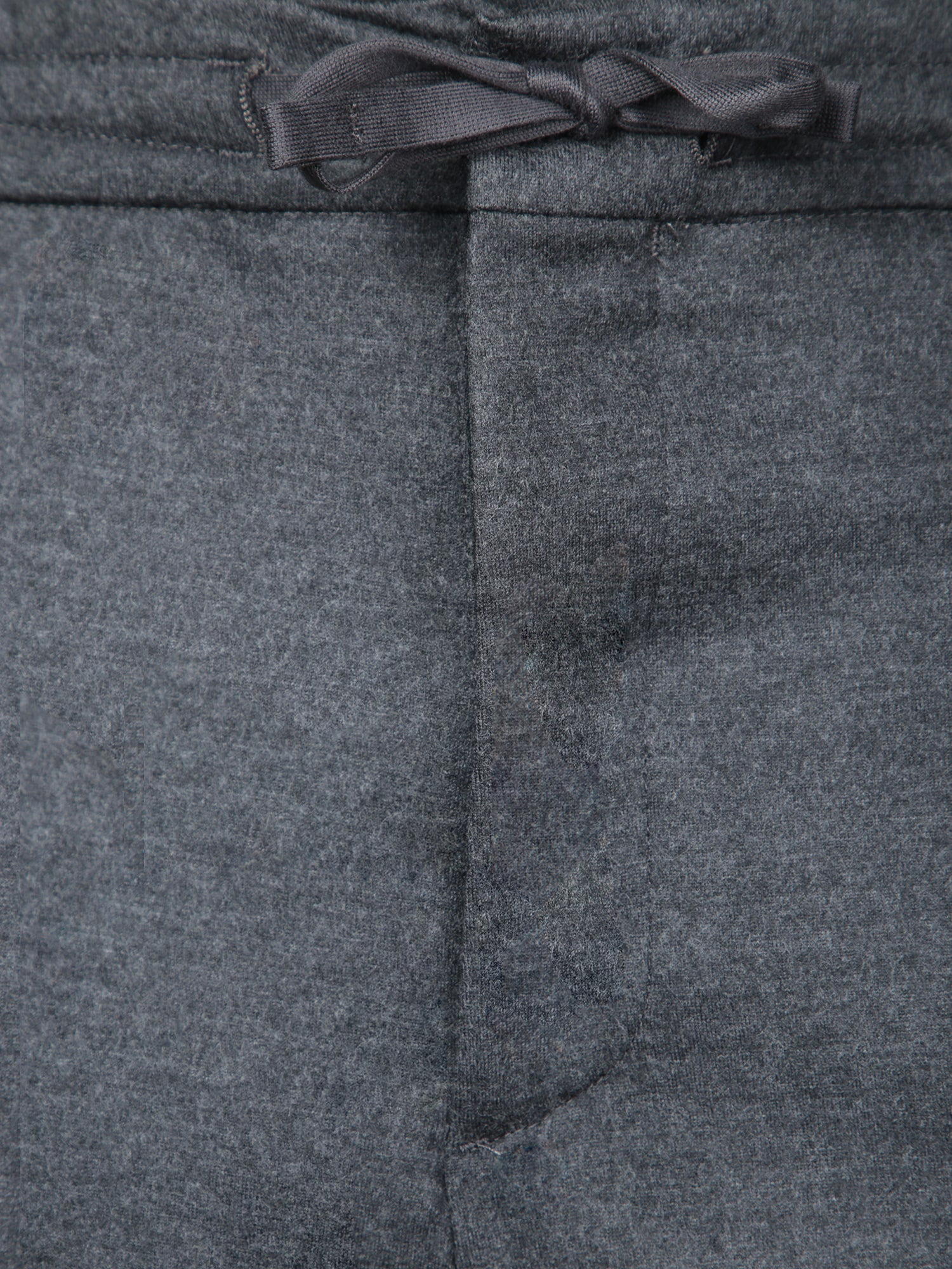 Dark grey flannel trousers. Front zip and button closure. Two side pockets and two back welt pockets.