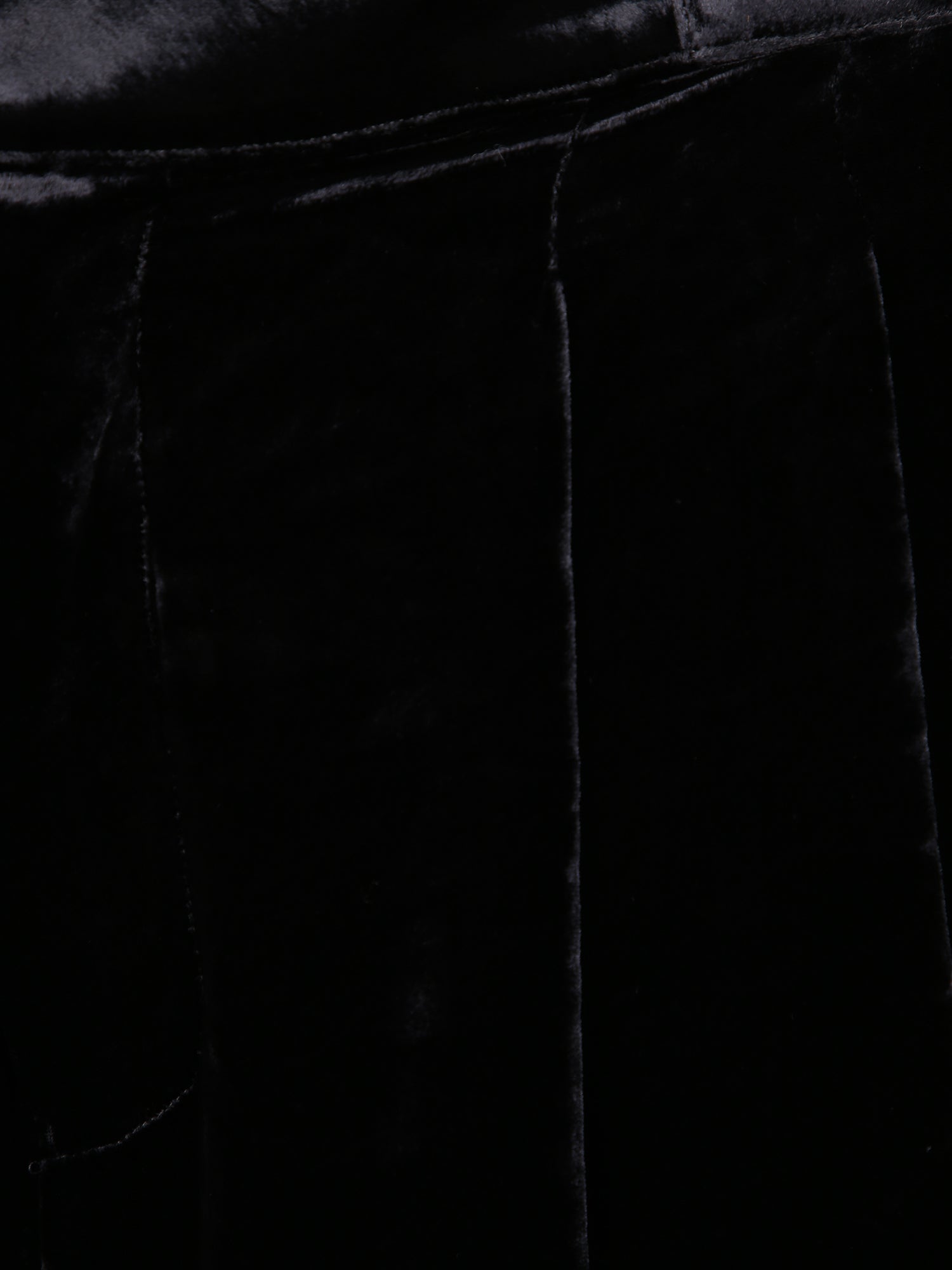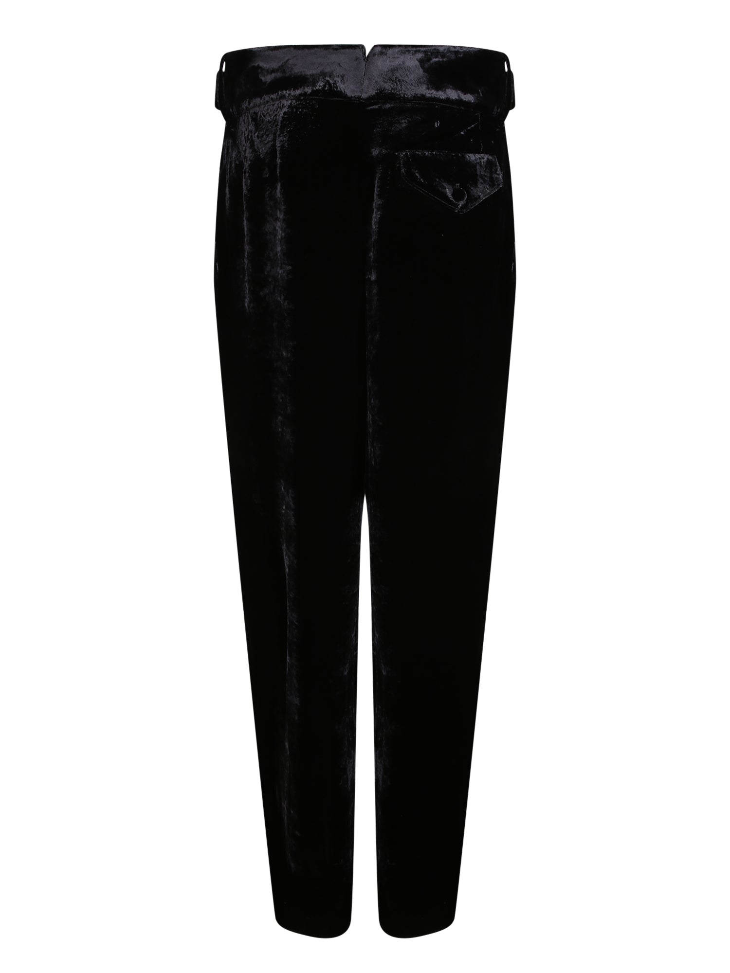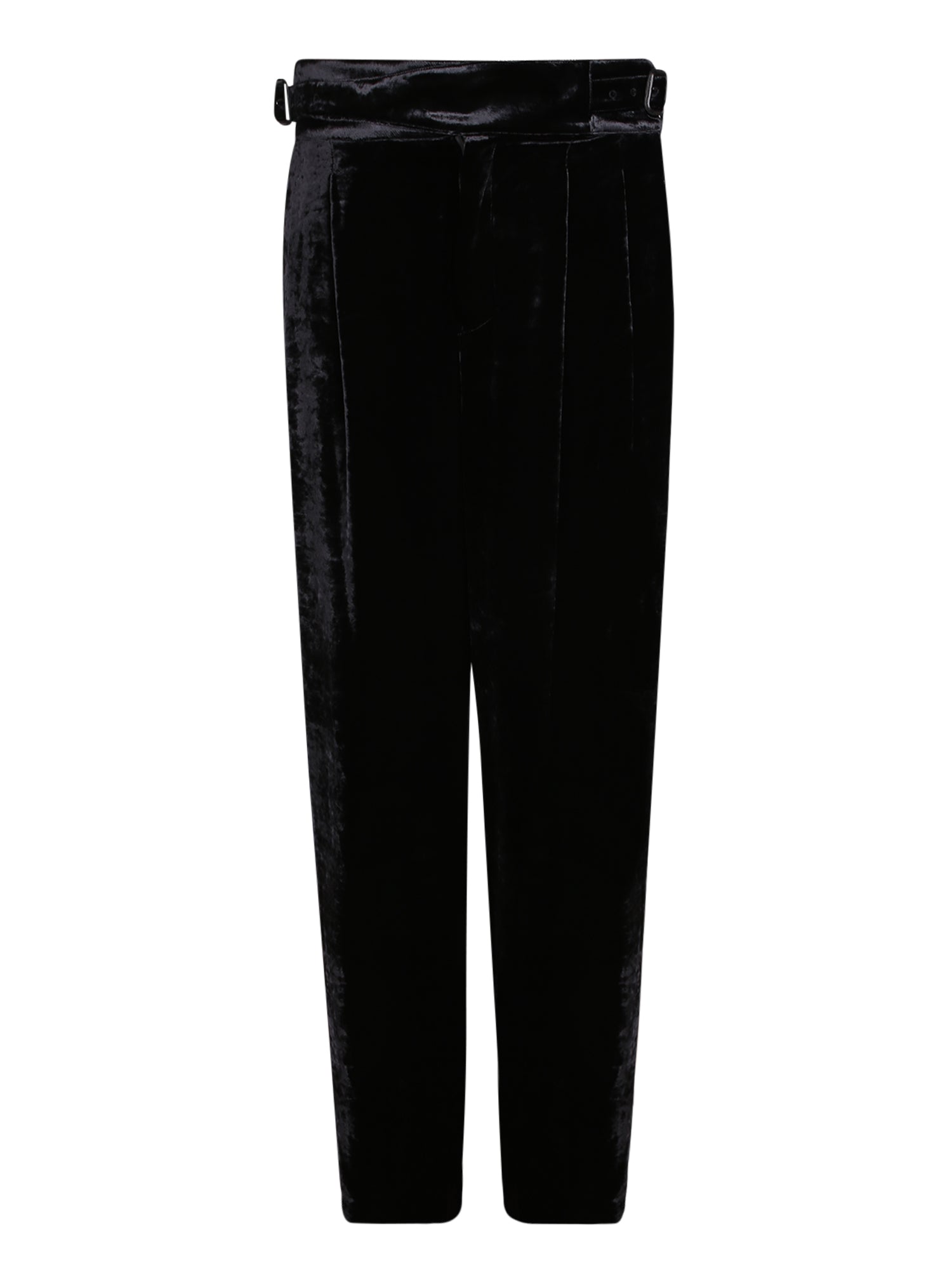 Adjustable velvet pants. Zip and button closure. Side and back pockets.