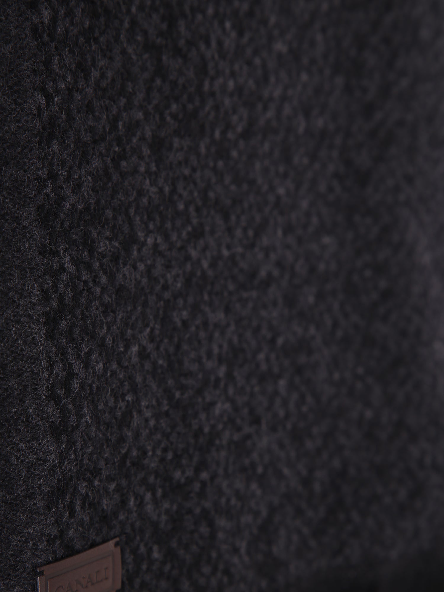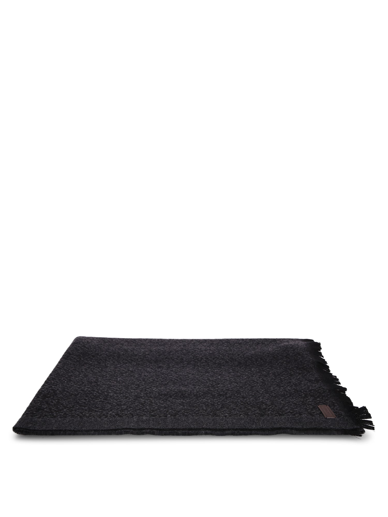 Thin and soft wool scarf, fringe detailing, in dark grey color.