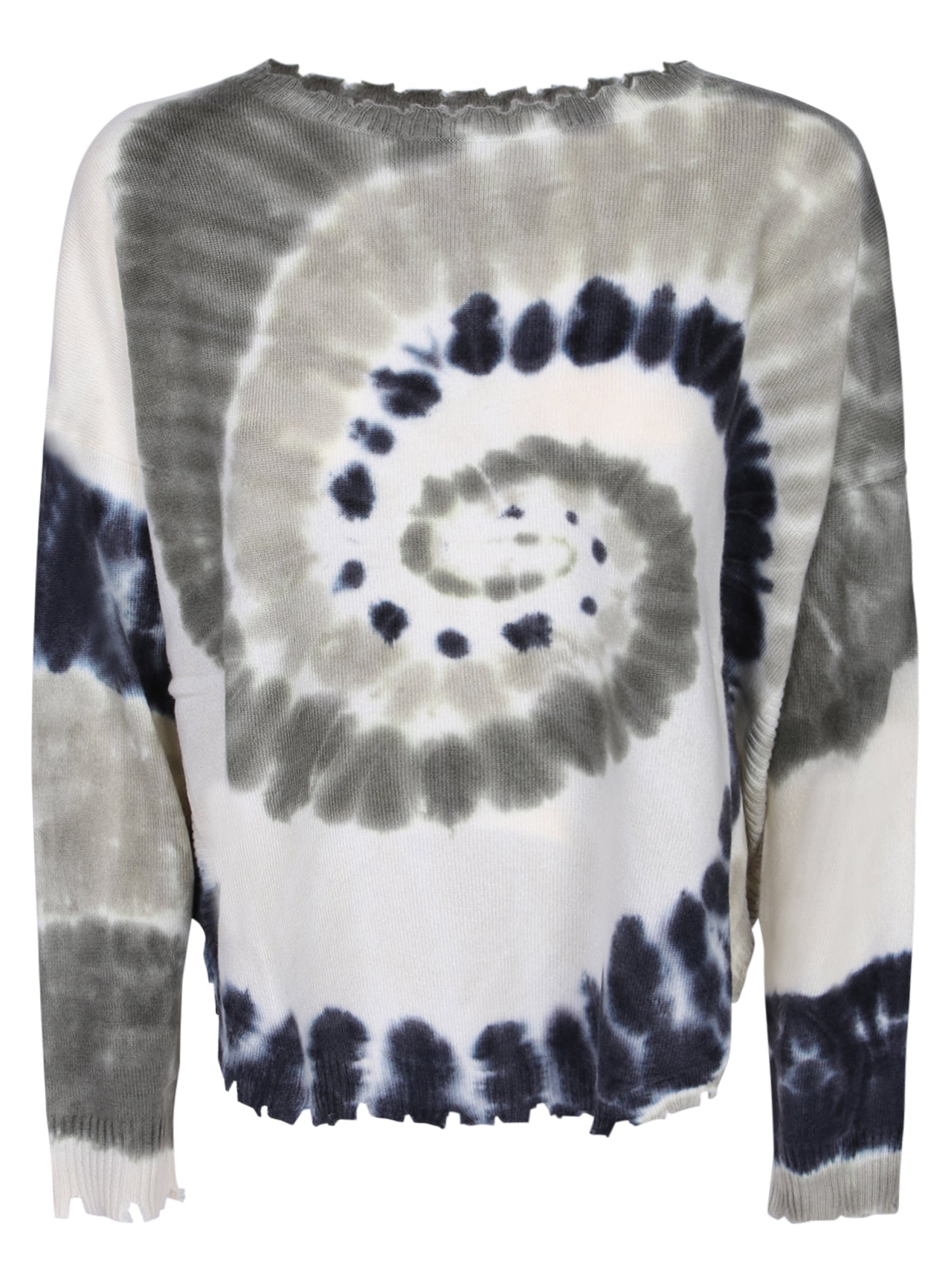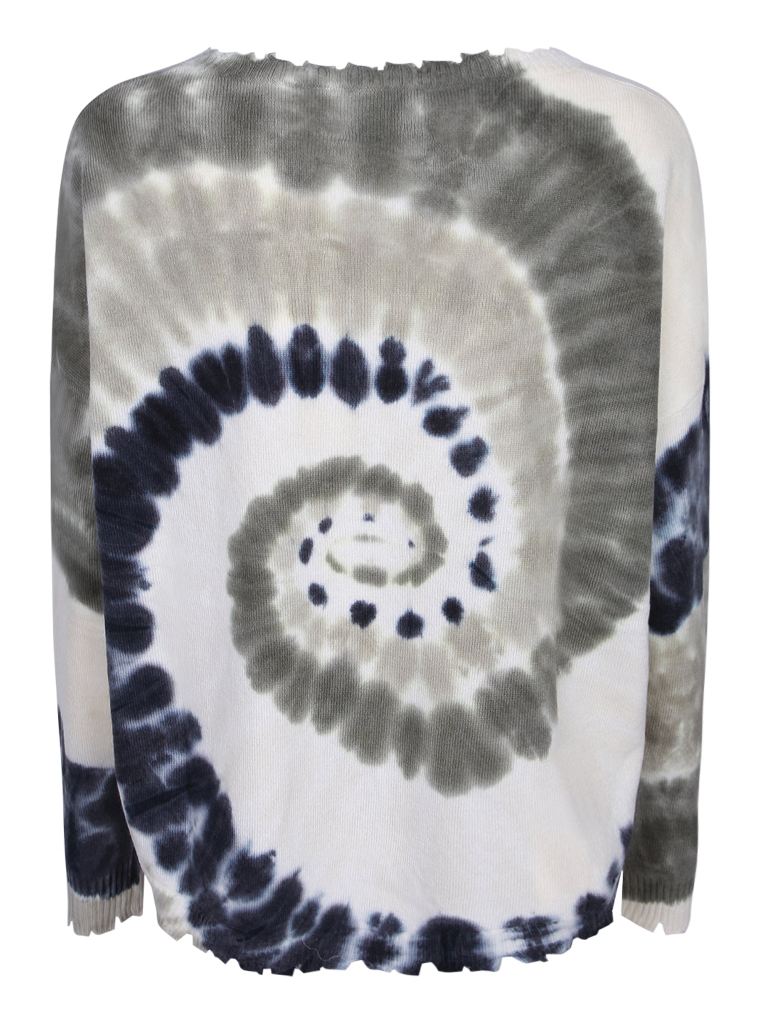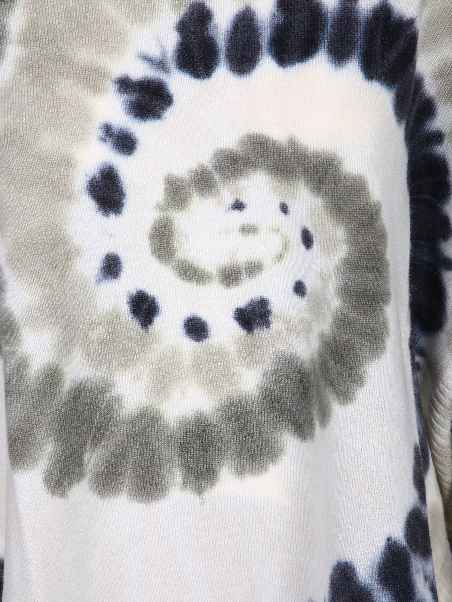Round neck sweater. Tie-dye design in dark khaki and white tones. Ribbed finishes.