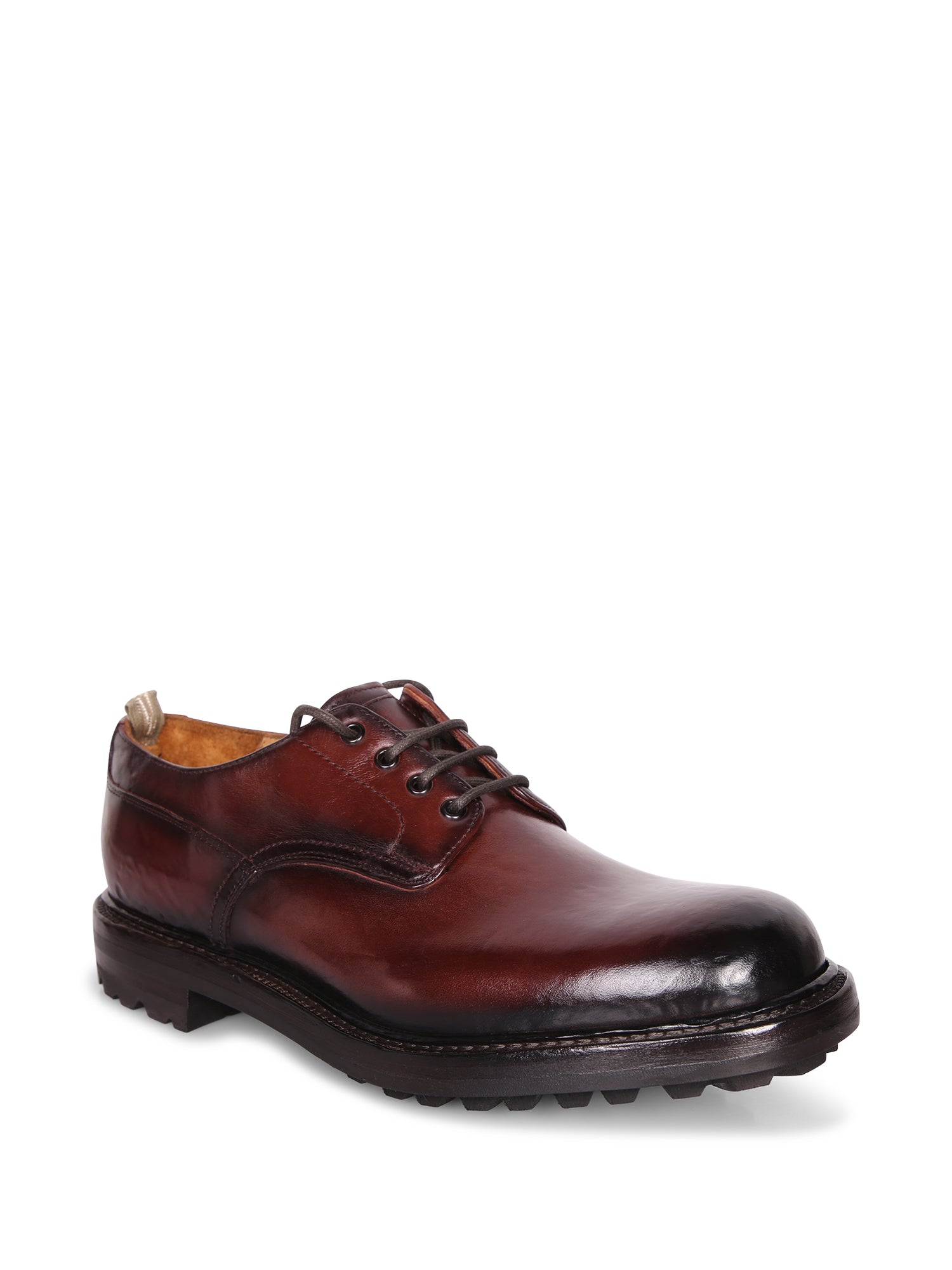 Glossy leather shoes with rounded toe, highlighted stitching, and serrated sole.