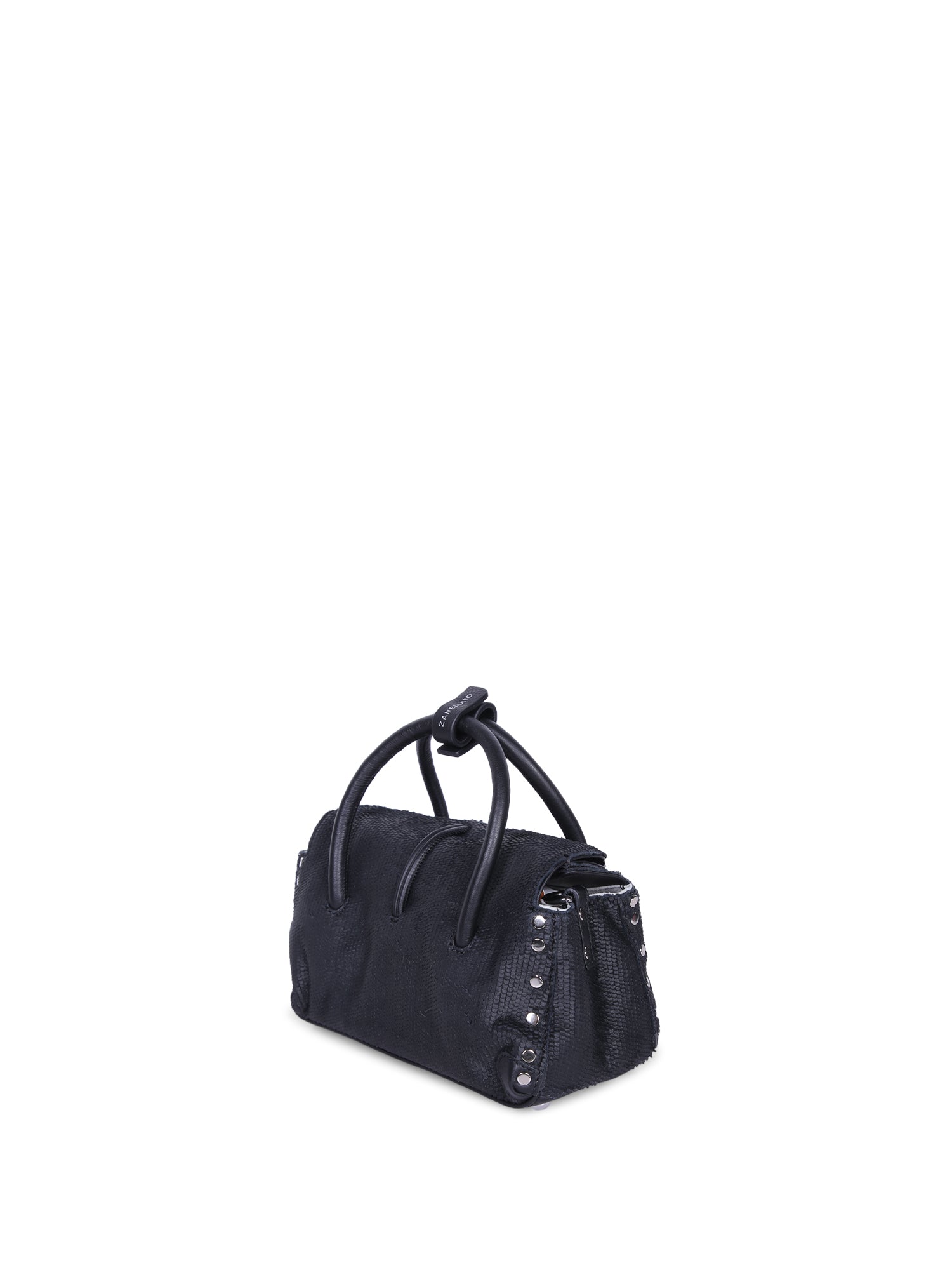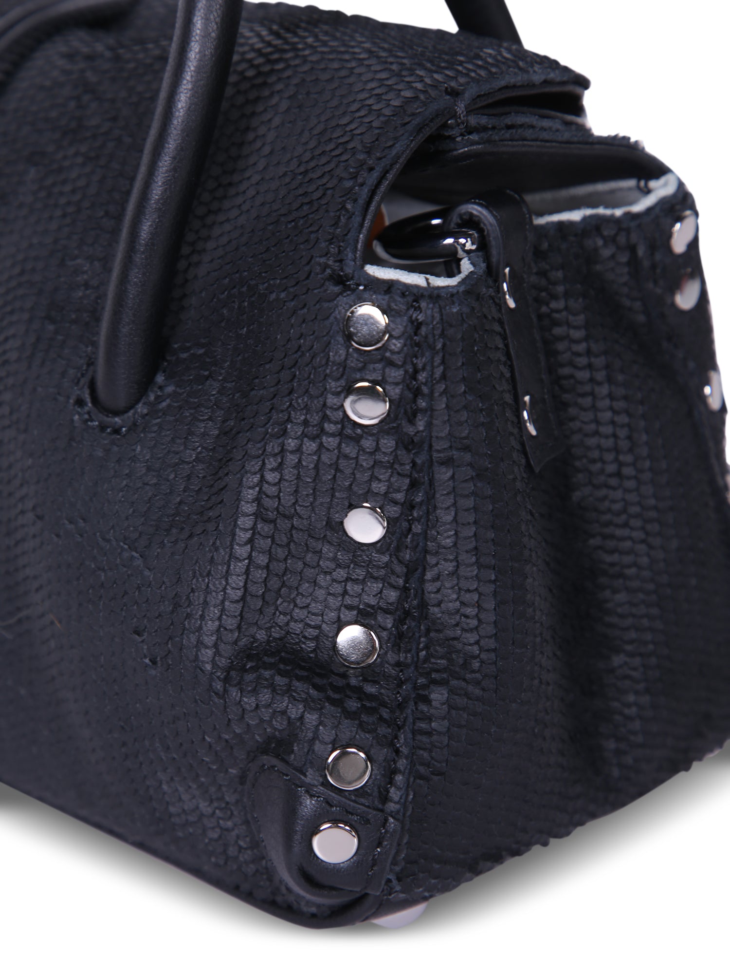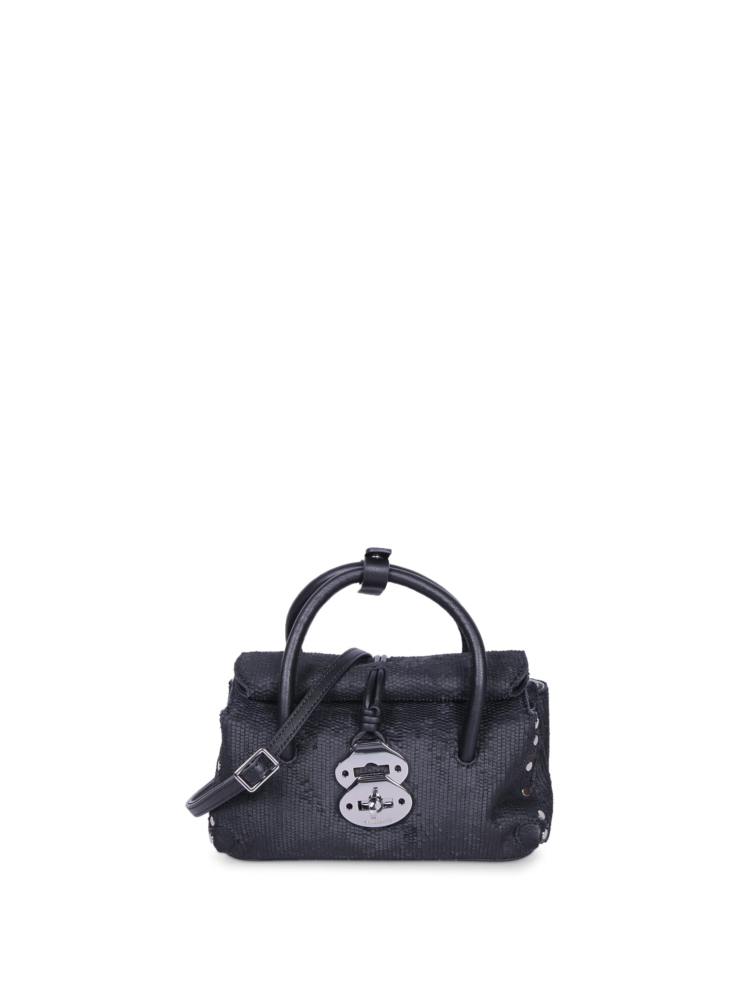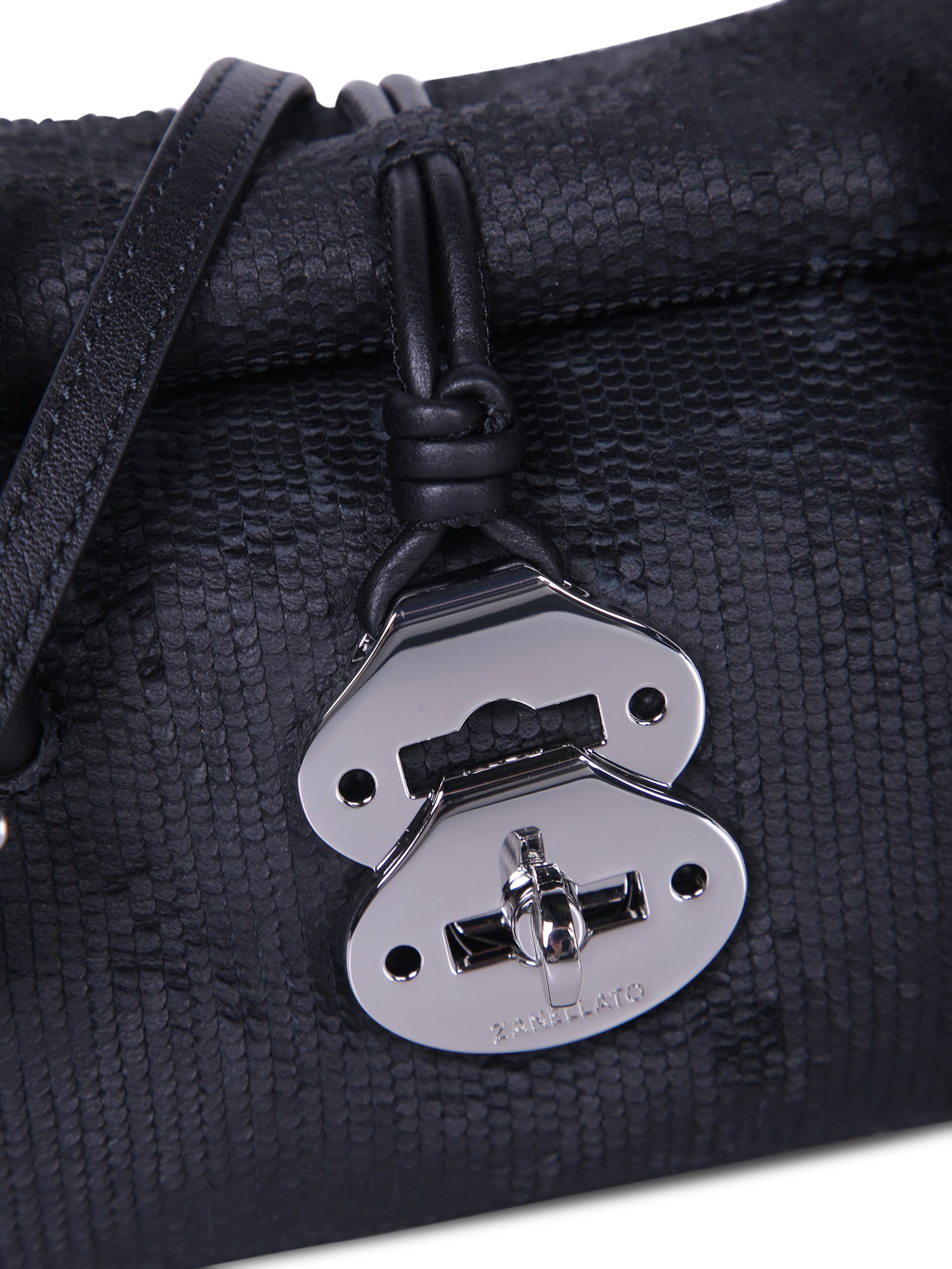 Fabric bag enhanced with leather details. Features lock closure, adjustable handles, and a removable shoulder strap.