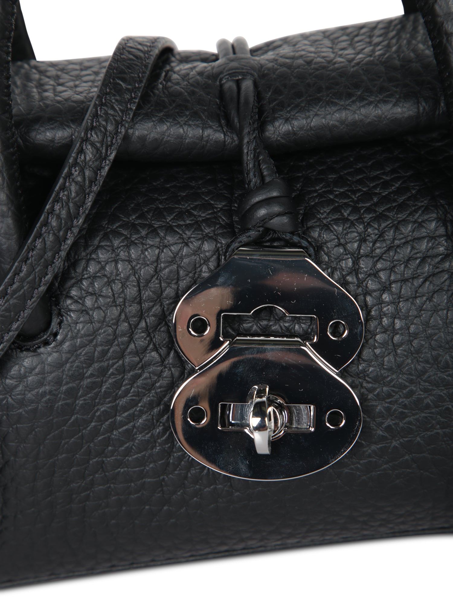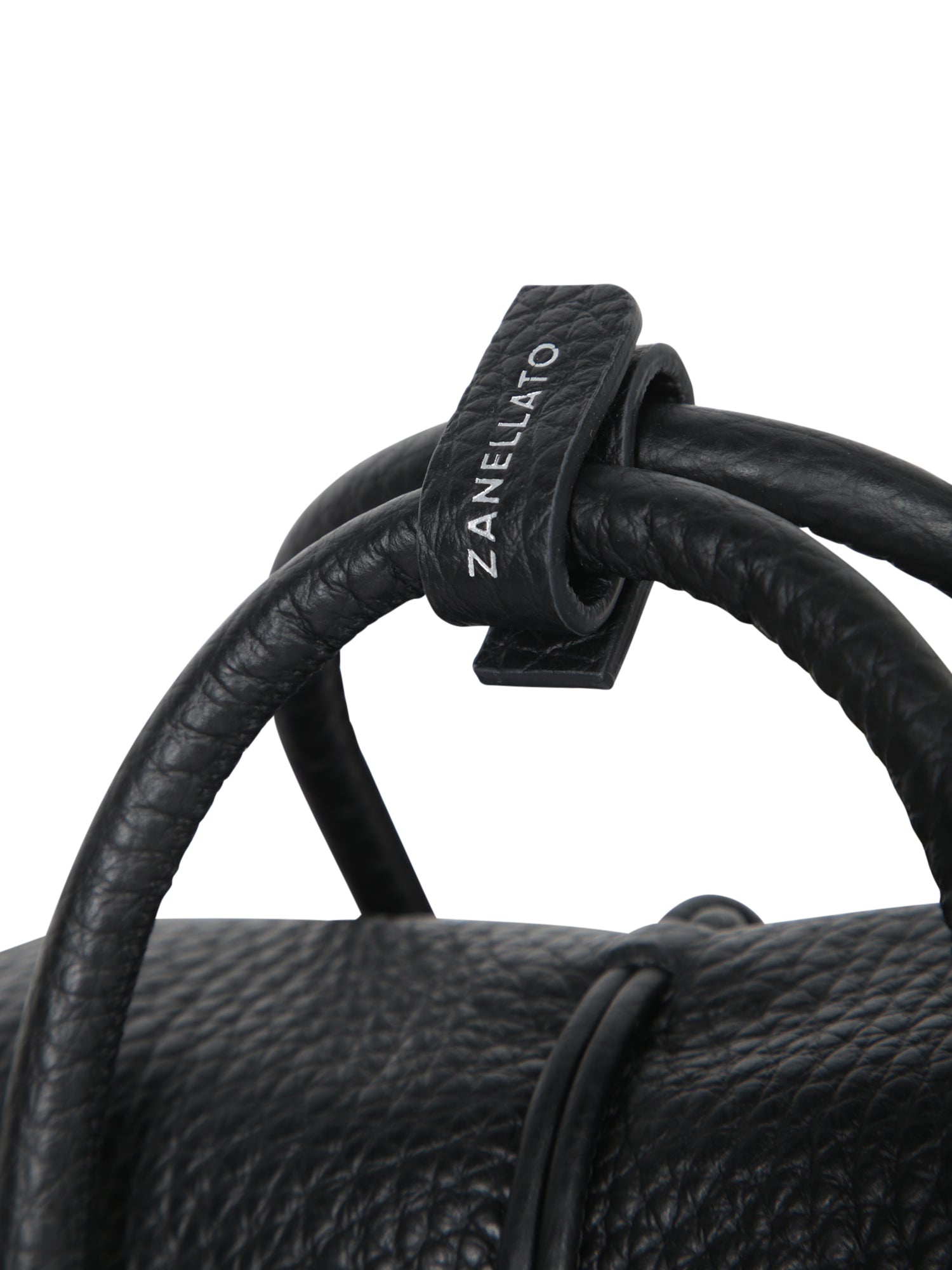 High-quality textured leather. Silver-tone metal details. Removable and adjustable shoulder strap.