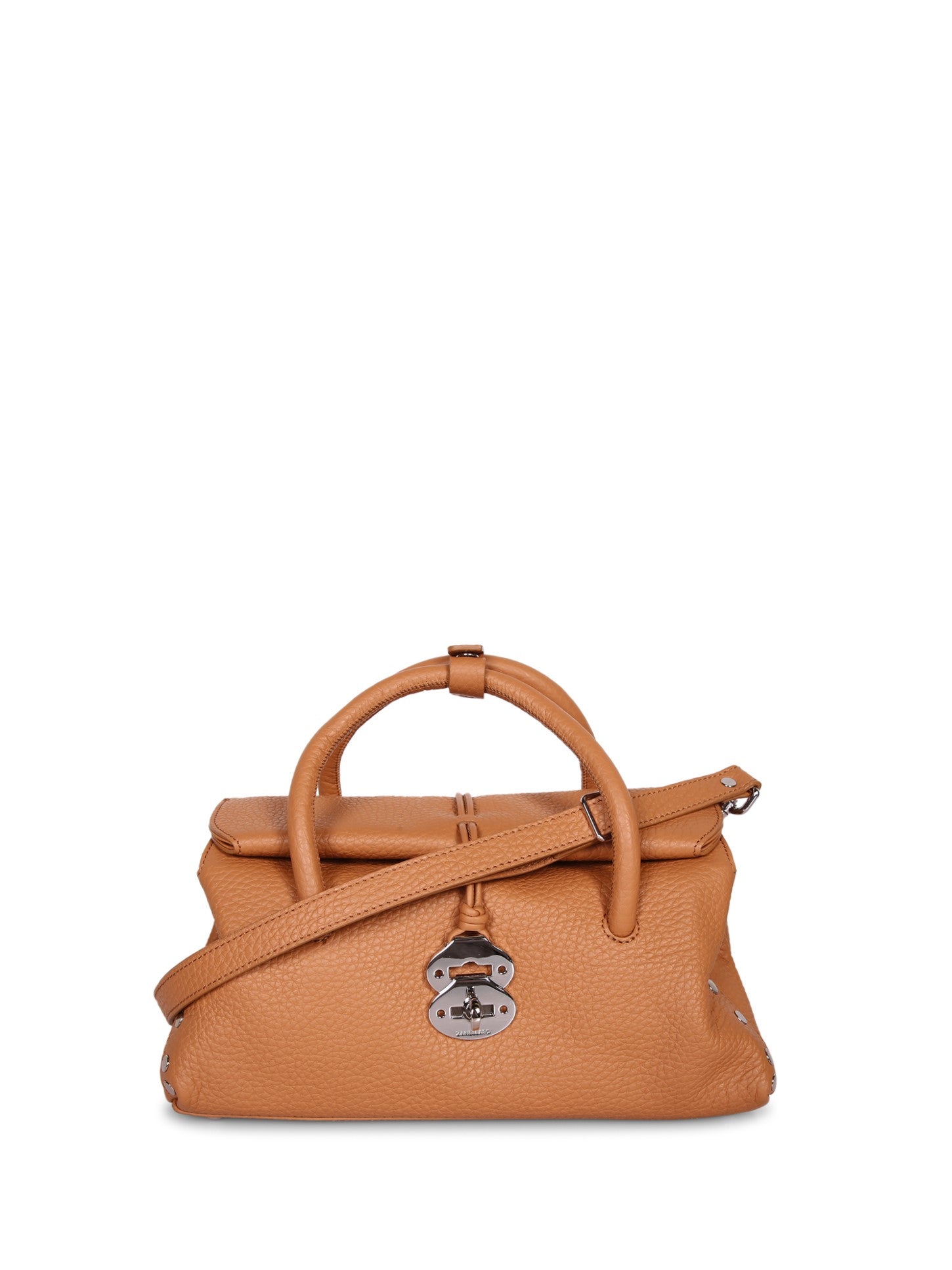 Textured leather bag with top handles and front lock detail. Includes an adjustable and detachable shoulder strap.