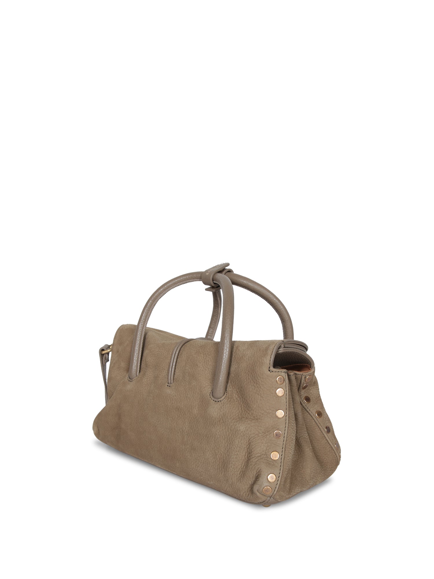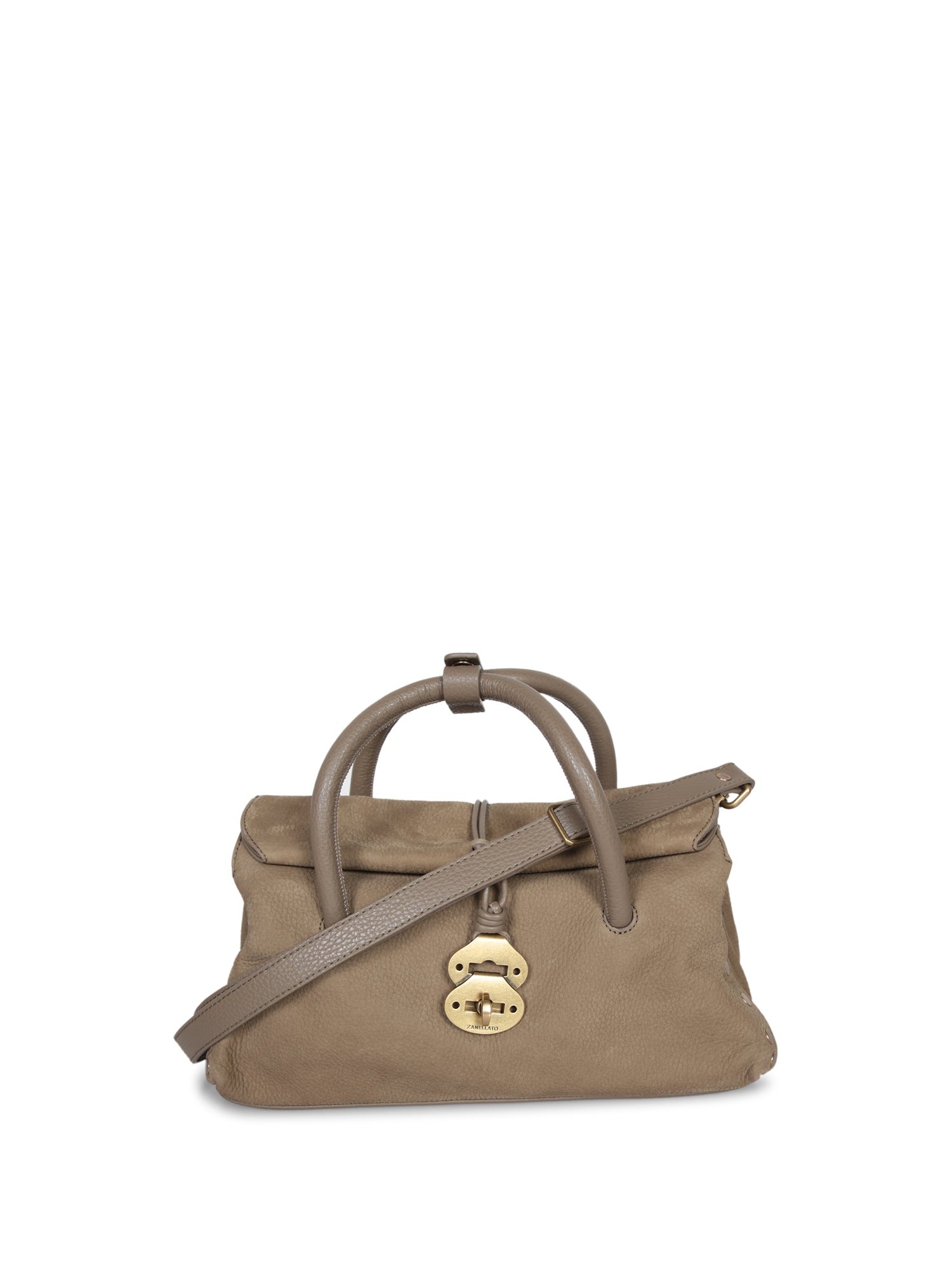 Design with adjustable and removable shoulder strap. Pebbled leather texture. Front closure with padlock.