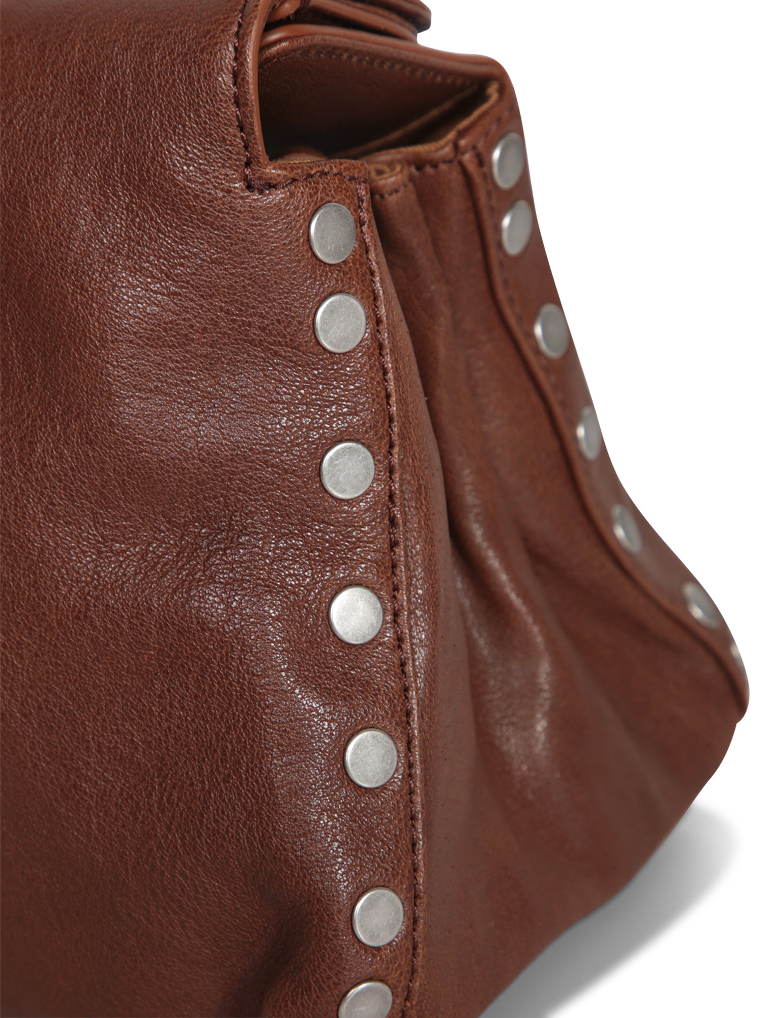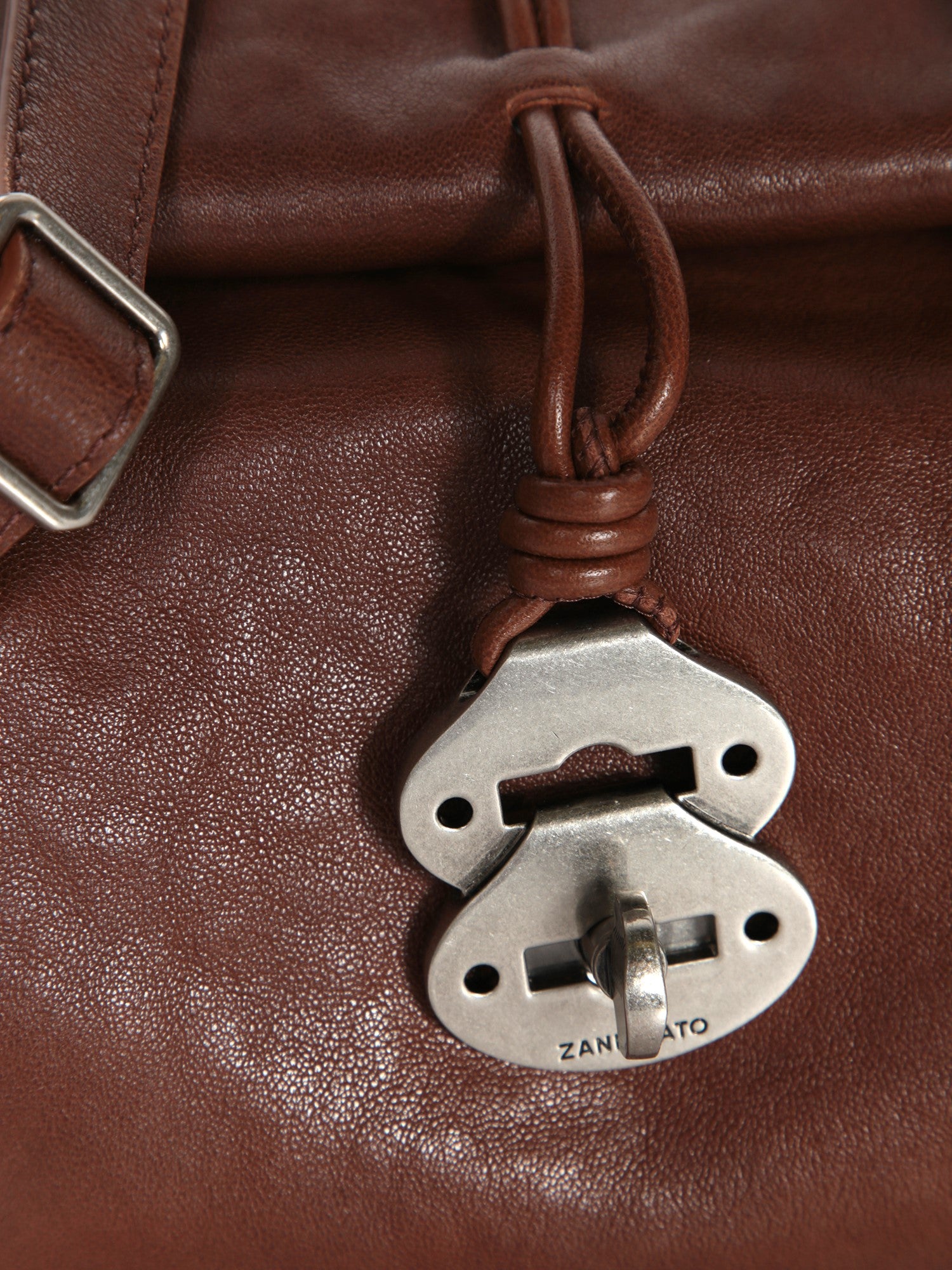 High-quality leather. Adjustable shoulder strap and handles. Custom metal closure.