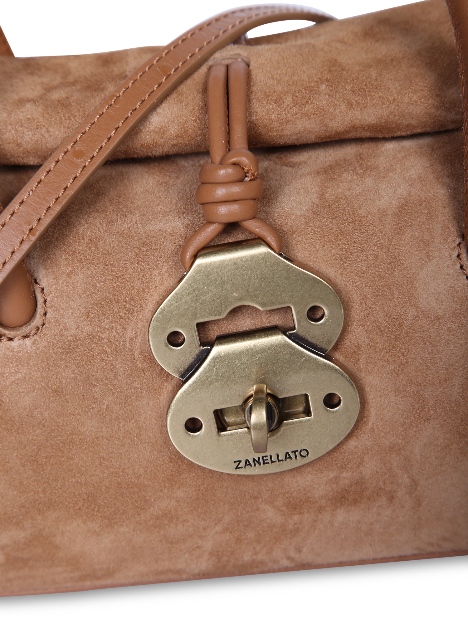 Brown suede leather bag. Smooth leather details. Golden metal buckle closure.