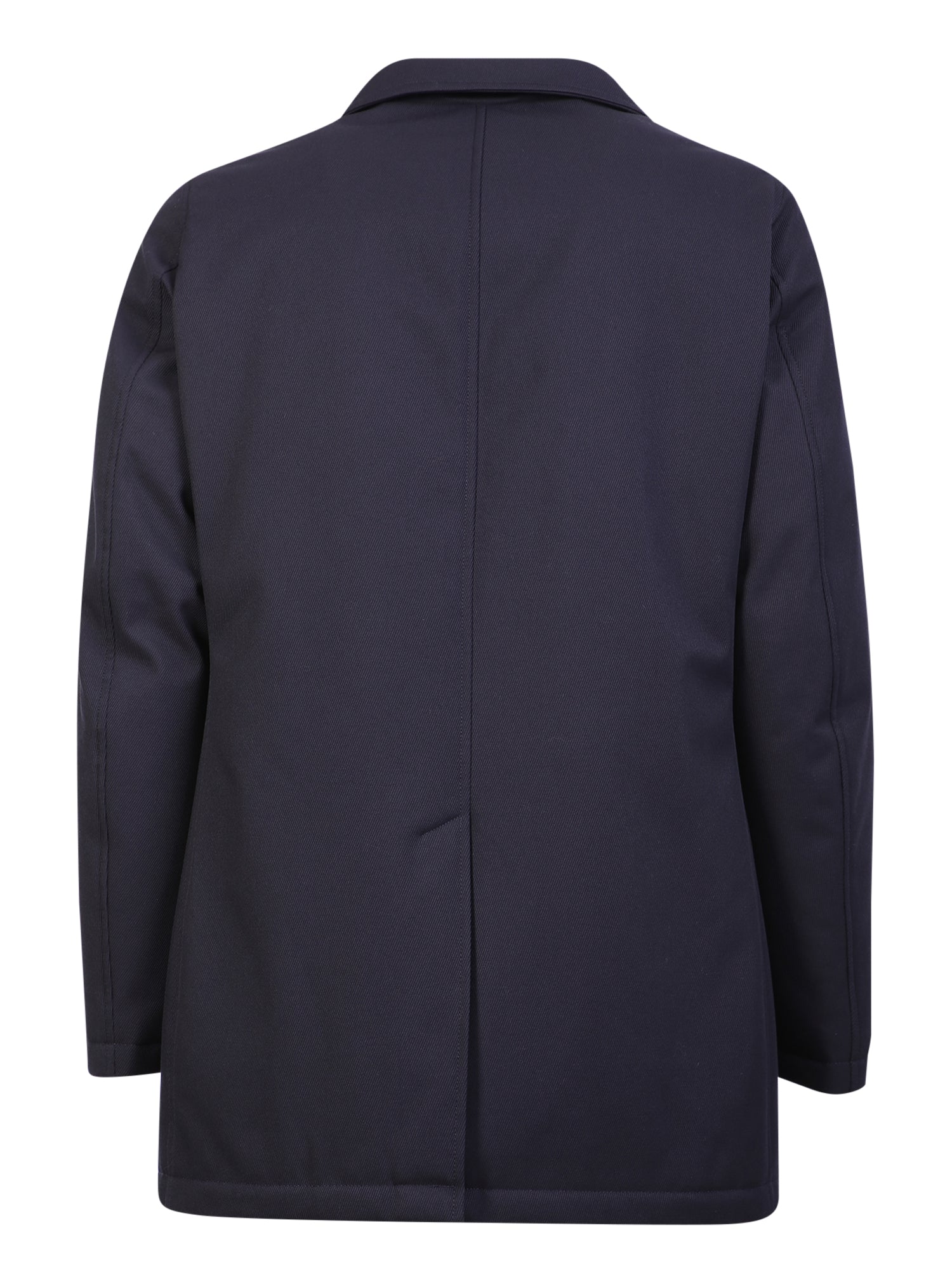 Notched lapels. Double breasted. Front button fastening. Long sleeves. Two side pockets. Central air intake at the rear. Straight hem. Quilted lining. Color: navy blue