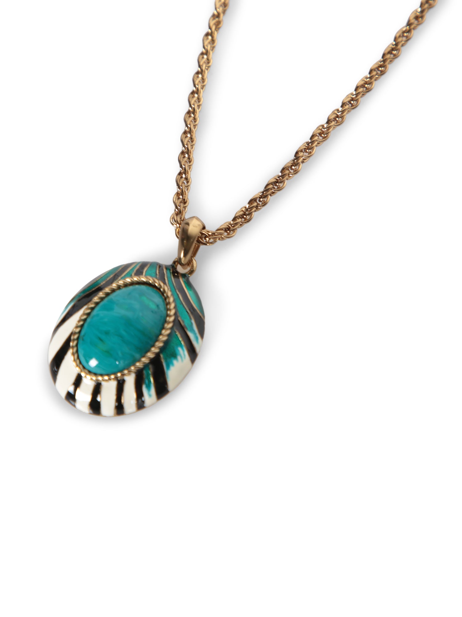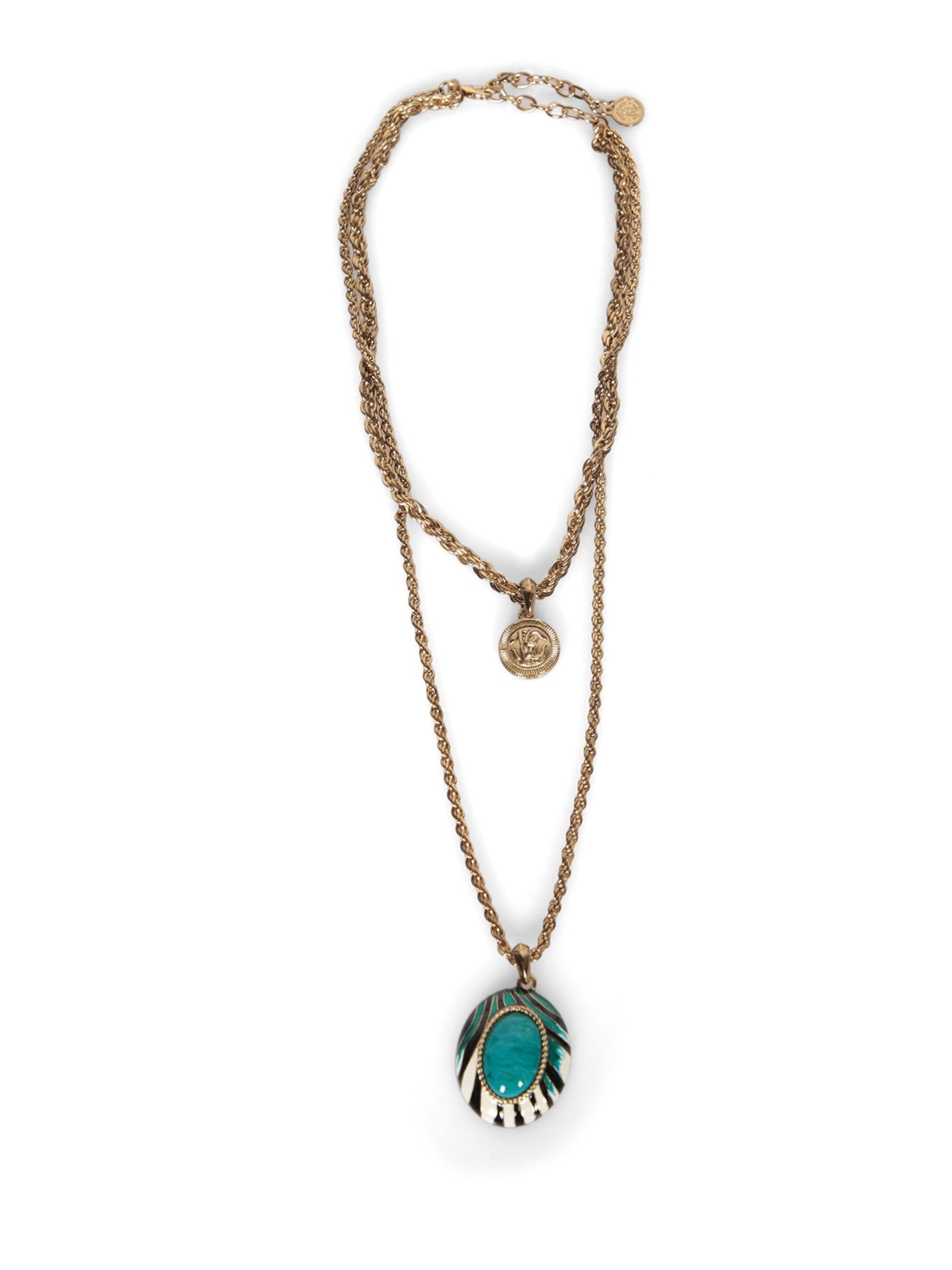 Multi-level golden chain. Central medallion with inset turquoise stone. Geometric decorative details.