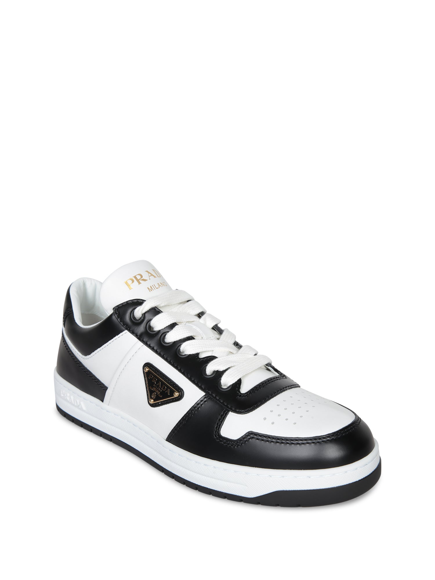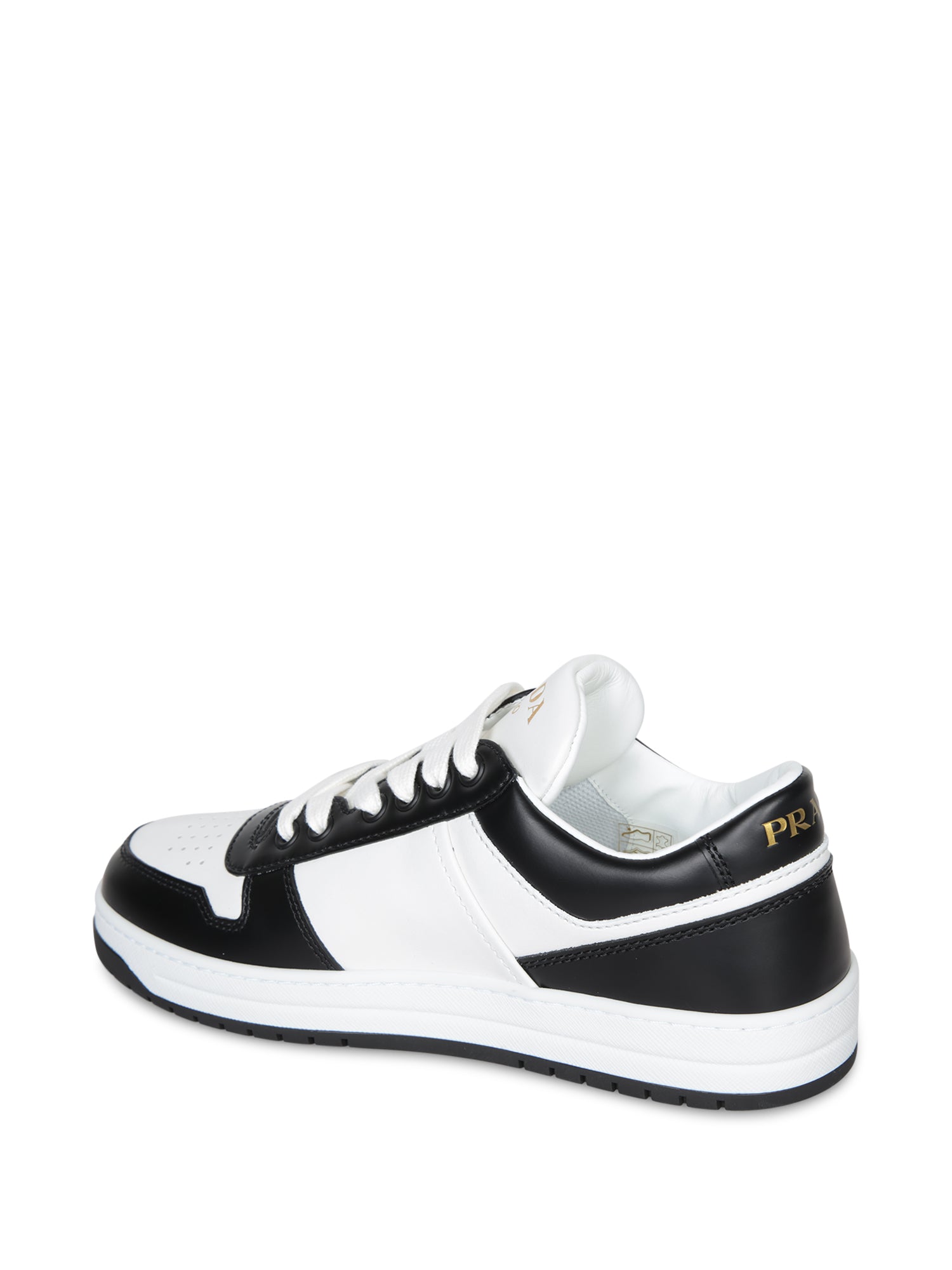 Leather sneakers, metallic Prada logo, rubber sole, two-tone design.