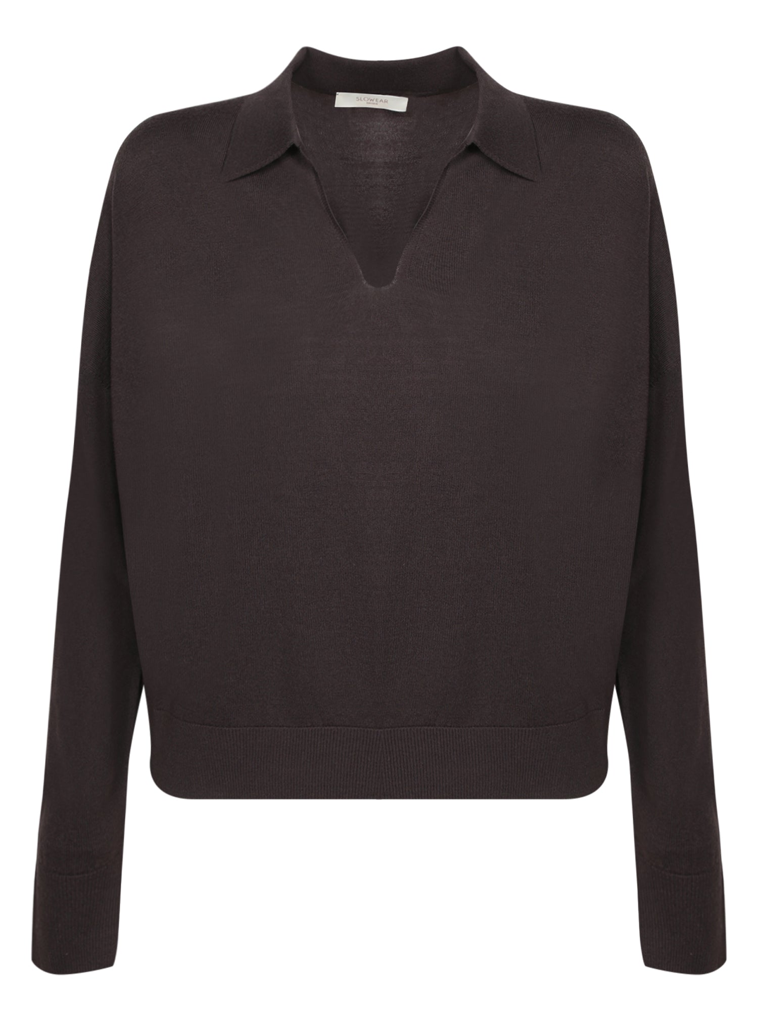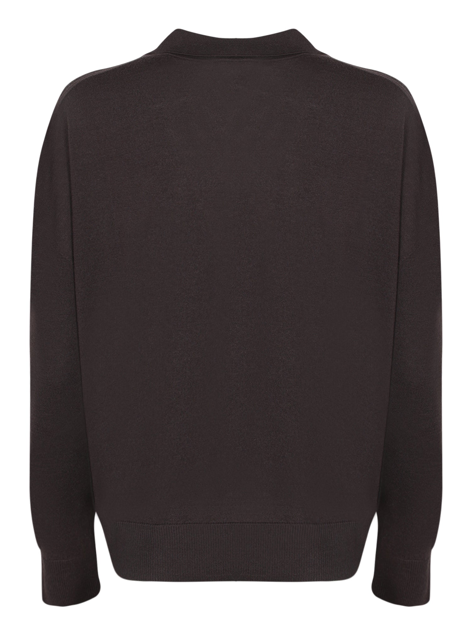 Long-sleeve sweater in earth tone. Polo collar. Ribbed finish on cuffs and hem.