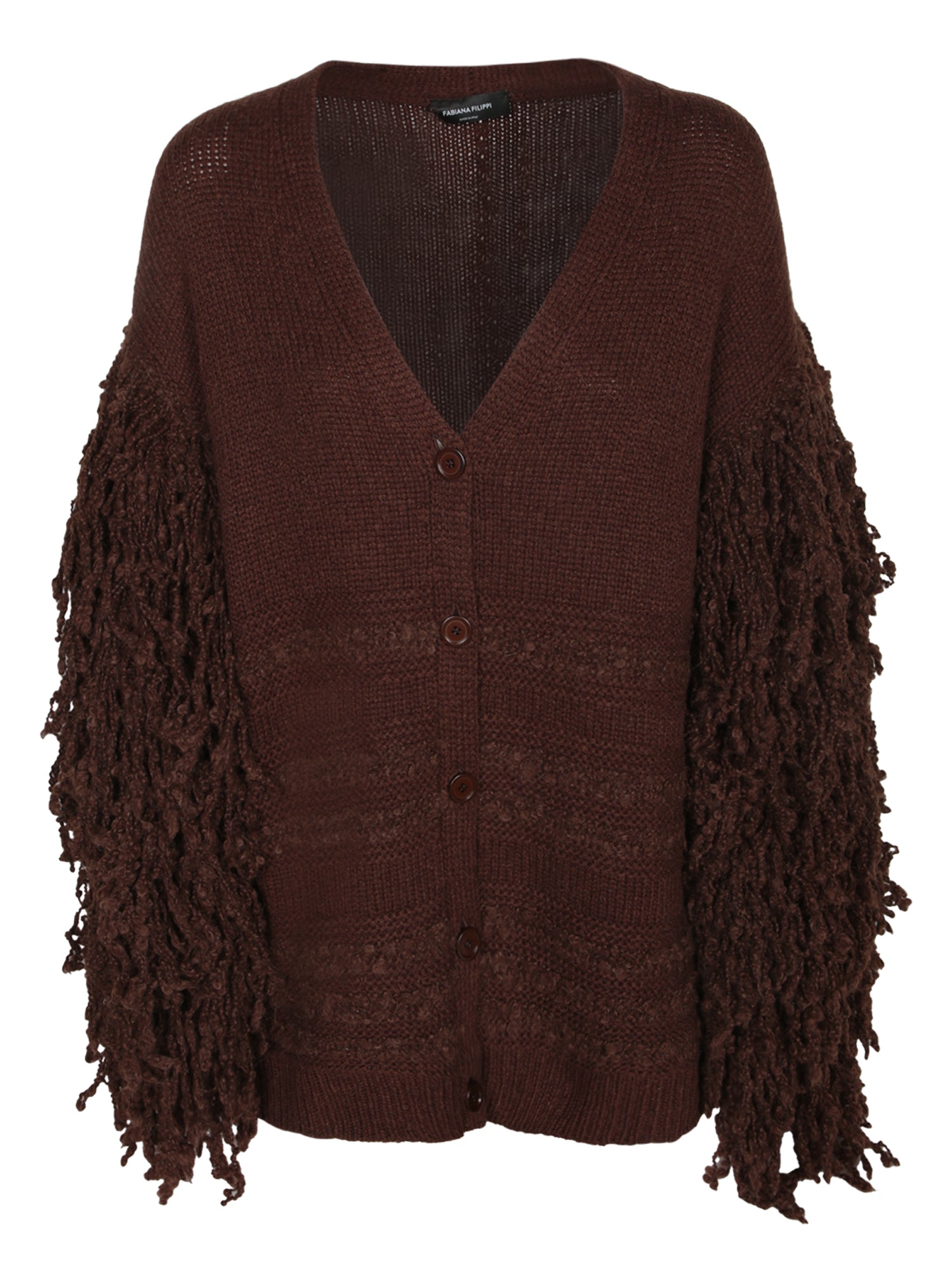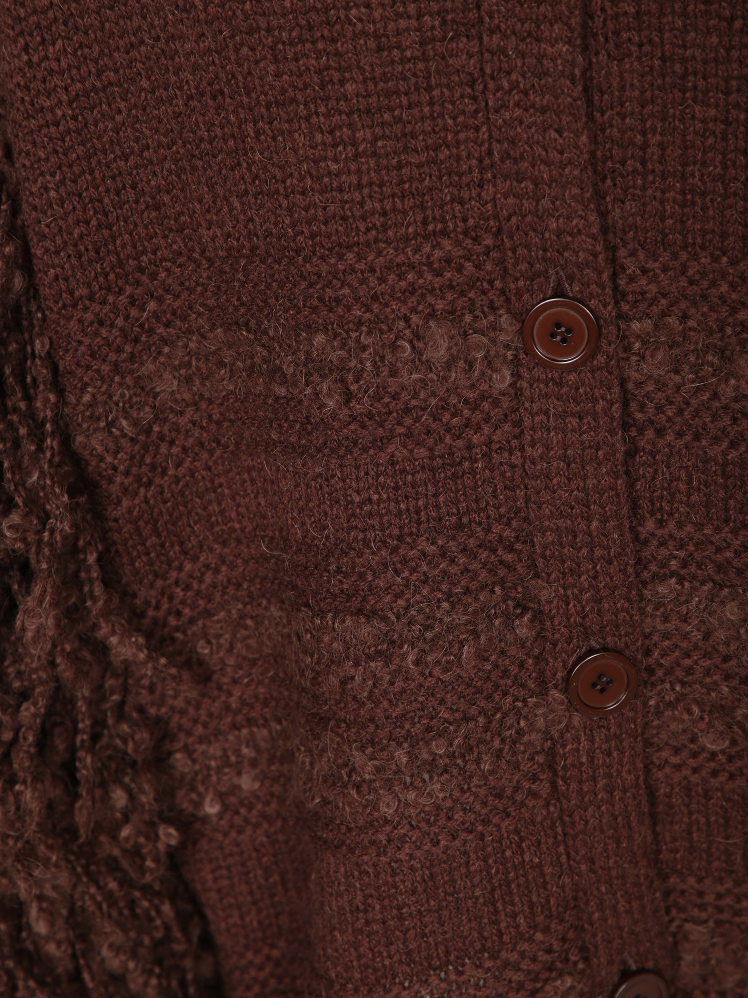 Knitted cardigan with fringe, long sleeves, V-neckline, button front closure.