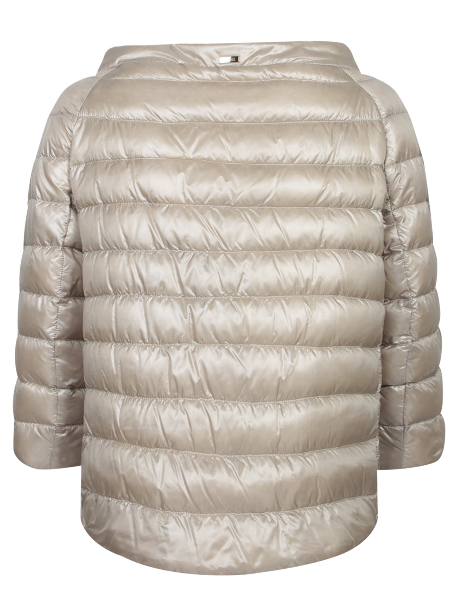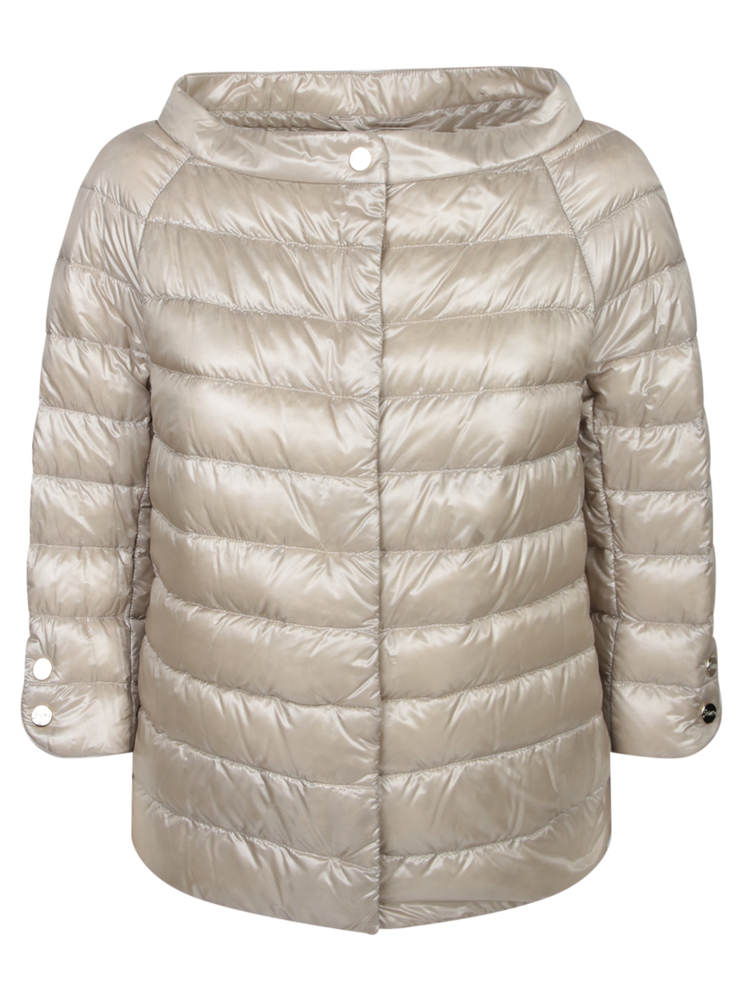 Quilted down jacket with snap closure. High collar. Long sleeves with buttoned cuffs.