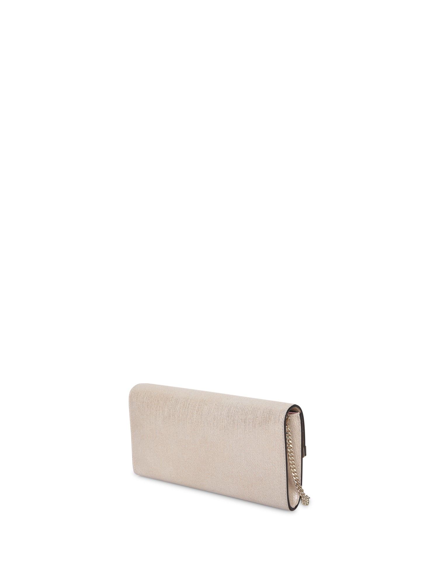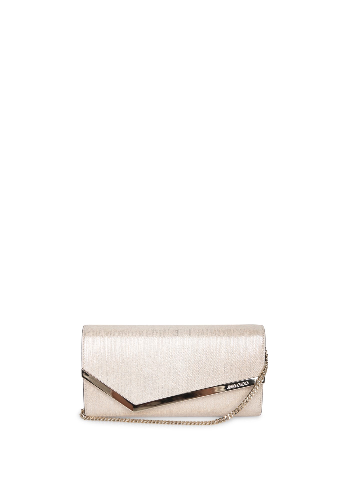 Designed to shine on any occasion, this Jimmy Choo bag features a soft gold metallic fabric with shiny metal details accentuating its sleek and slim silhouette. It's practical yet refined, perfect for adding a touch of luxury.