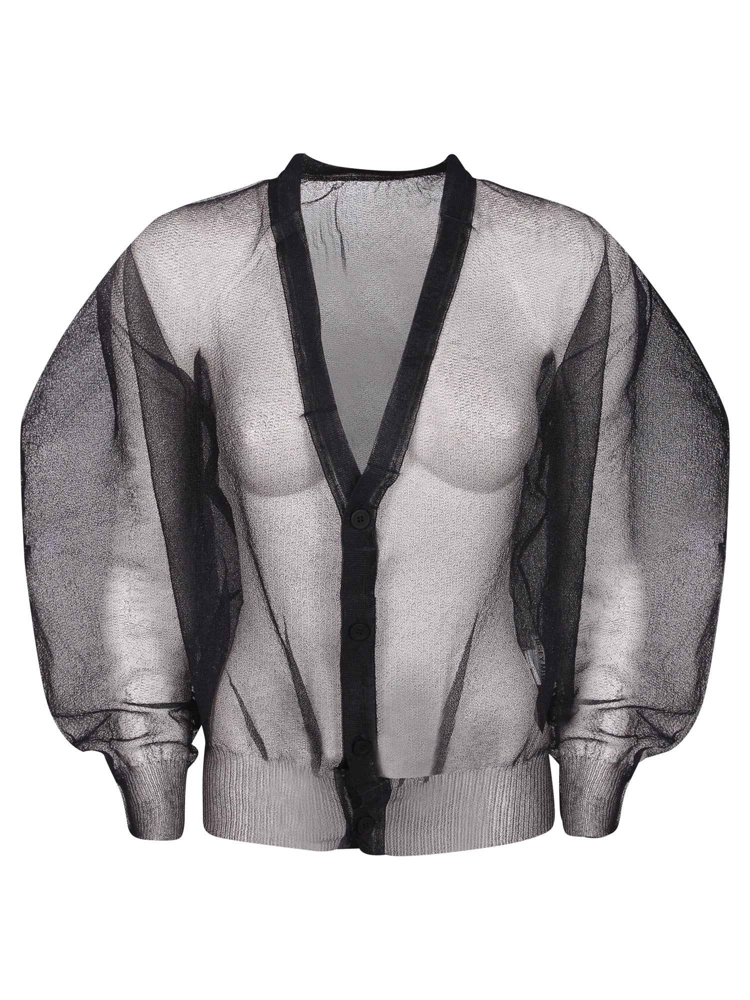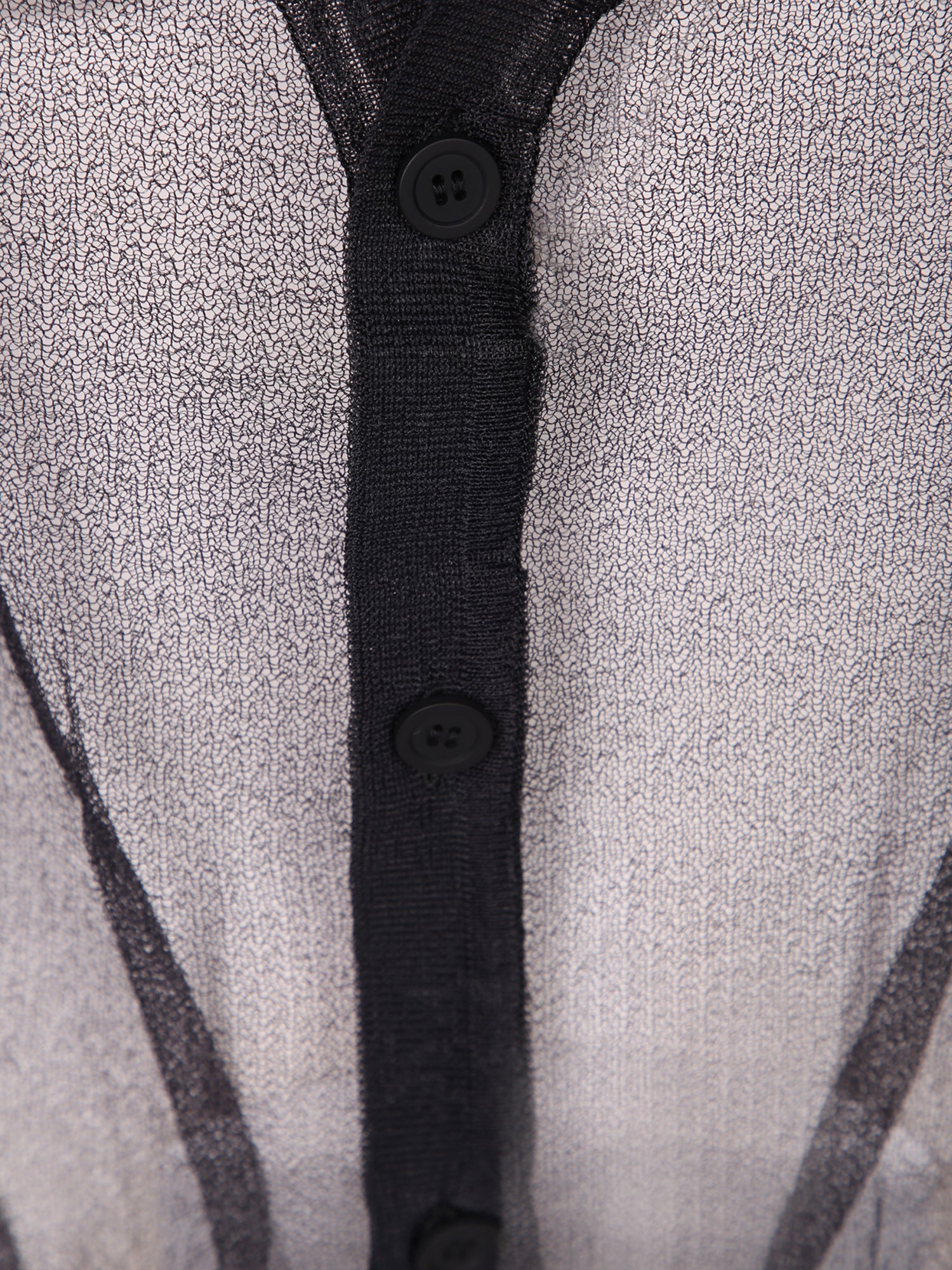 Transparent nylon cardigan. Ribbed edges and trims. Button front closure.