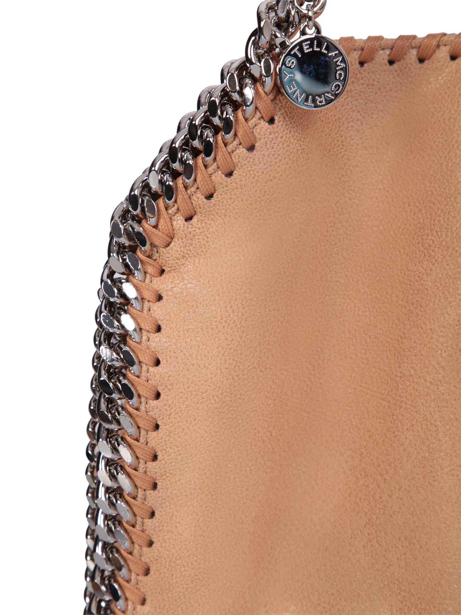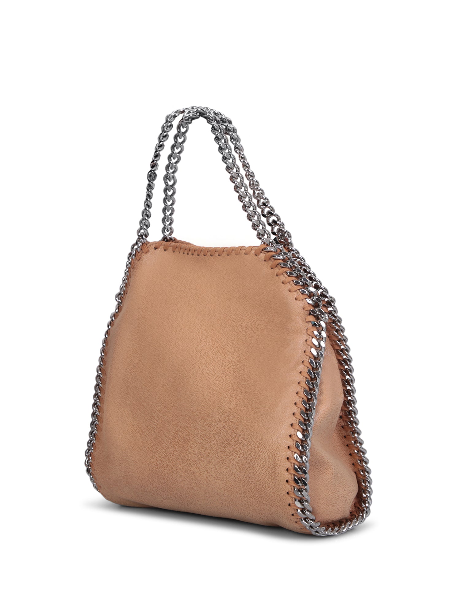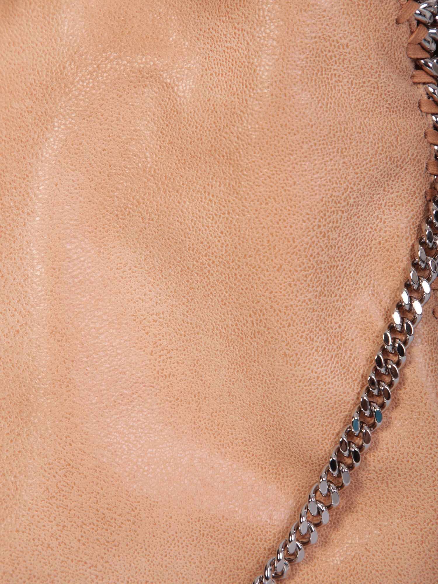 Two chain-link top handles. Chain-link shoulder strap. Magnetic fastening. Internal zip pocket. Main compartment. Chain-link trim. Logo charm. Silver-tone hardware. Made of cruelty-free leather. Color: beige Depth: 5cm Handle: 12cm Height: 25cm Width: