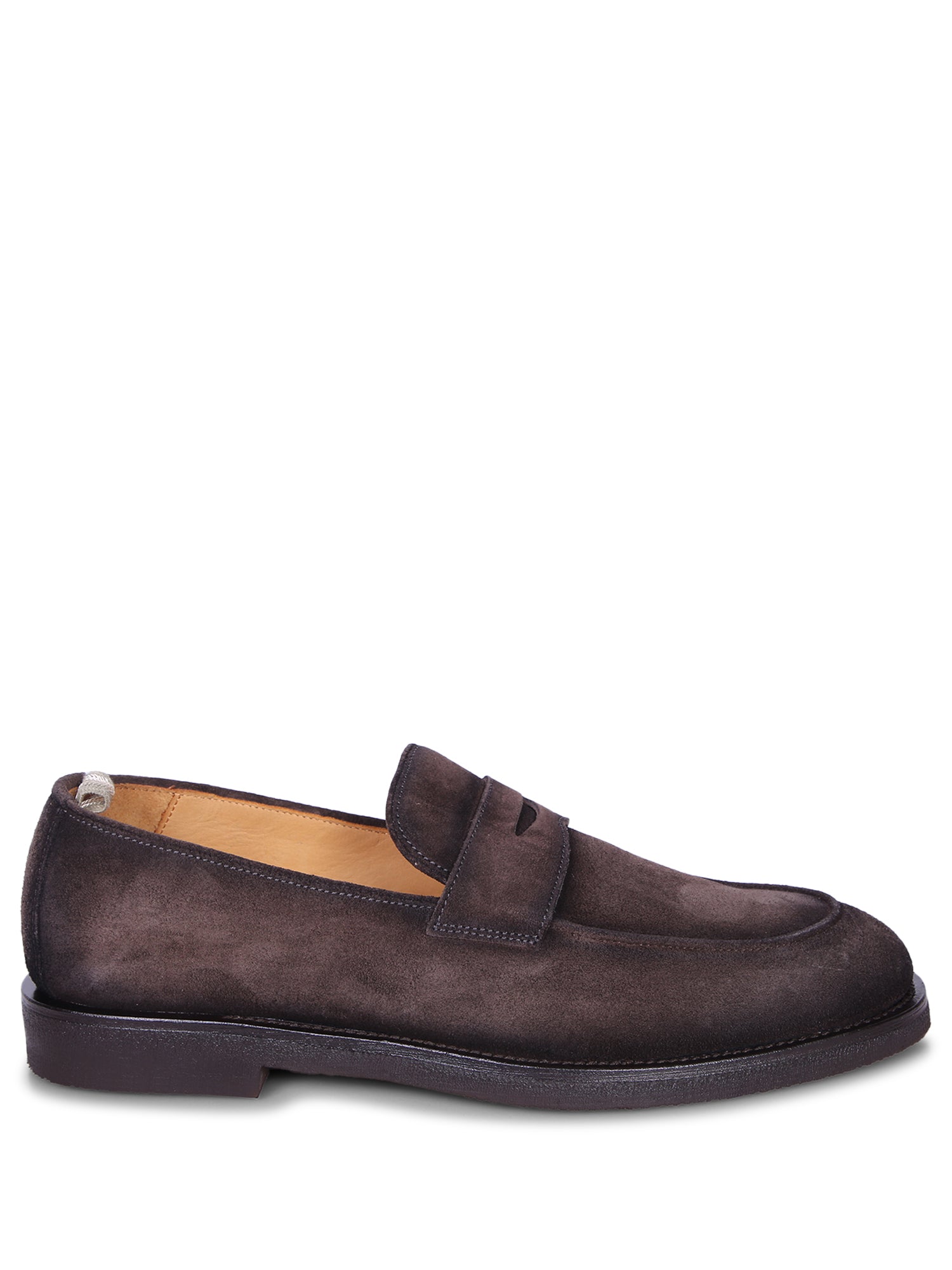 Soft suede mocassin with a rubber sole. Features a strap detail and tonal stitching.