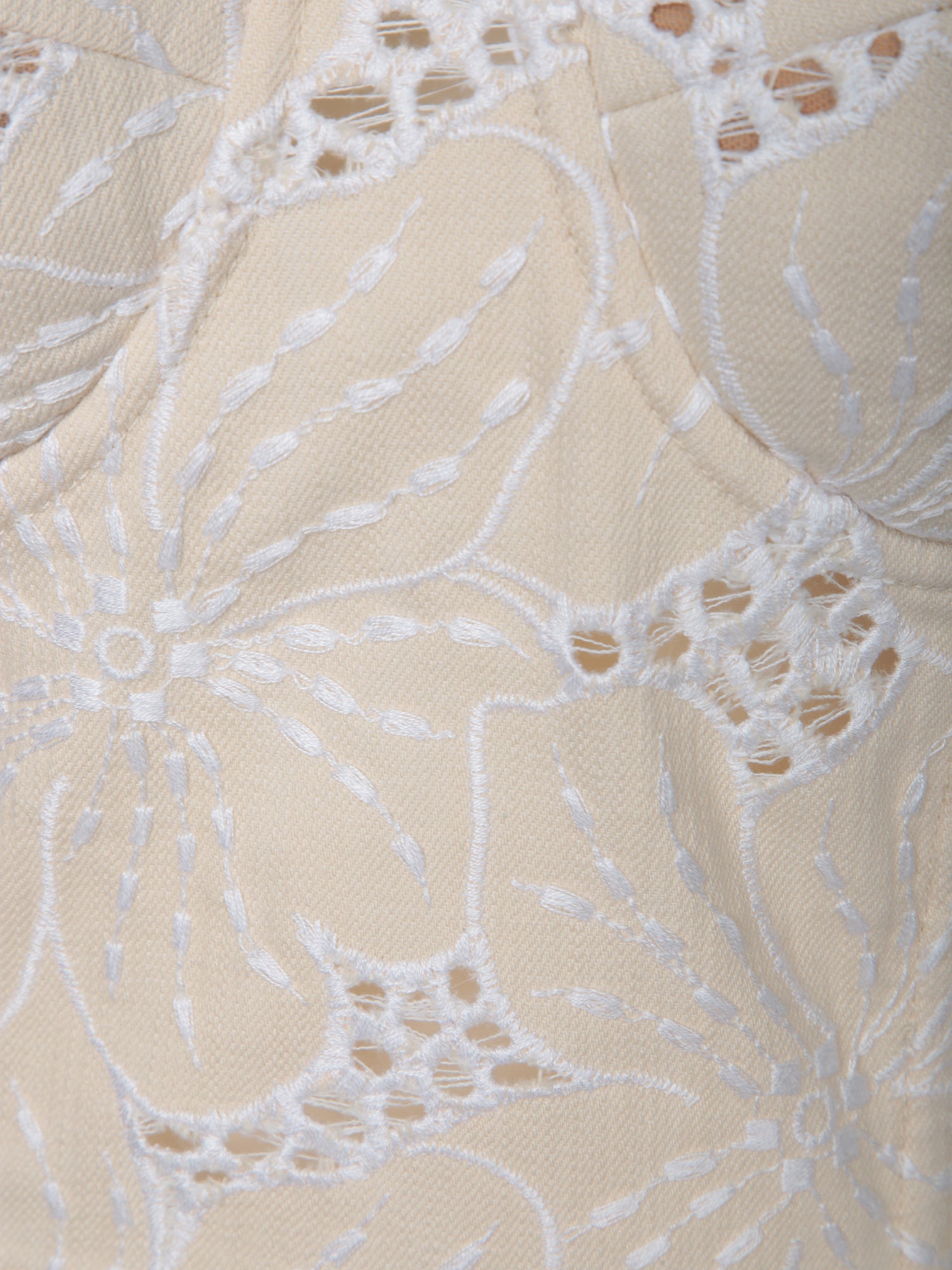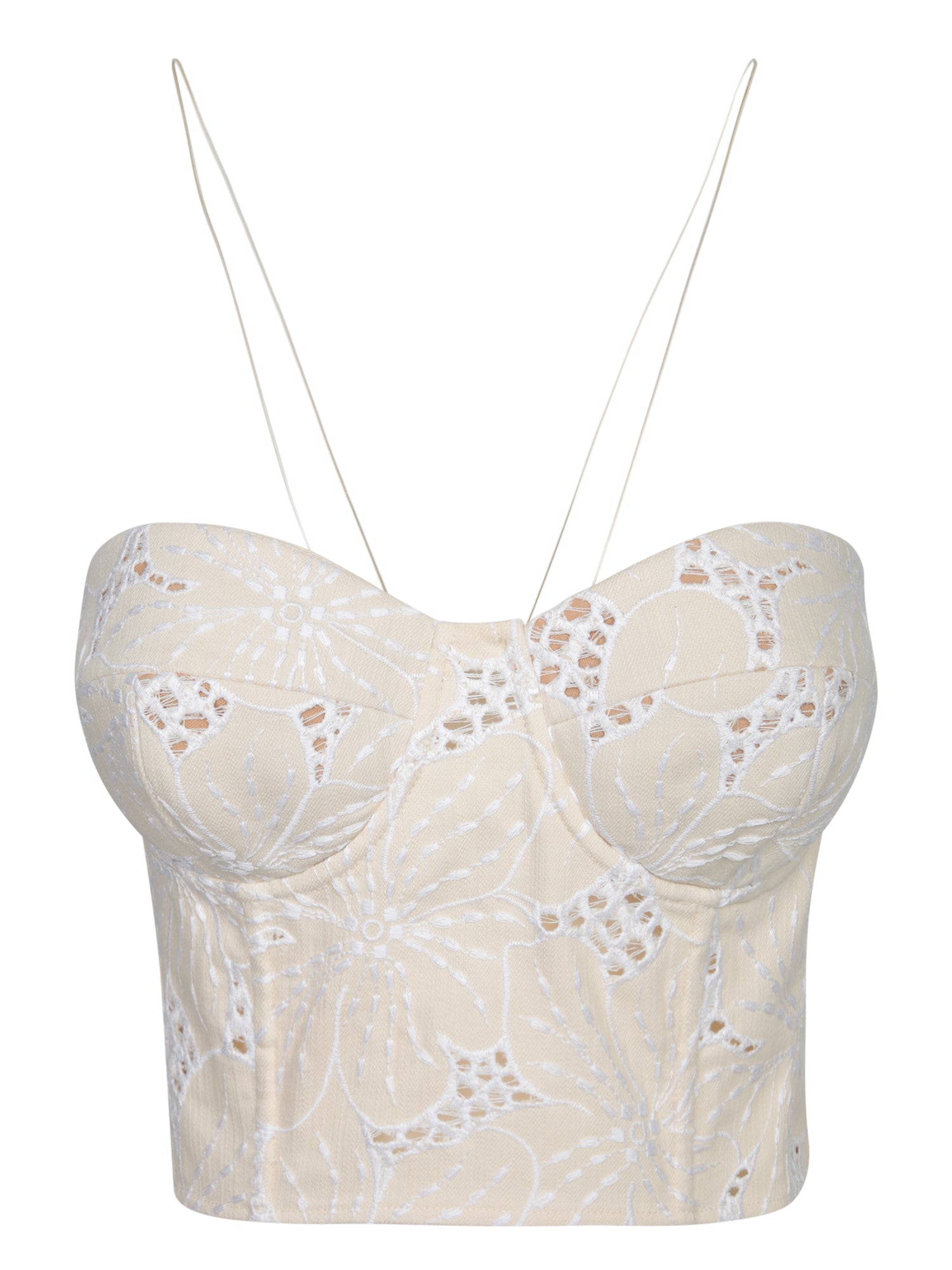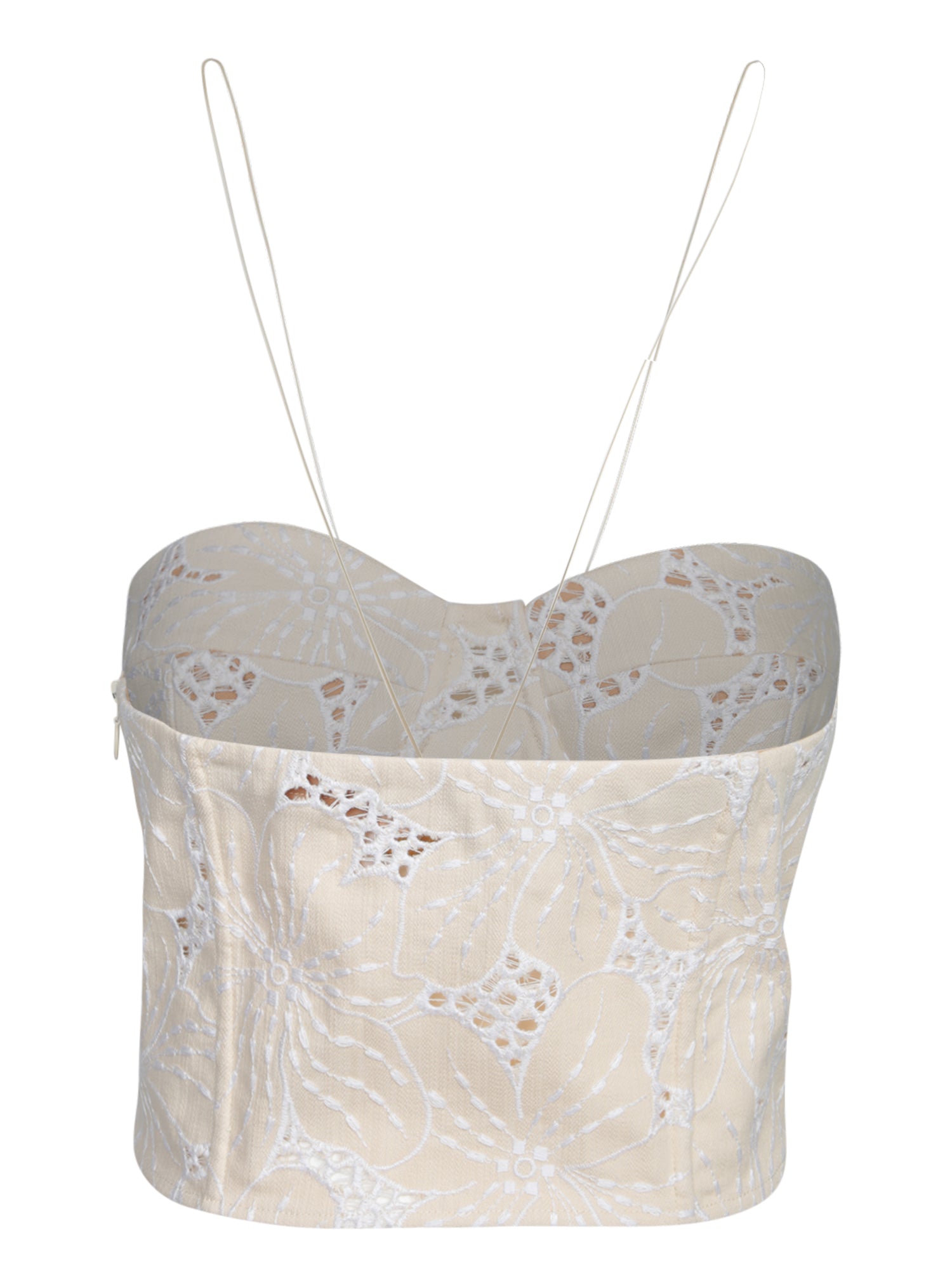 A masterpiece of femininity, Genny's Floral Drill Top features delicate floral embroidery on beige fabric. Perfect for elegant evenings or formal events, this top brings a touch of sophisticated refinement to your look.