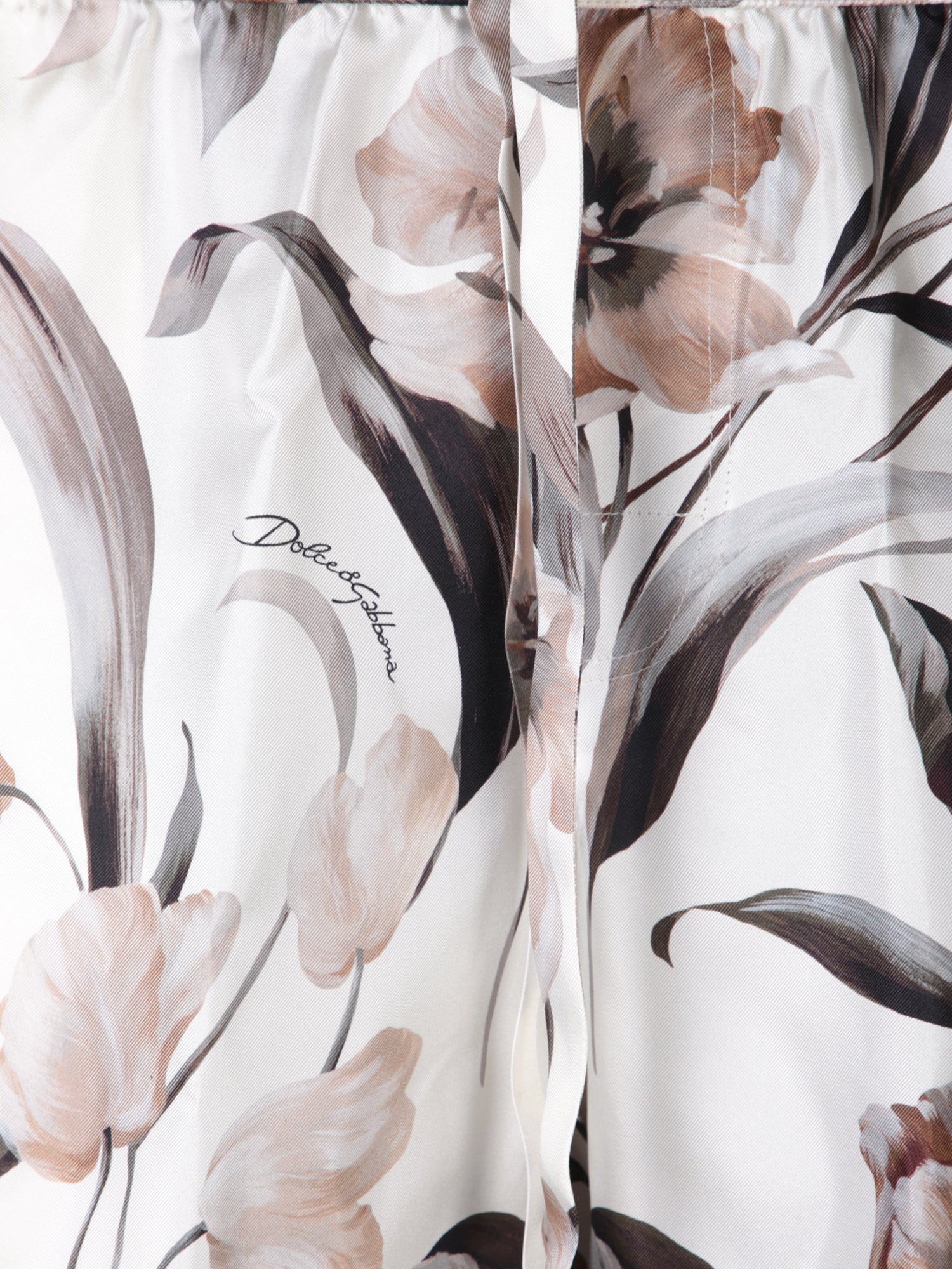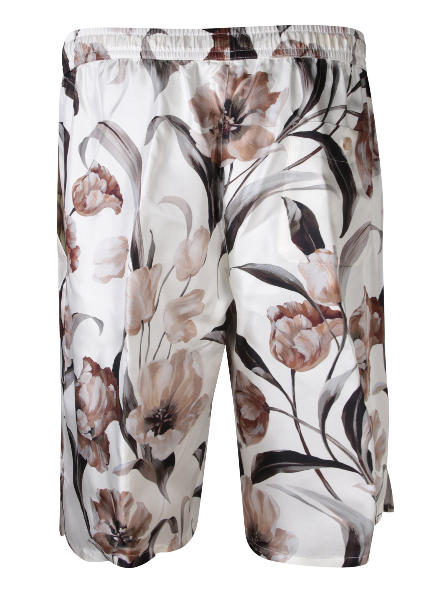 Light fabric Bermuda shorts. Elastic waistband. Floral pattern on an ivory base.