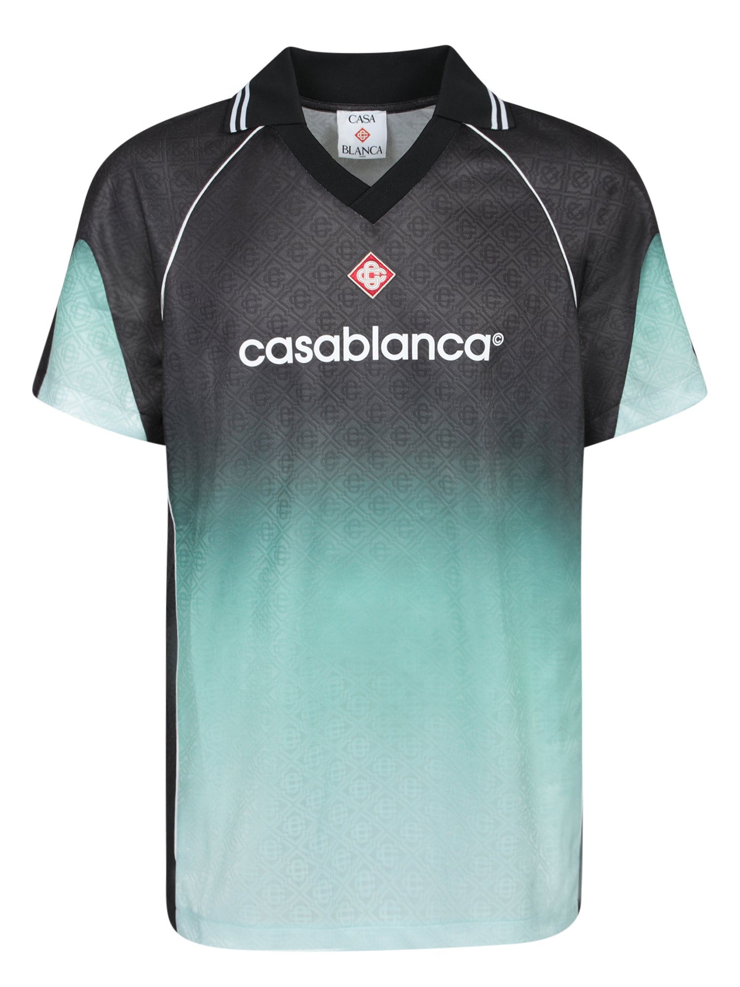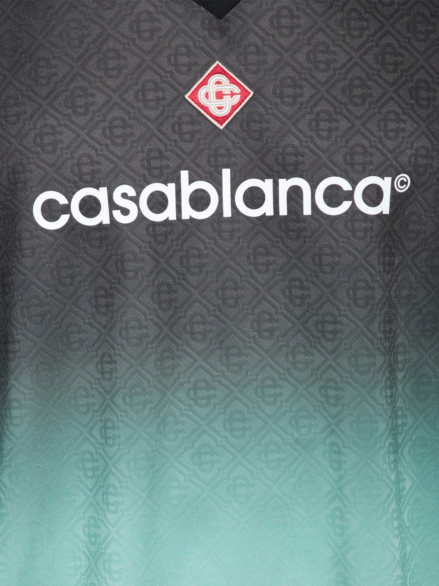 Casablanca blends sportiness and style with this black and mint technical fabric t-shirt, featuring an elegant tone-on-tone monogram pattern and contrast detailing on the collar and sleeves.