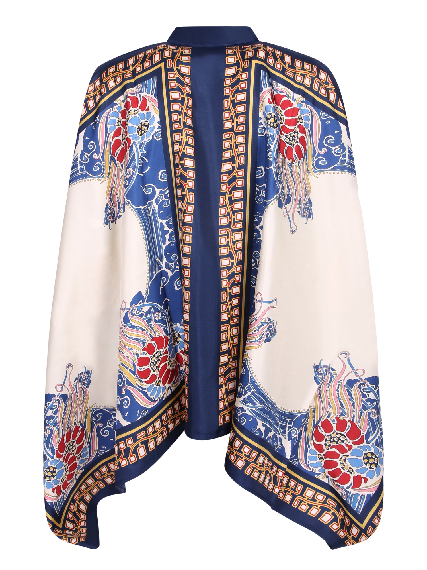 Premium silk. Vibrant print. Wide and flowing design. Button closure.