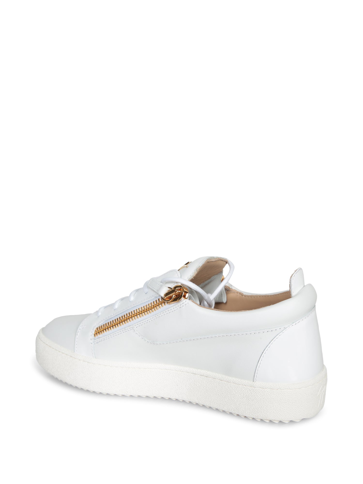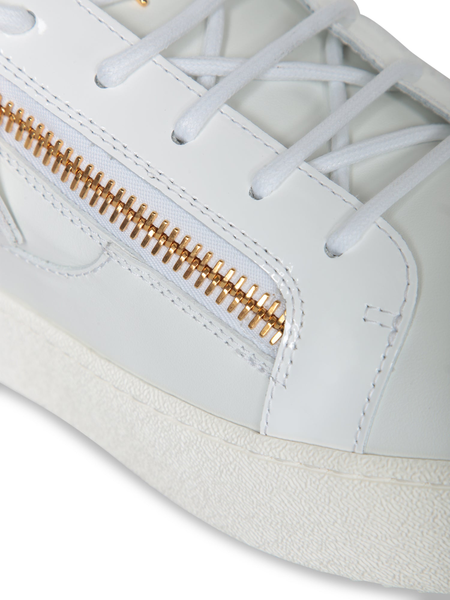 Smooth leather sneakers with side gold zipper and metallic logo detail. Rubber sole.