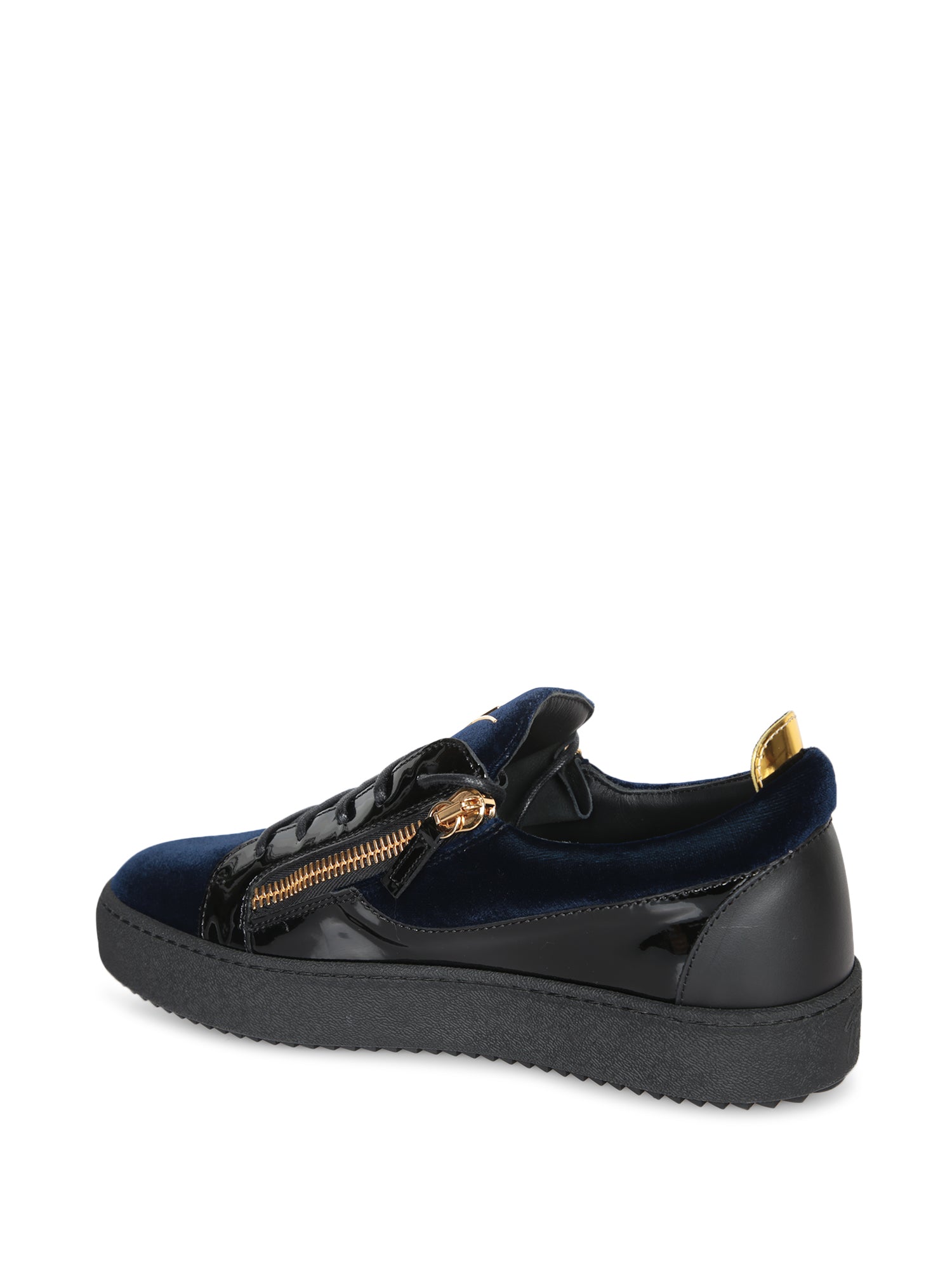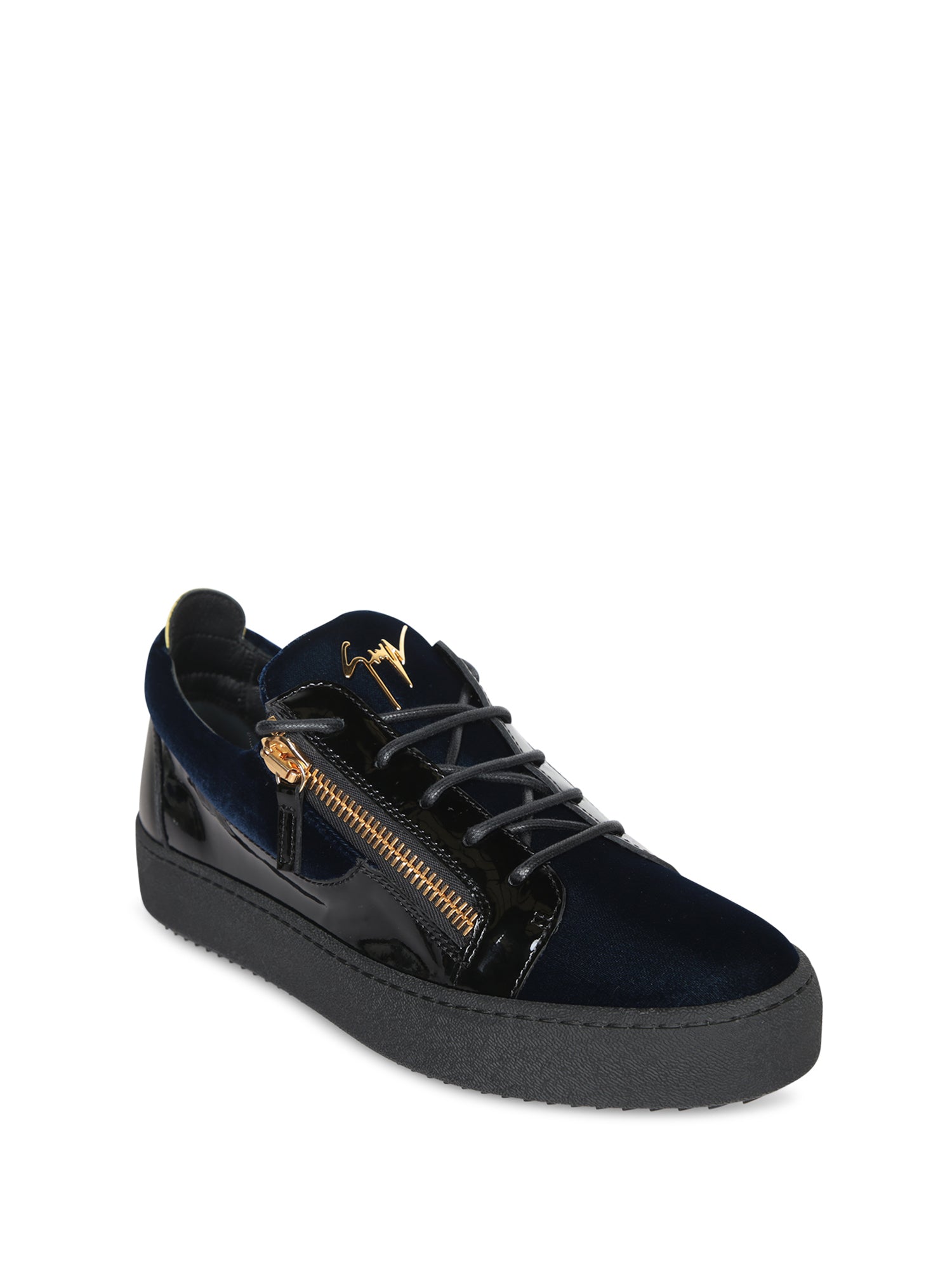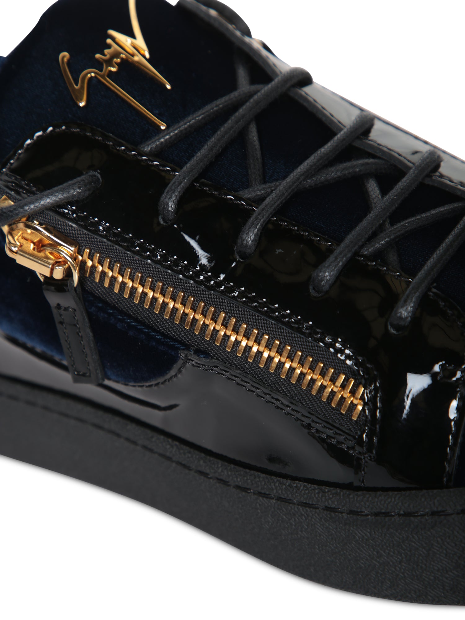 Crafted from black patent leather with gold details. Features zipper and lace-up closure.