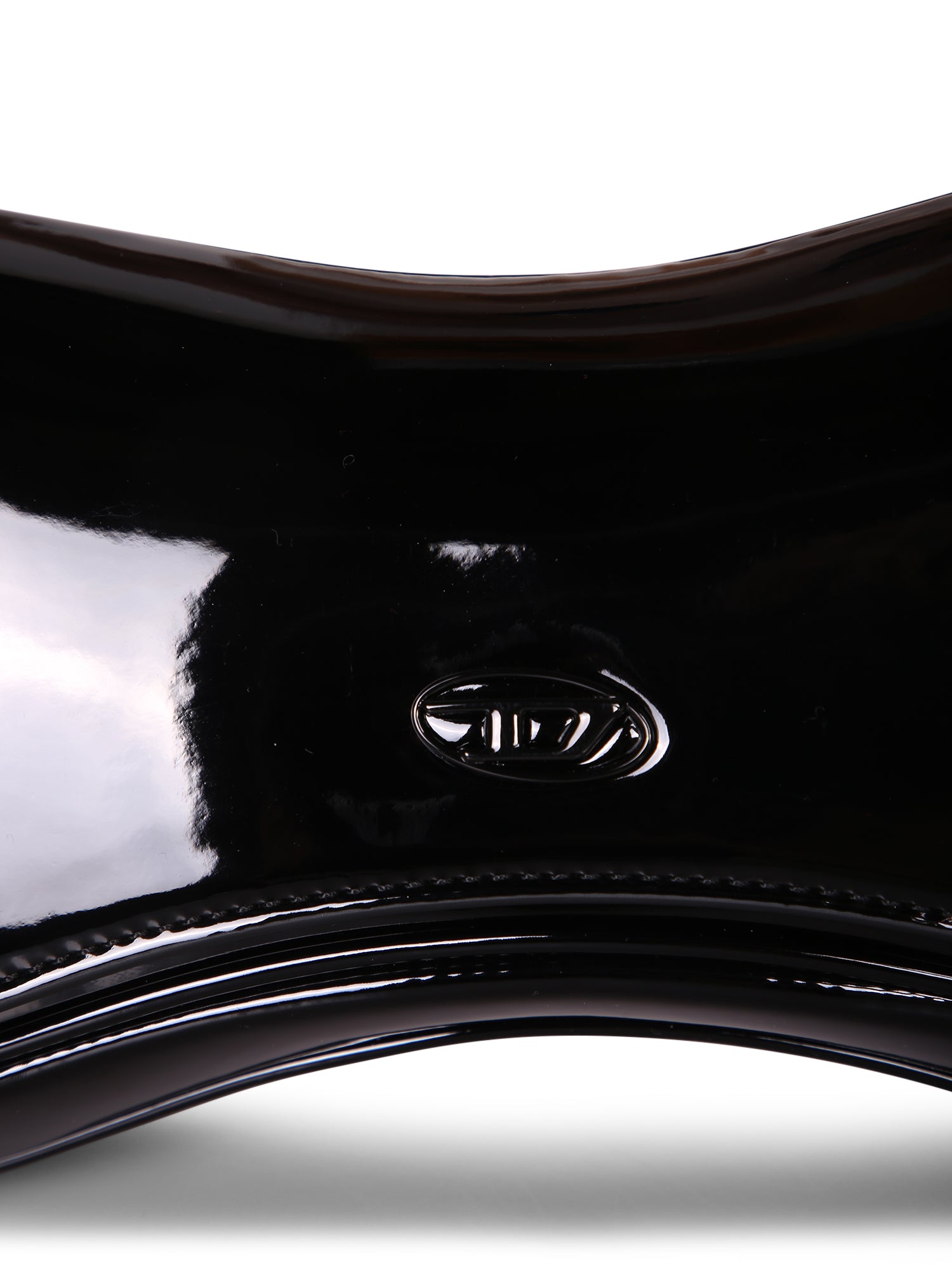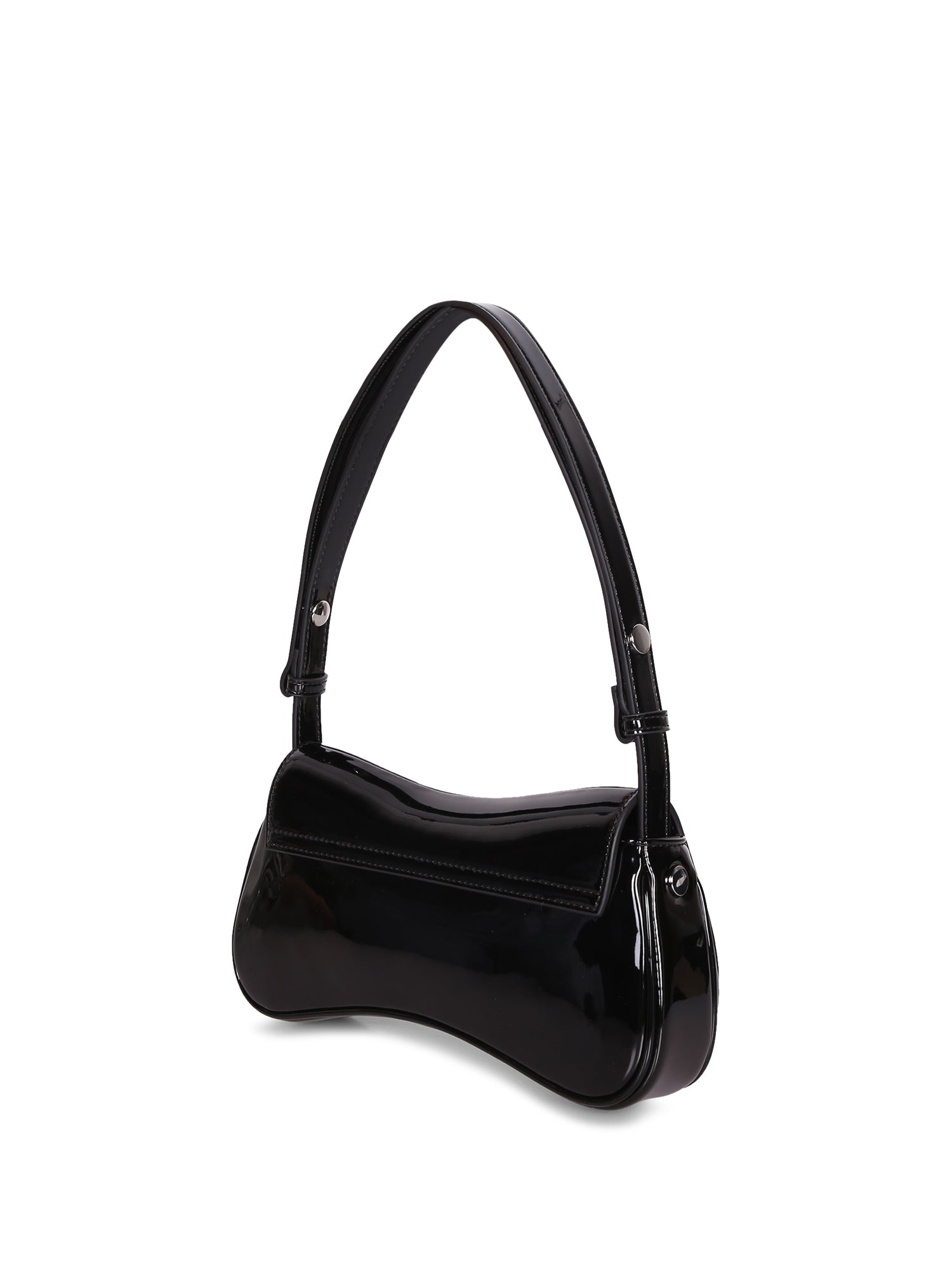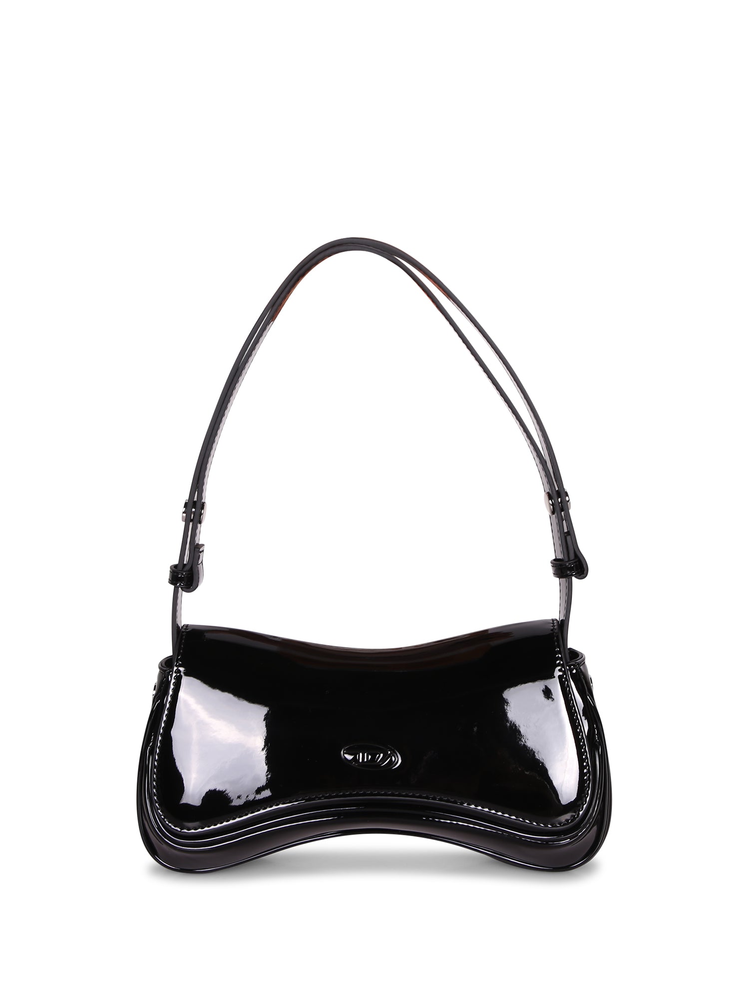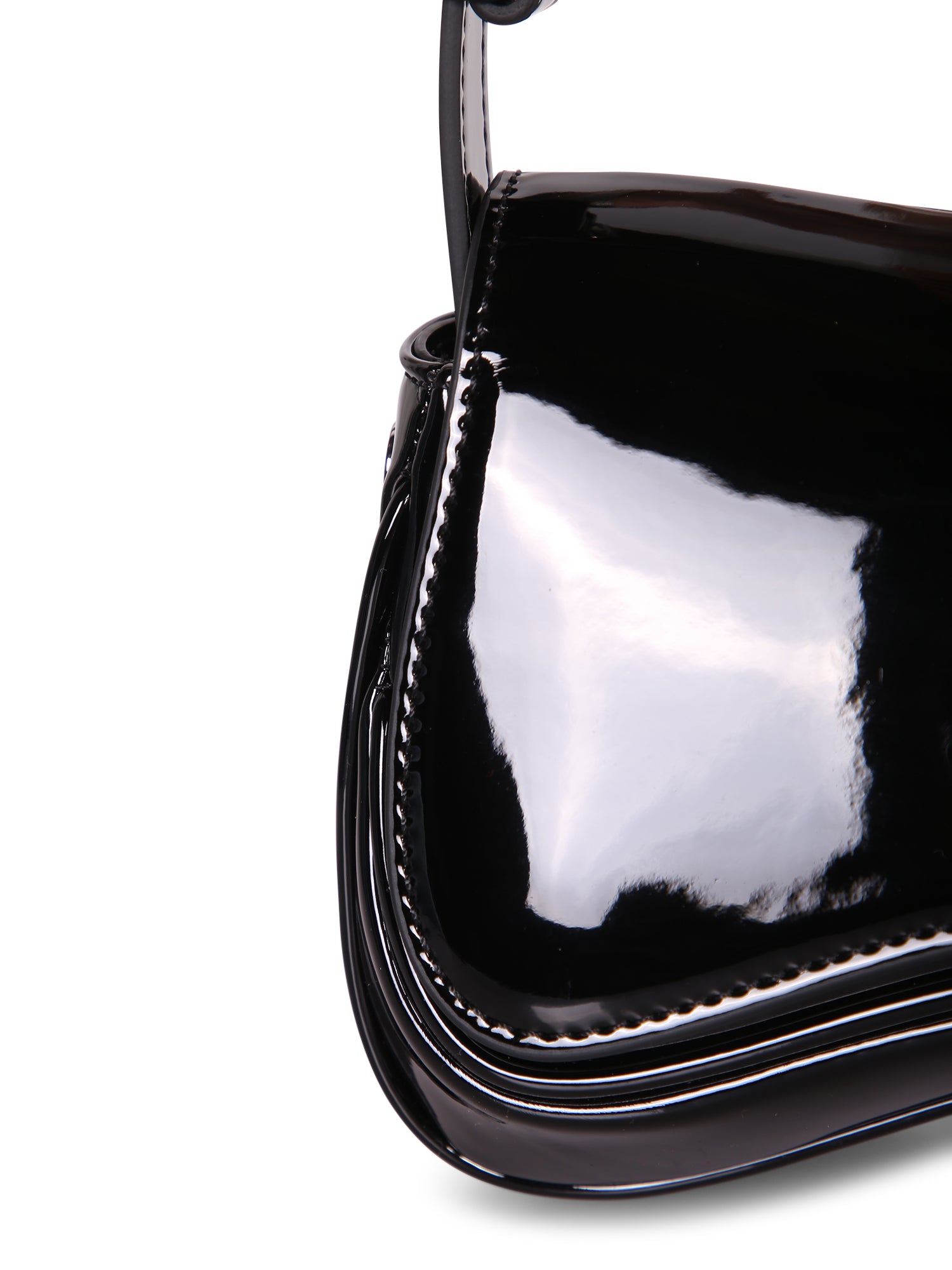 Elegant clutch in glossy finish. Features an adjustable and detachable shoulder strap. Prominently displayed brand logo.