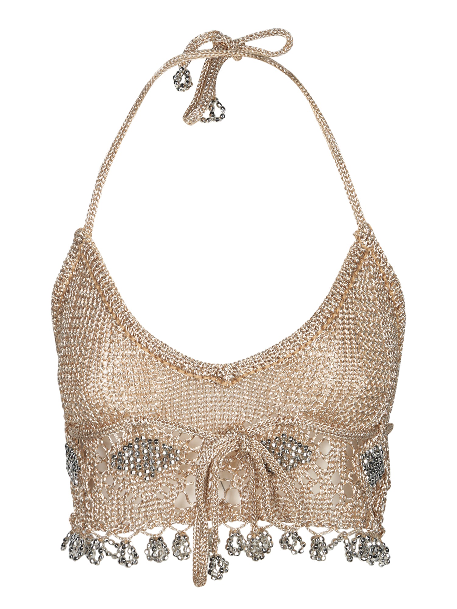 This elegant PACO RABANNE top, is adorned with an intricate crochet weave enriched with sparkling crystals and finished with stylish pendants. The design is completed with an adjustable tie for a perfect fit.