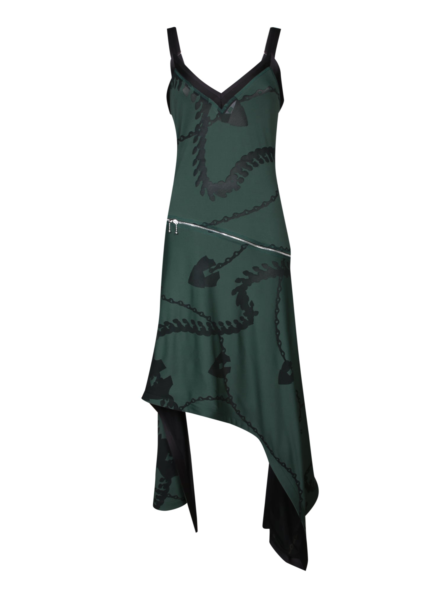 Asymmetric dress with chain pattern. Adjustable thin straps. Zip details.