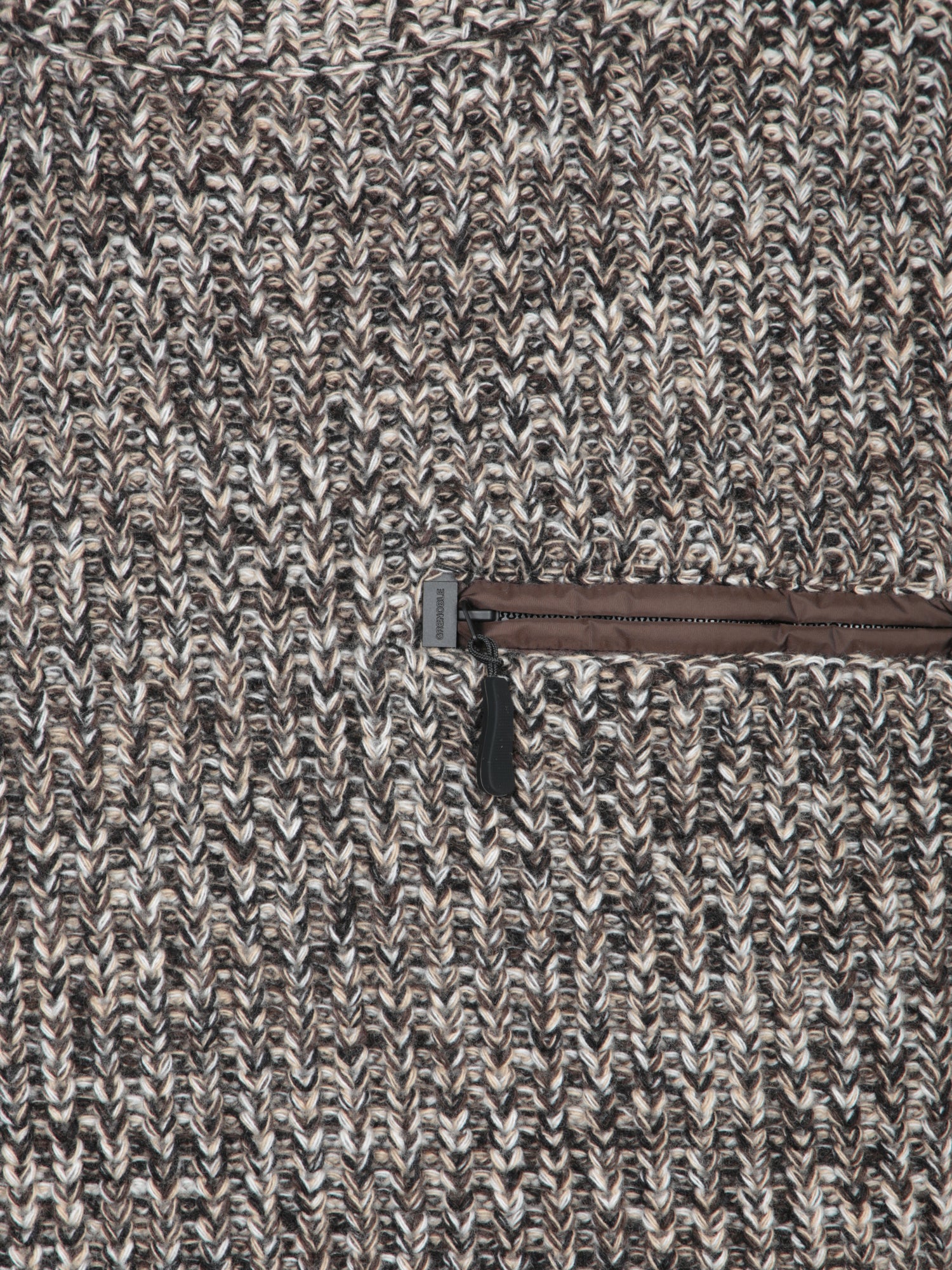 Thick knit sweater with high collar and partial zip closure. Features leather details on the sleeves and a patch pocket on the chest.