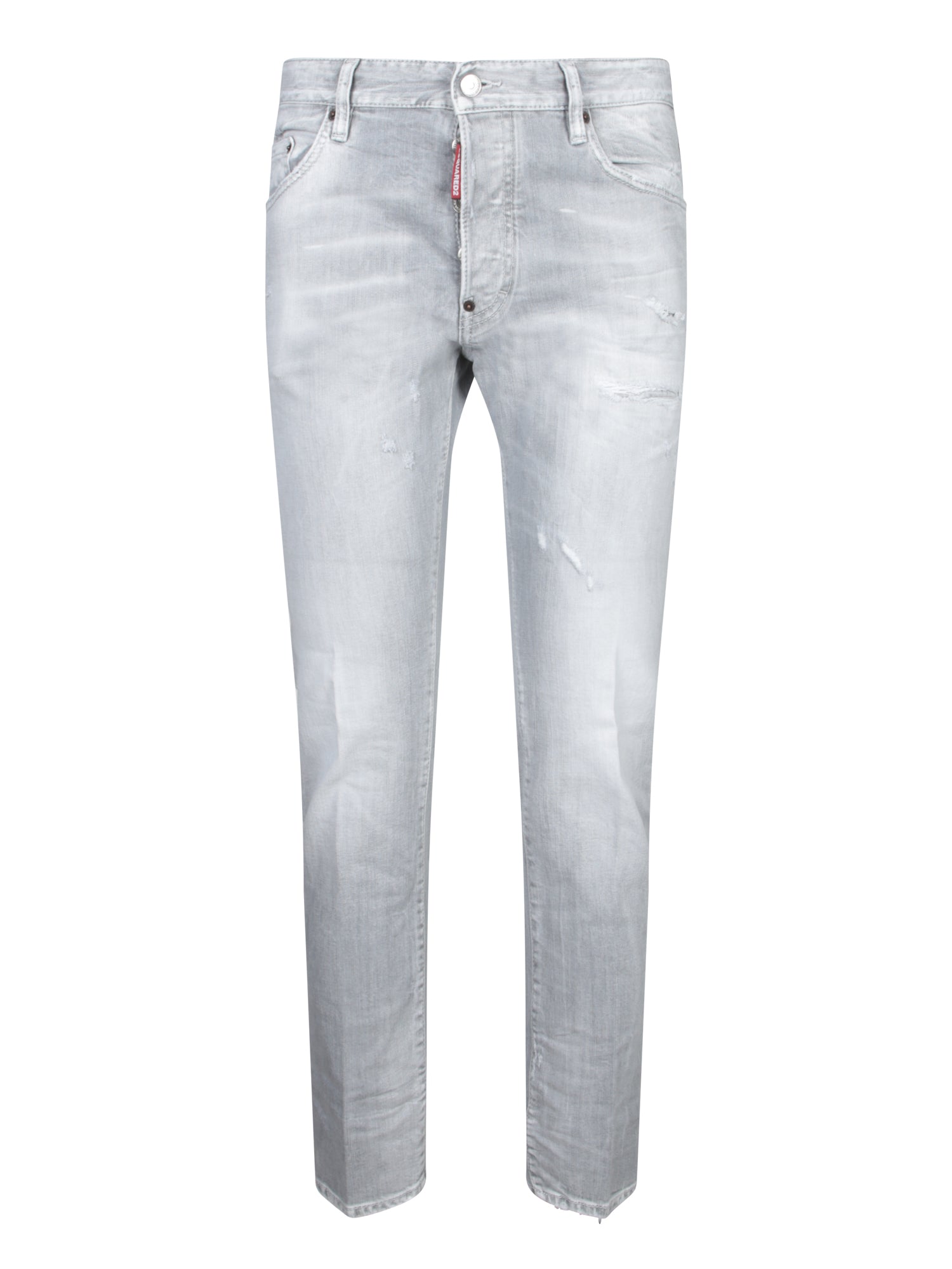 Faded light grey jeans. Five-pocket style. Distressed and worn details.