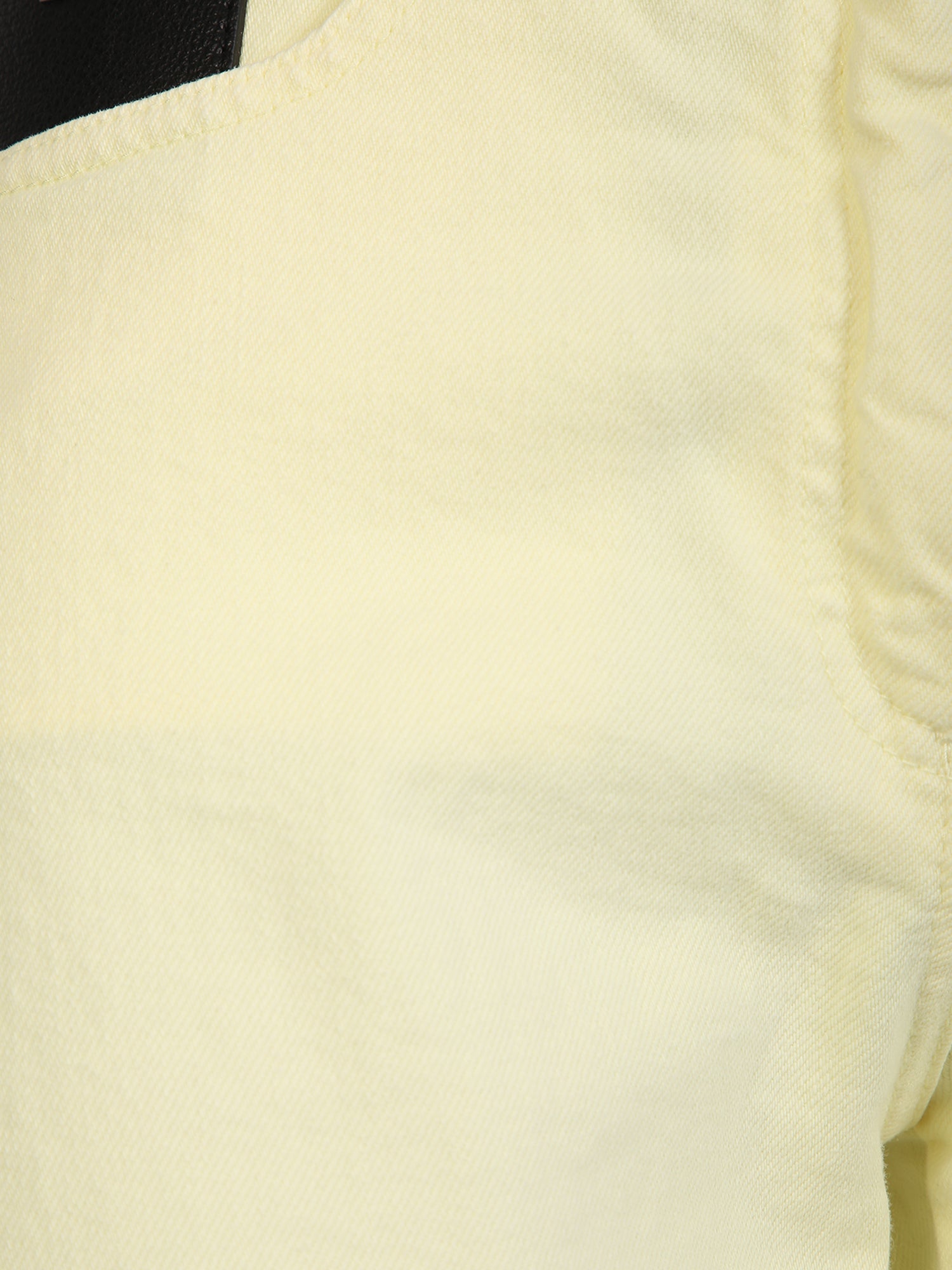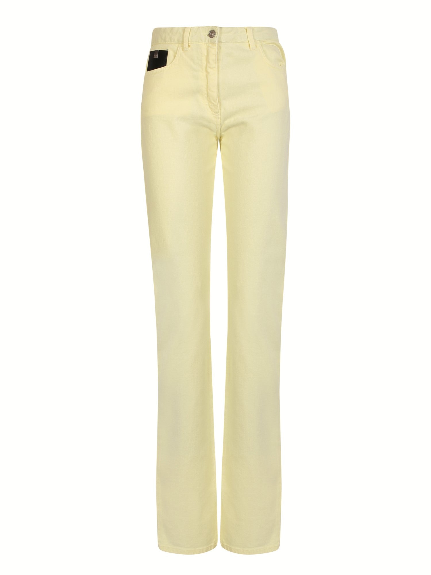 High rise. Belt loops. Button and zip fastening. Classic five pockets. Skinny cut. Metal detail on the pocket. Silver tone hardware. Stretch design. Color: light yellow
