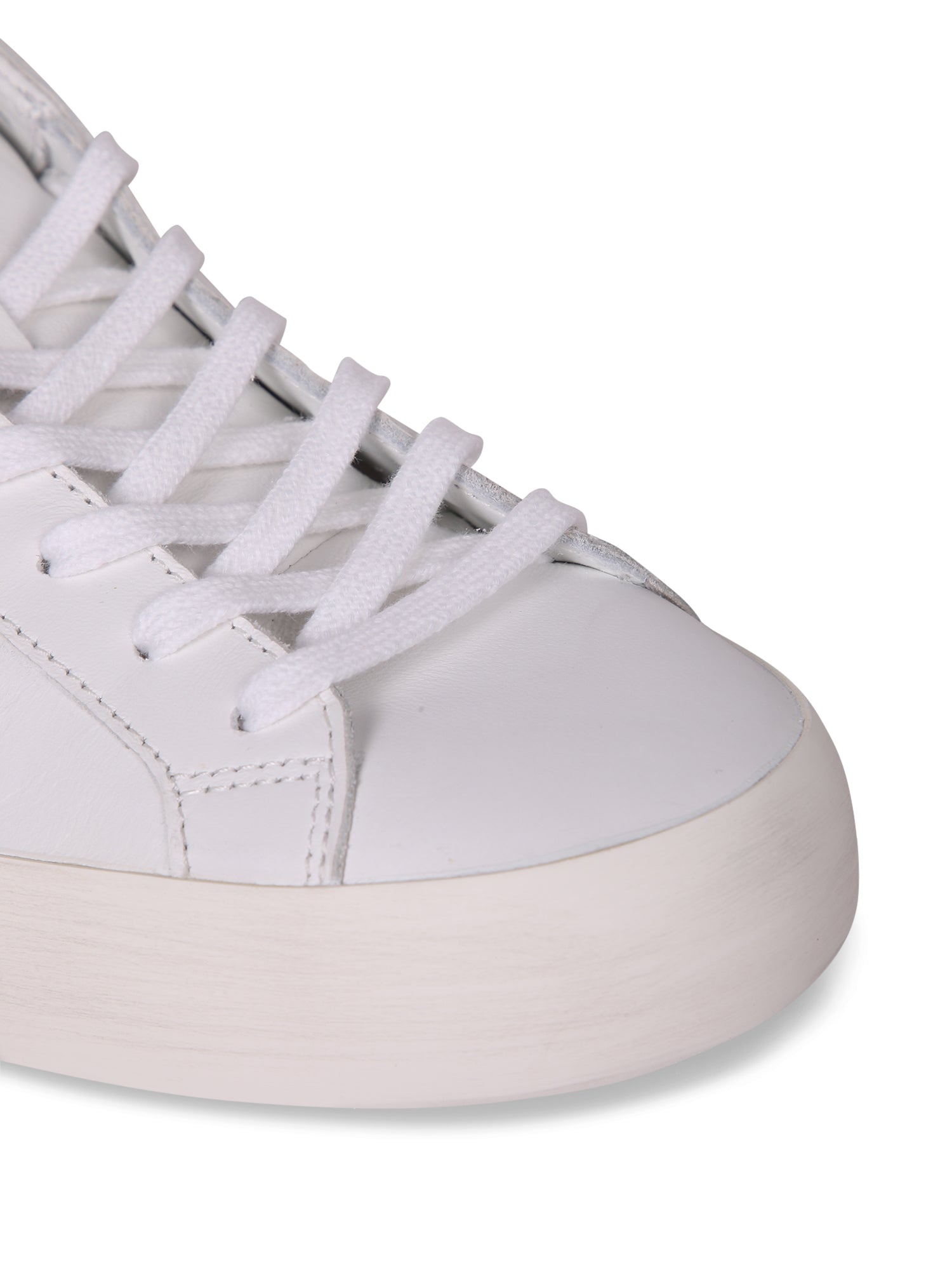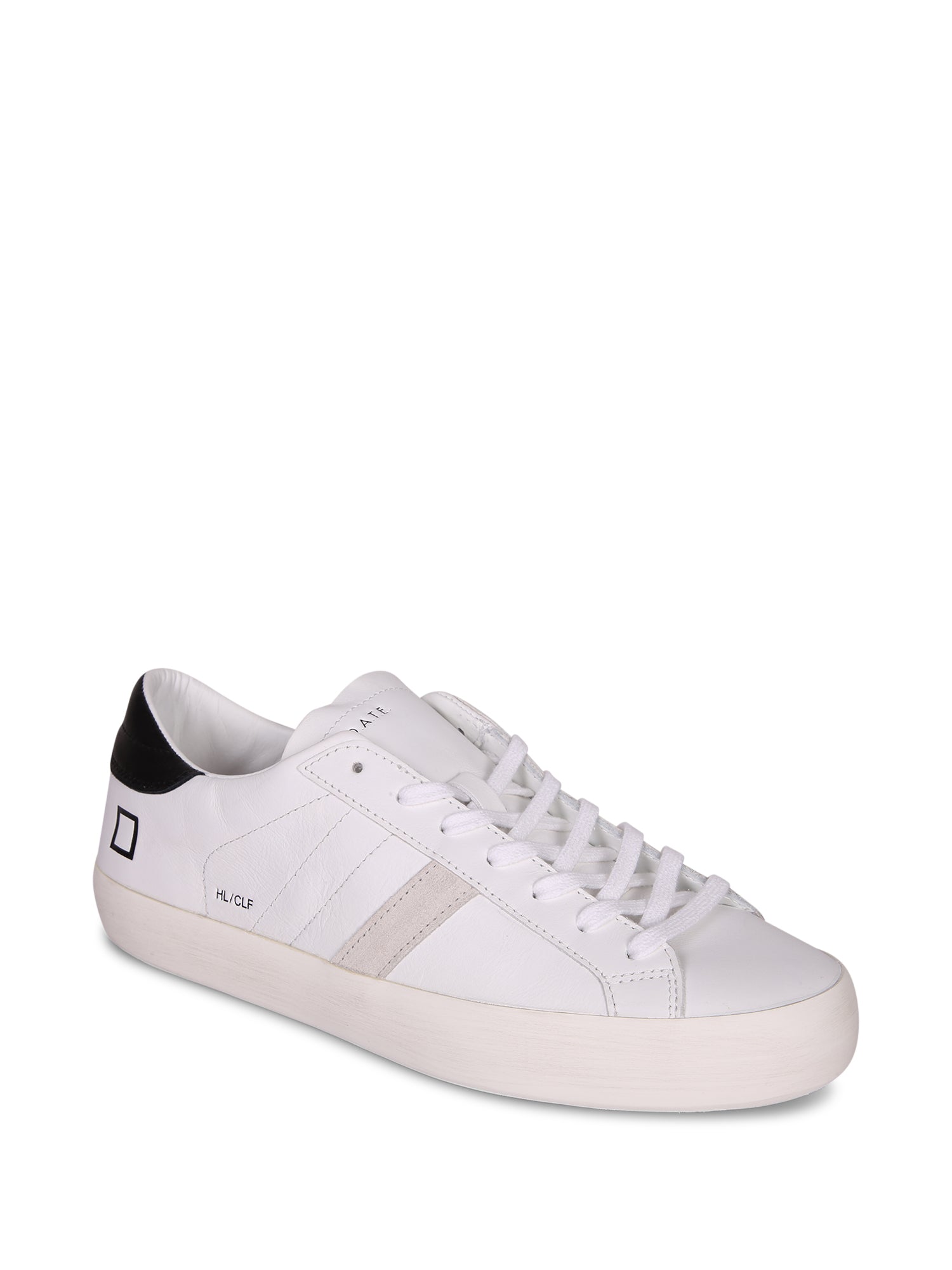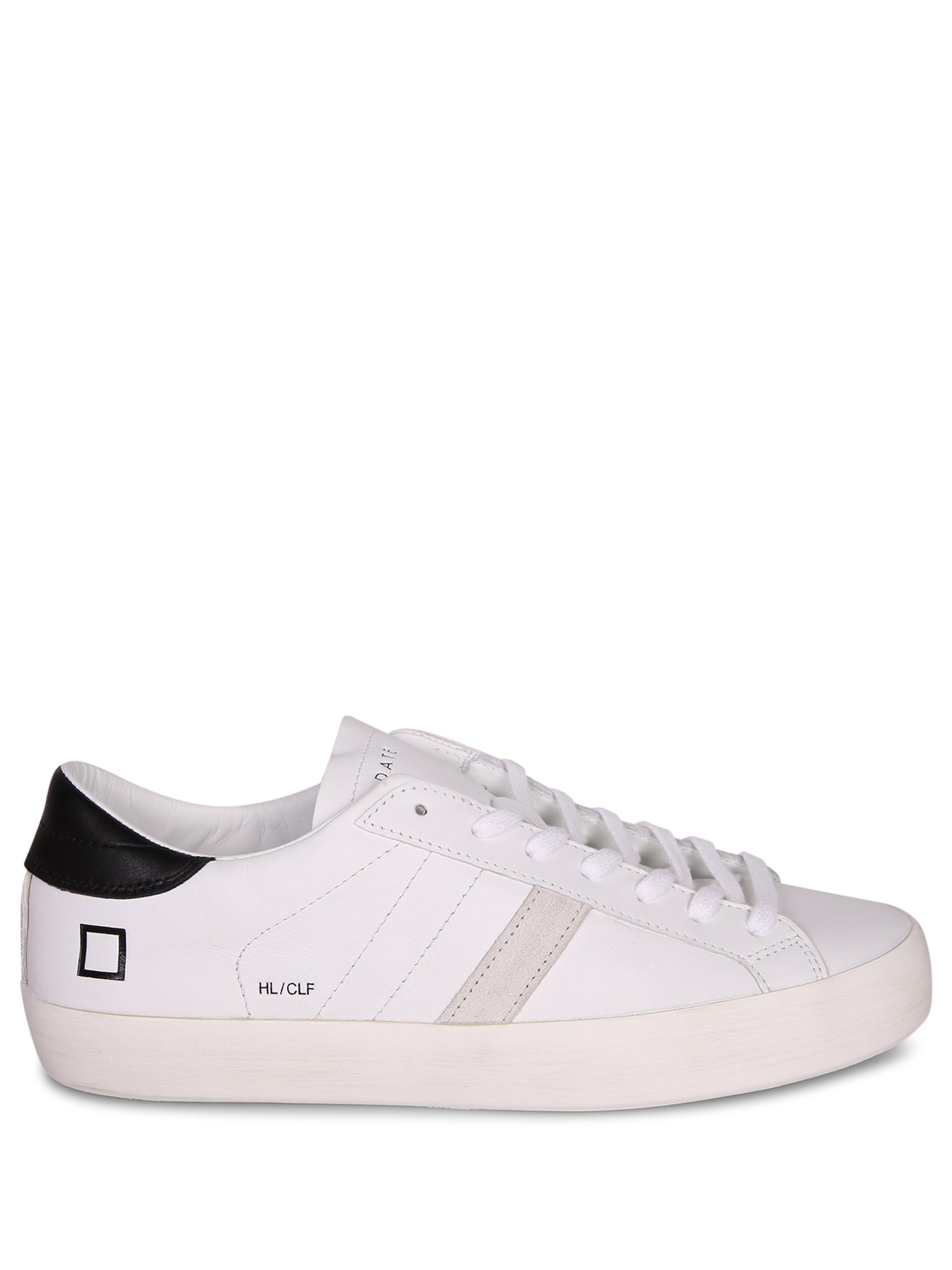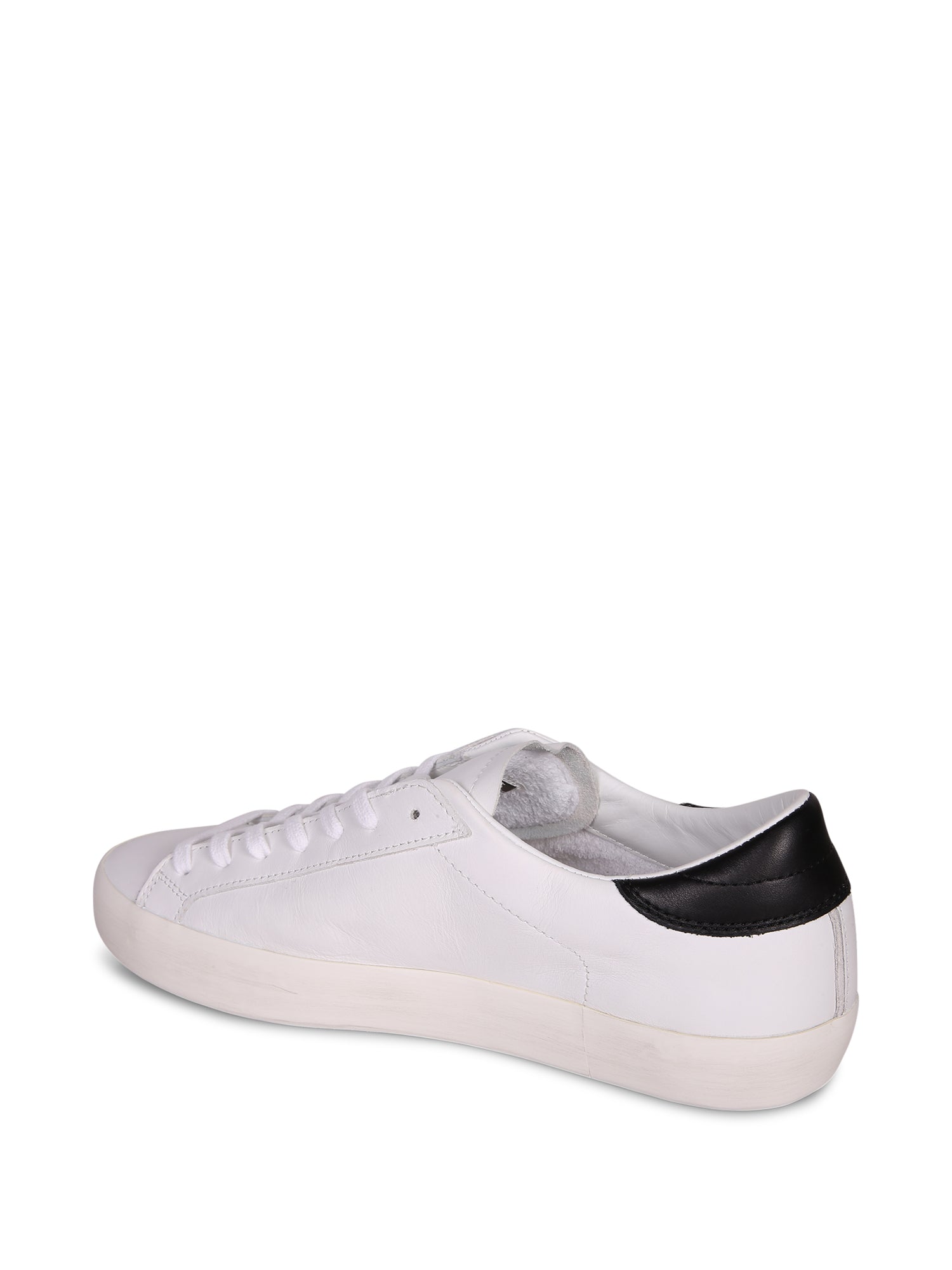 Low-top leather sneakers in white with black accents. Round toe, lace-up closure.