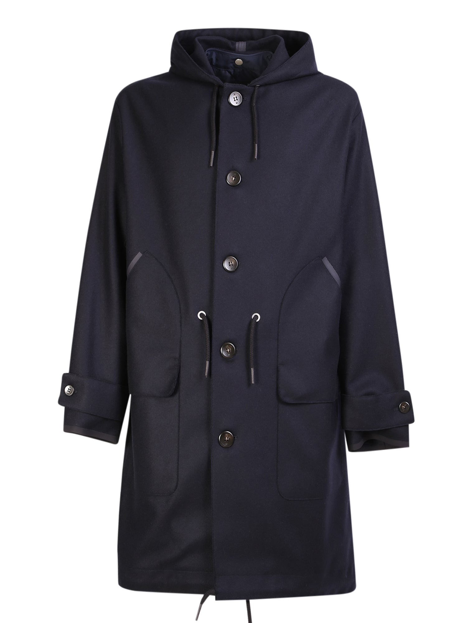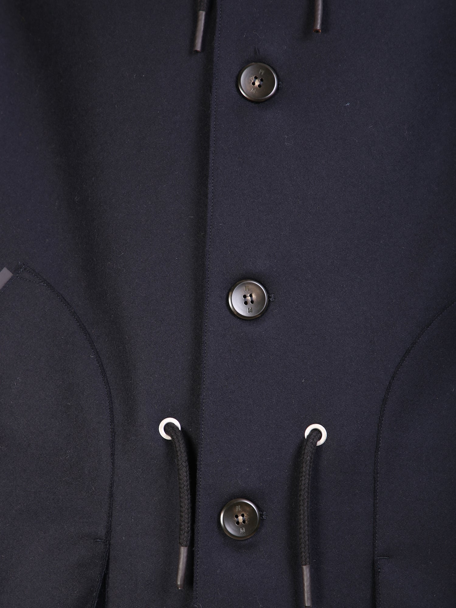 Drawstring hood. Long sleeves. Drawstring waist. Front button fastening. Two side patch pockets. Button cuffs. Drawstring edge. Central air vent on the rear. Color: blue