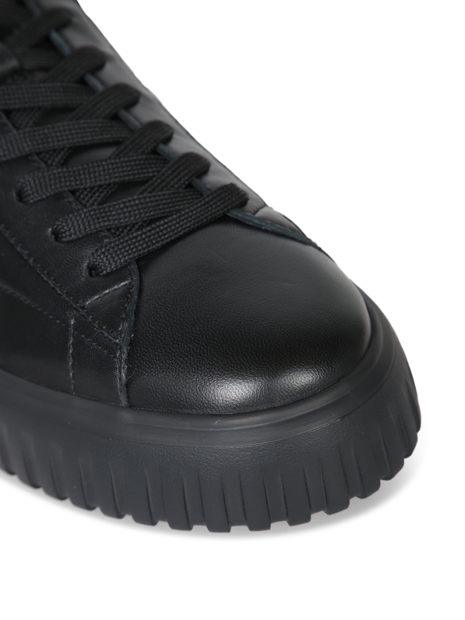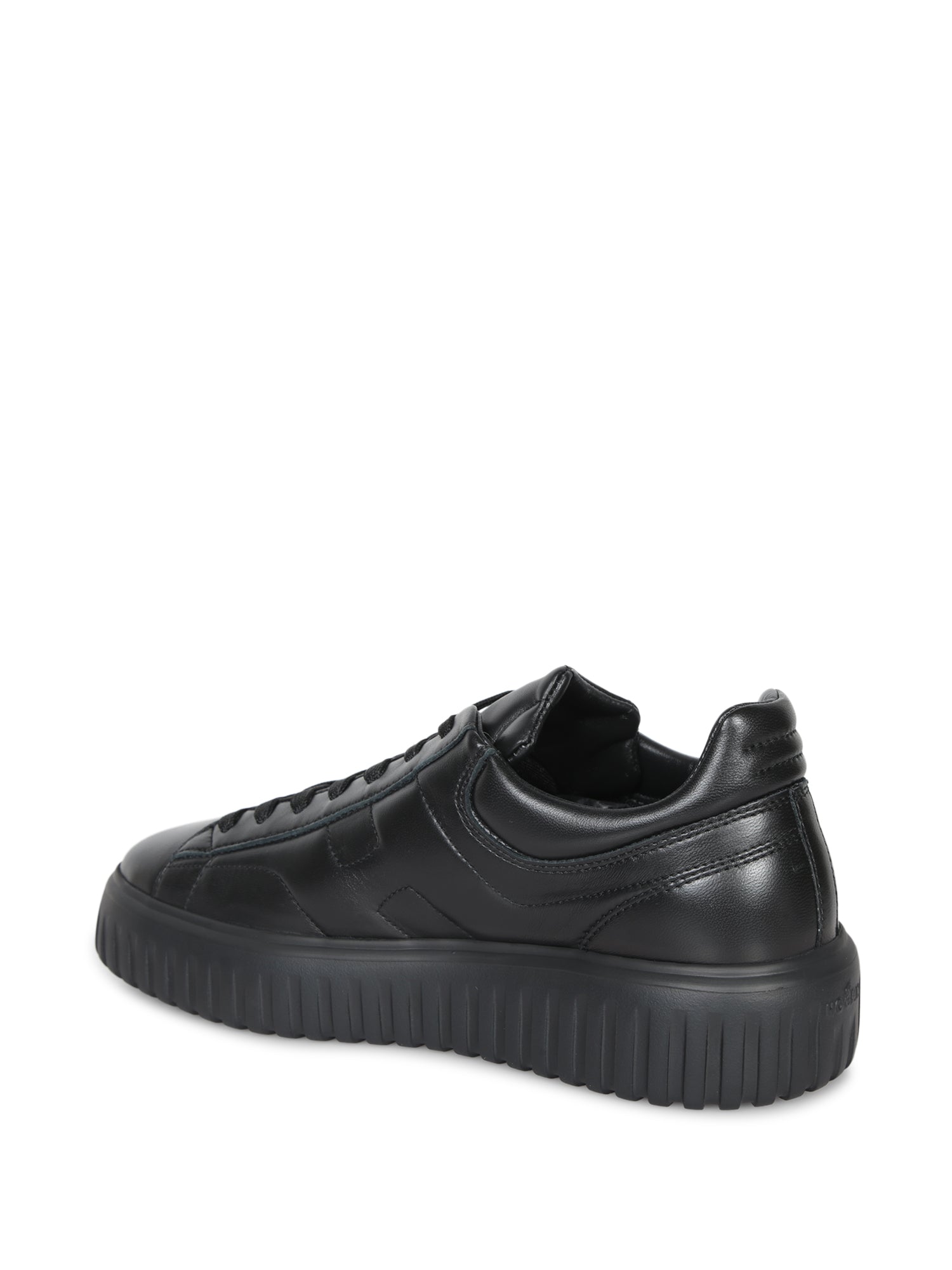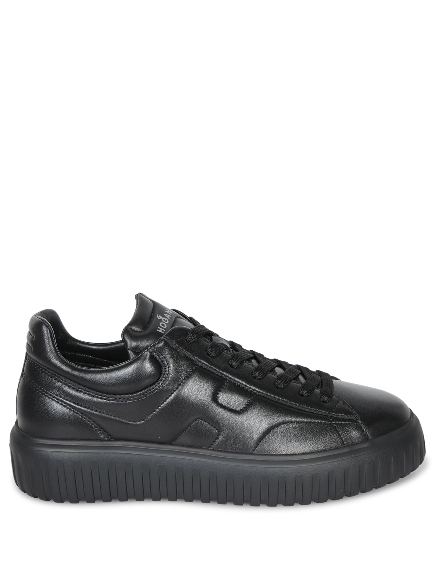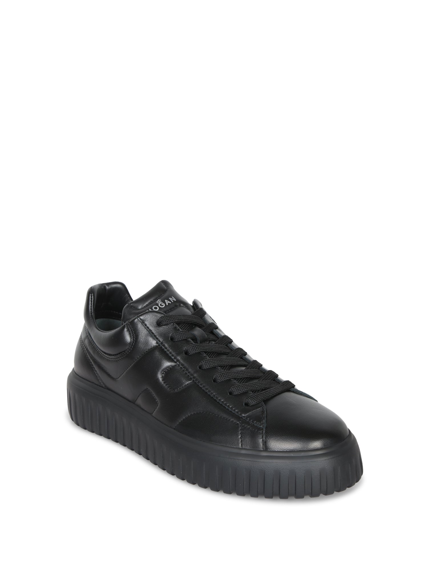 Black leather sneakers. Hogan Hstripes logo design. Raised rubber sole.