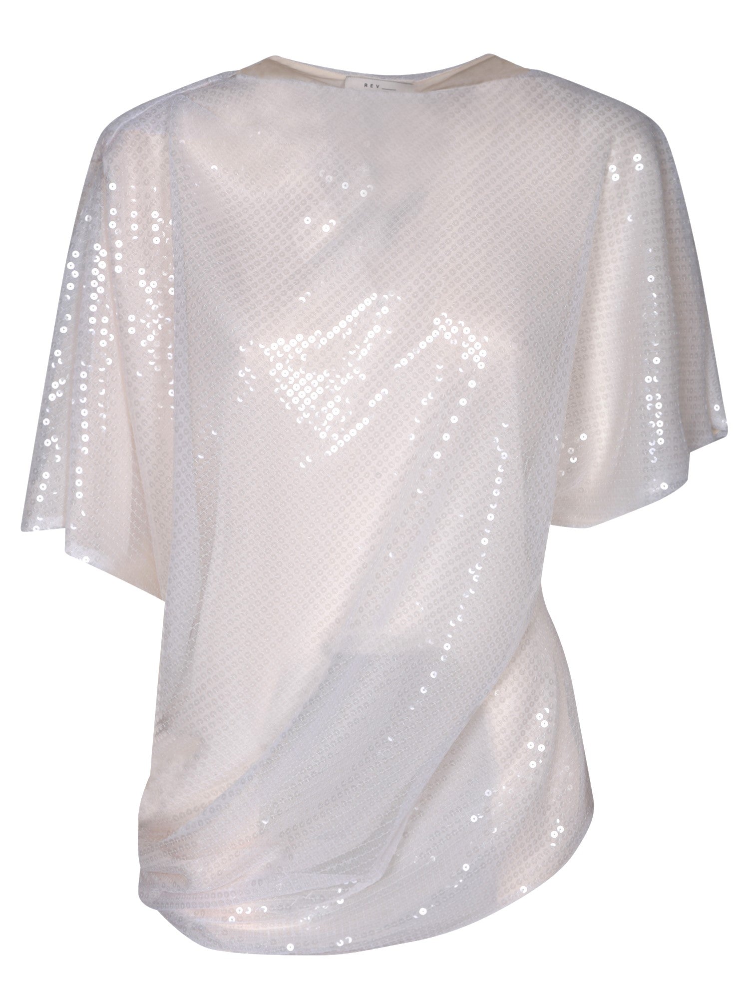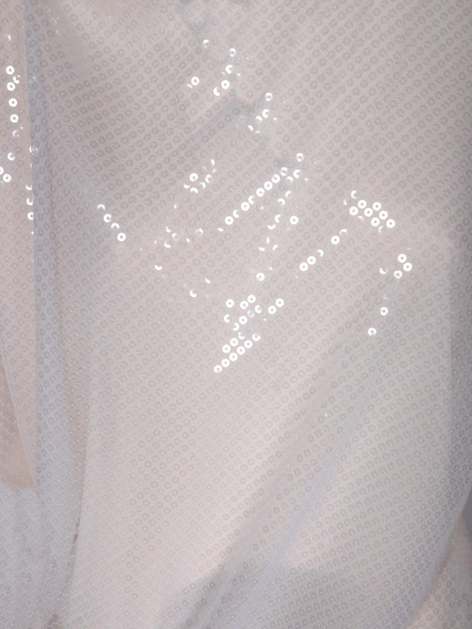 Short-sleeved top made from a sheer fabric adorned with sequins. Features a lightweight finish and a boat neckline.