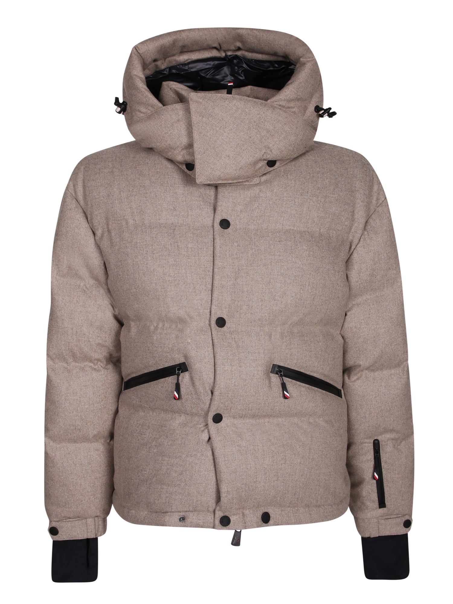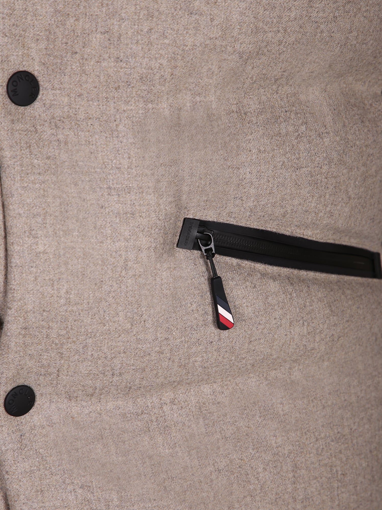 Mixed wool technical fabric exterior. High collar with hood. Snap button front closure. Side zip pockets.